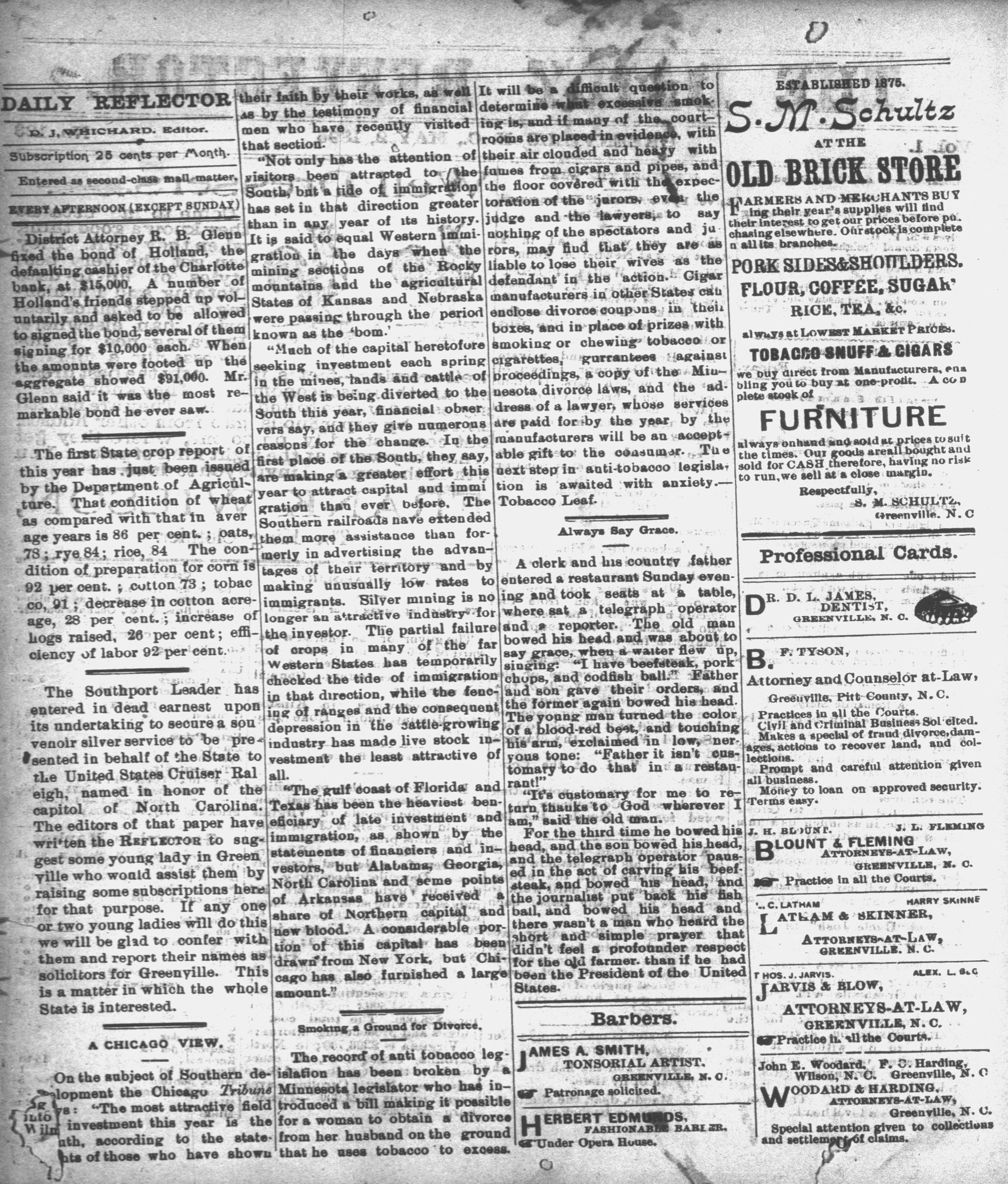 The newspaper was established in 1882, and was originally named the Eastern Reflector. It was founded by Julian Whichard and David Jordan with equipment they purchased from The Greenville Express. On December 10, 1894, it adopted the name The Reflector and began publishing every day. Cox Newspapers acquired The Daily Reflector in 1996. Creator: Daily Reflector (Greenville, N.C.) - May 2, 1895