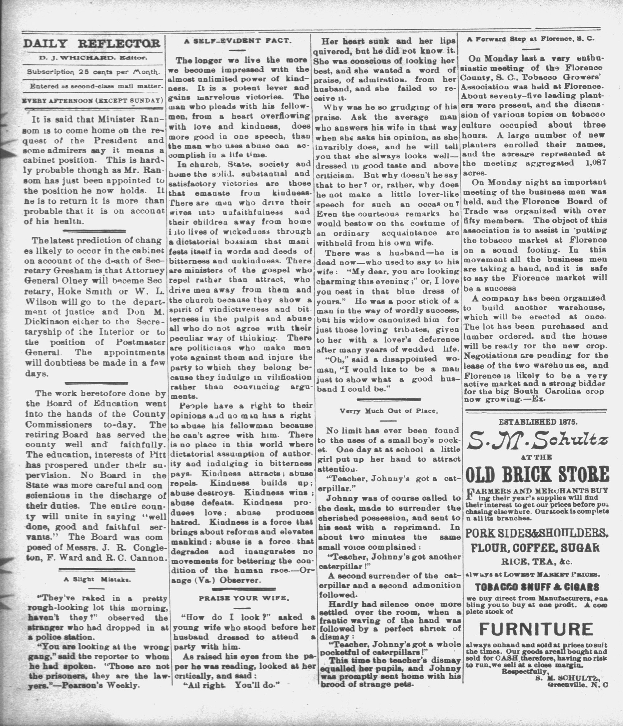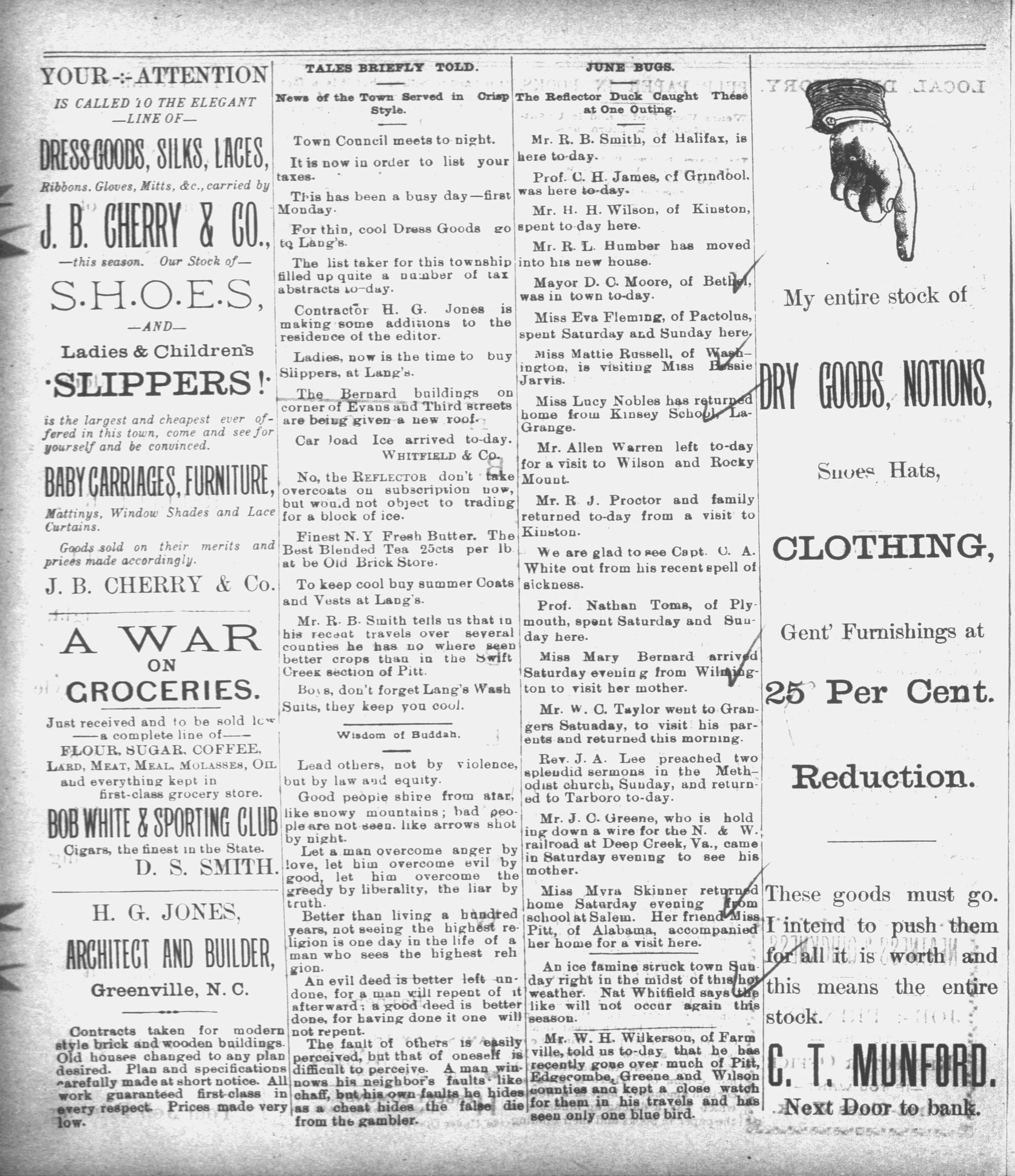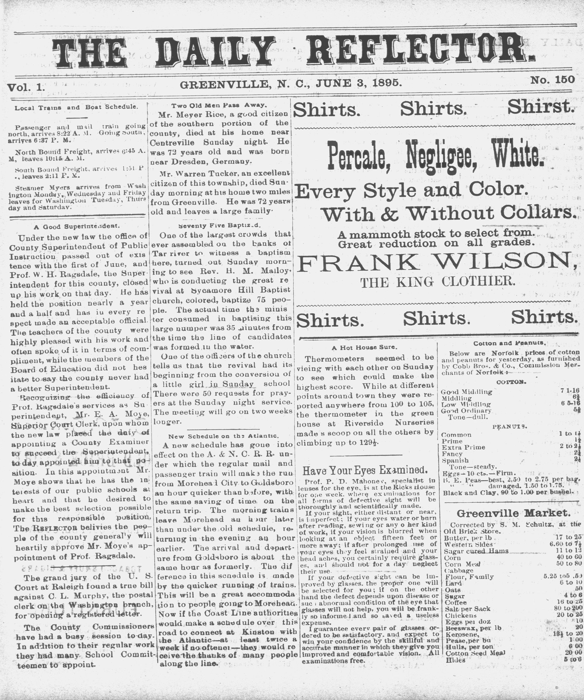 The newspaper was established in 1882, and was originally named the Eastern Reflector. It was founded by Julian Whichard and David Jordan with equipment they purchased from The Greenville Express. On December 10, 1894, it adopted the name The Reflector and began publishing every day. Cox Newspapers acquired The Daily Reflector in 1996. Creator: Daily Reflector (Greenville, N.C.) - June 3, 1895