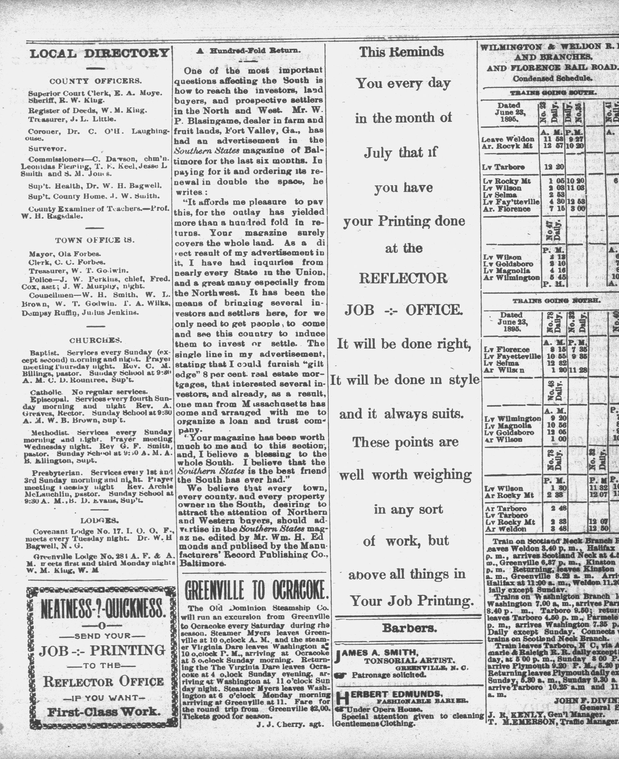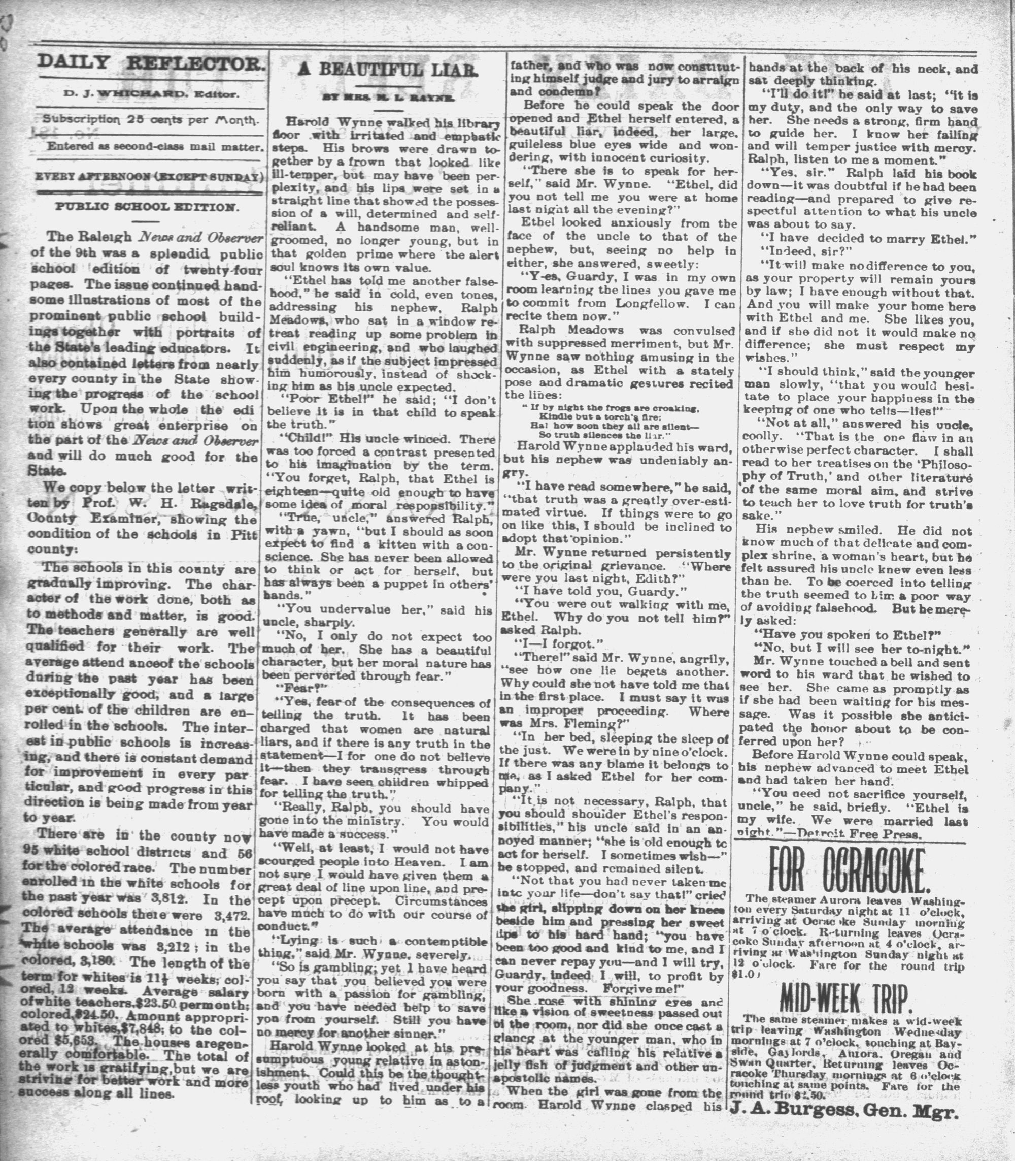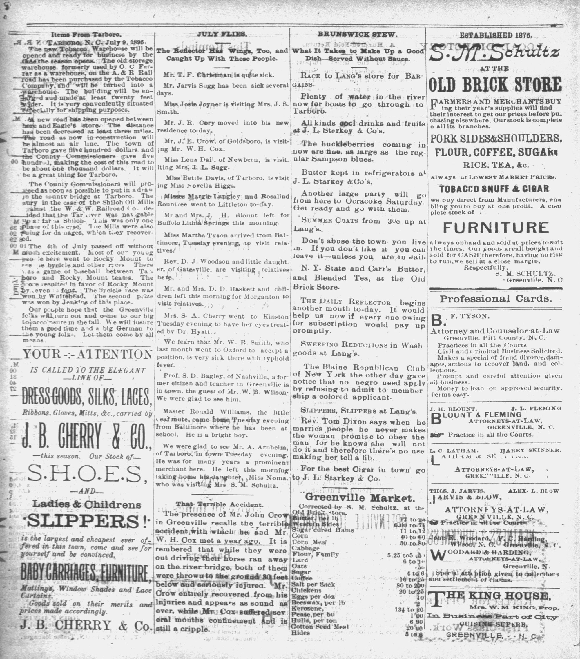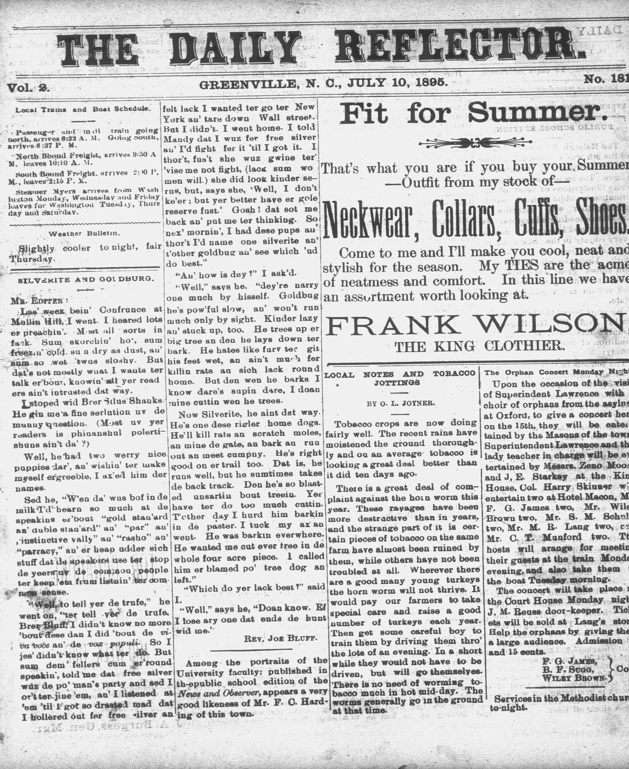 The newspaper was established in 1882, and was originally named the Eastern Reflector. It was founded by Julian Whichard and David Jordan with equipment they purchased from The Greenville Express. On December 10, 1894, it adopted the name The Reflector and began publishing every day. Cox Newspapers acquired The Daily Reflector in 1996. Creator: Daily Reflector (Greenville, N.C.) - July 10, 1895