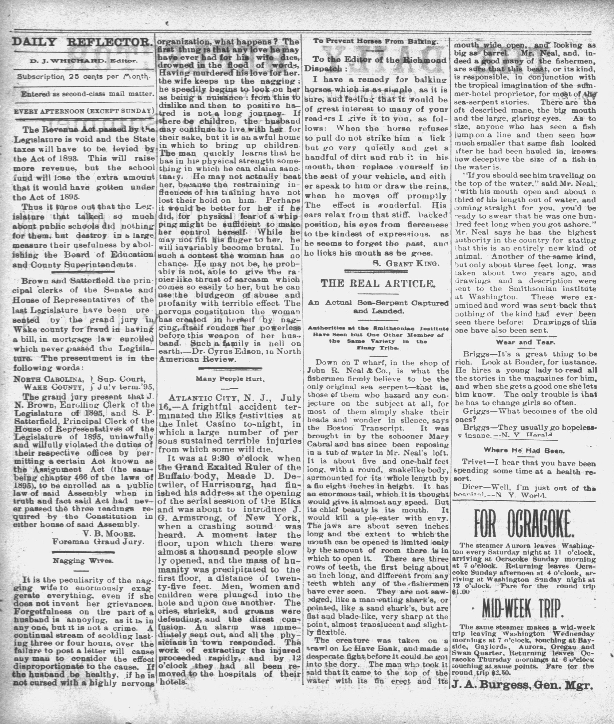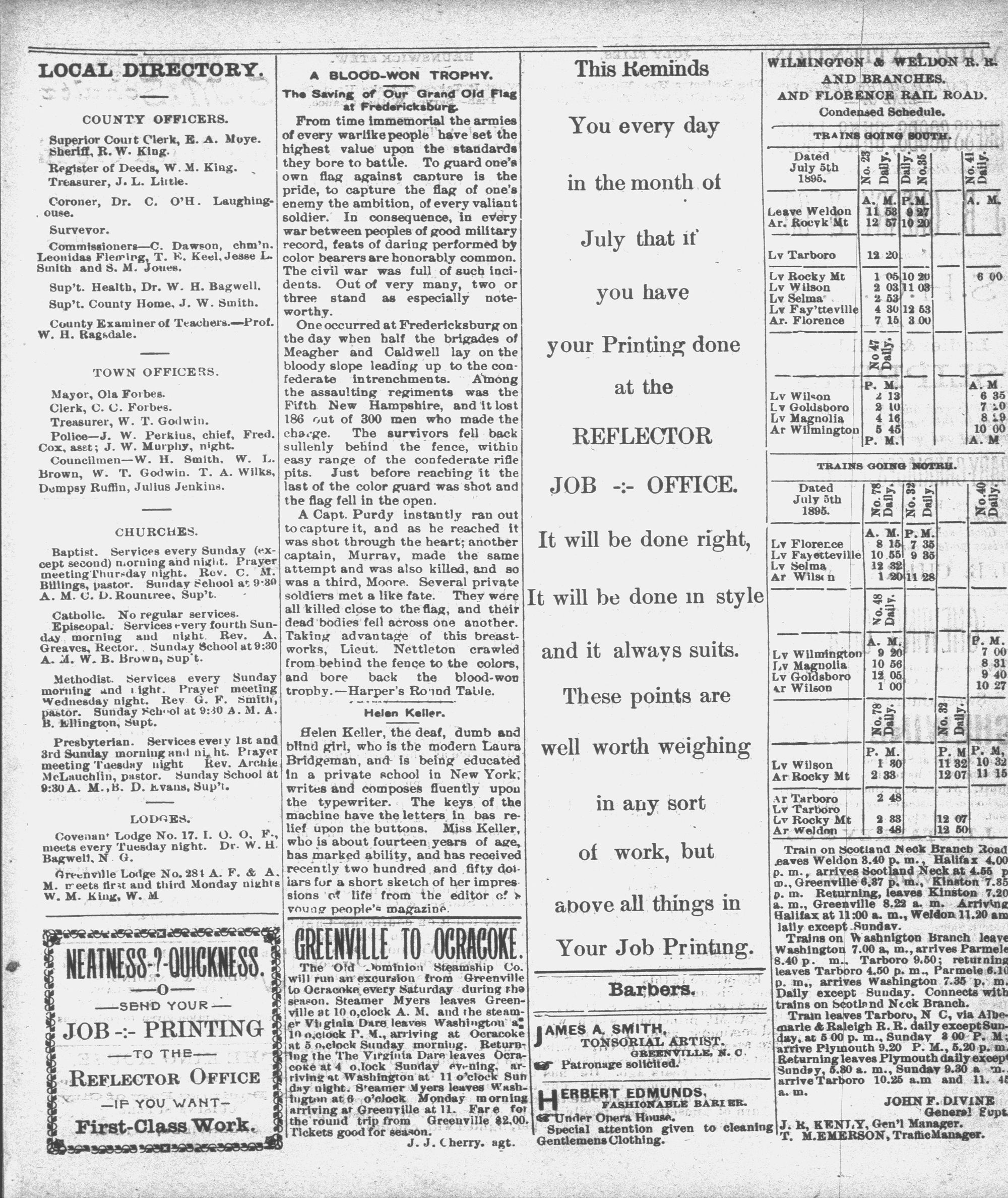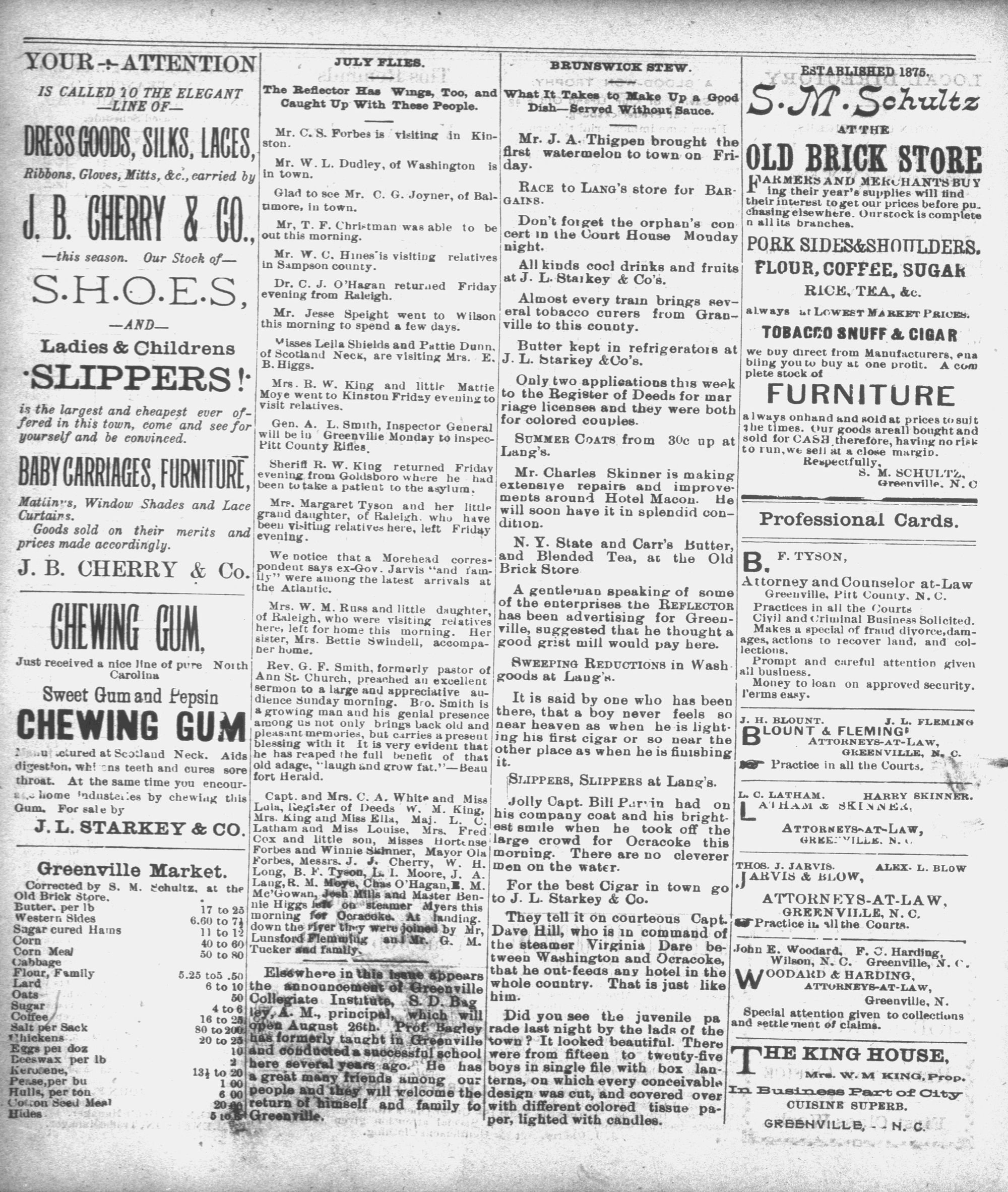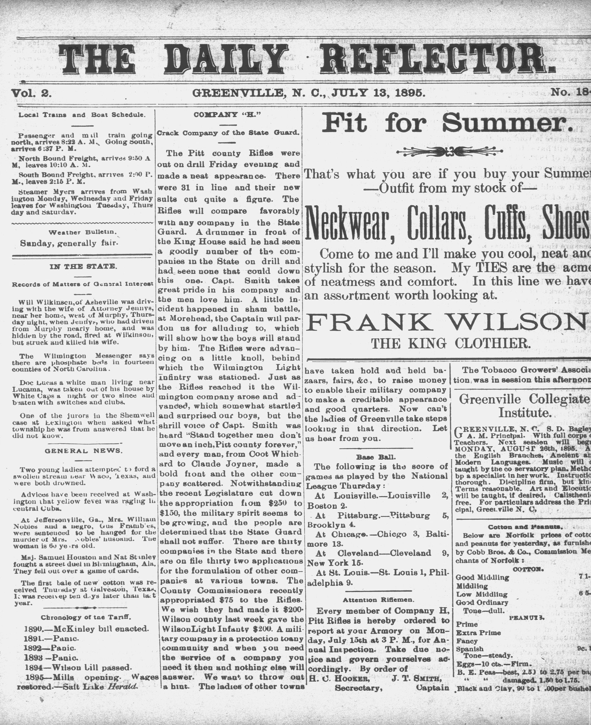 The newspaper was established in 1882, and was originally named the Eastern Reflector. It was founded by Julian Whichard and David Jordan with equipment they purchased from The Greenville Express. On December 10, 1894, it adopted the name The Reflector and began publishing every day. Cox Newspapers acquired The Daily Reflector in 1996. Creator: Daily Reflector (Greenville, N.C.) - July 13, 1895