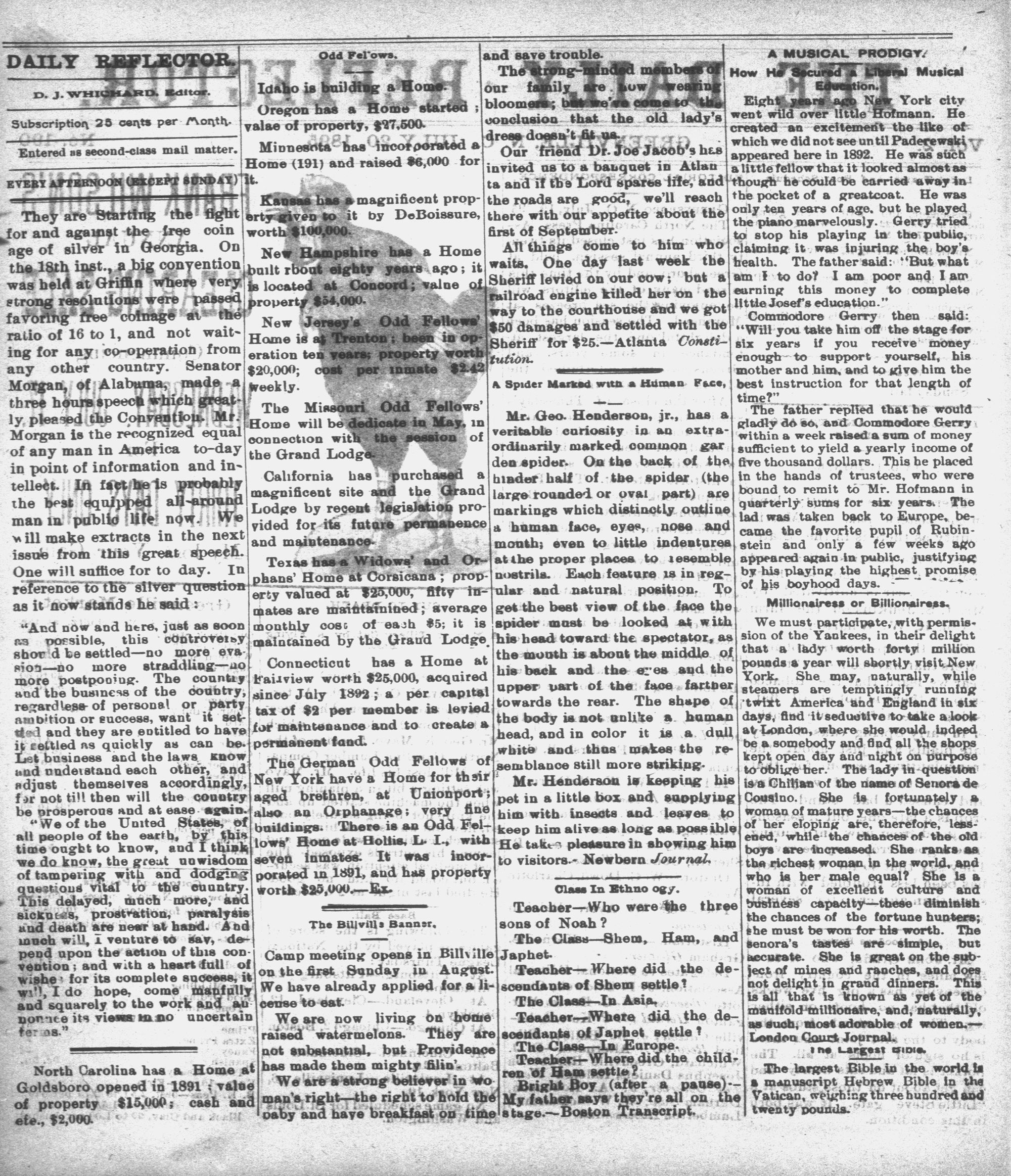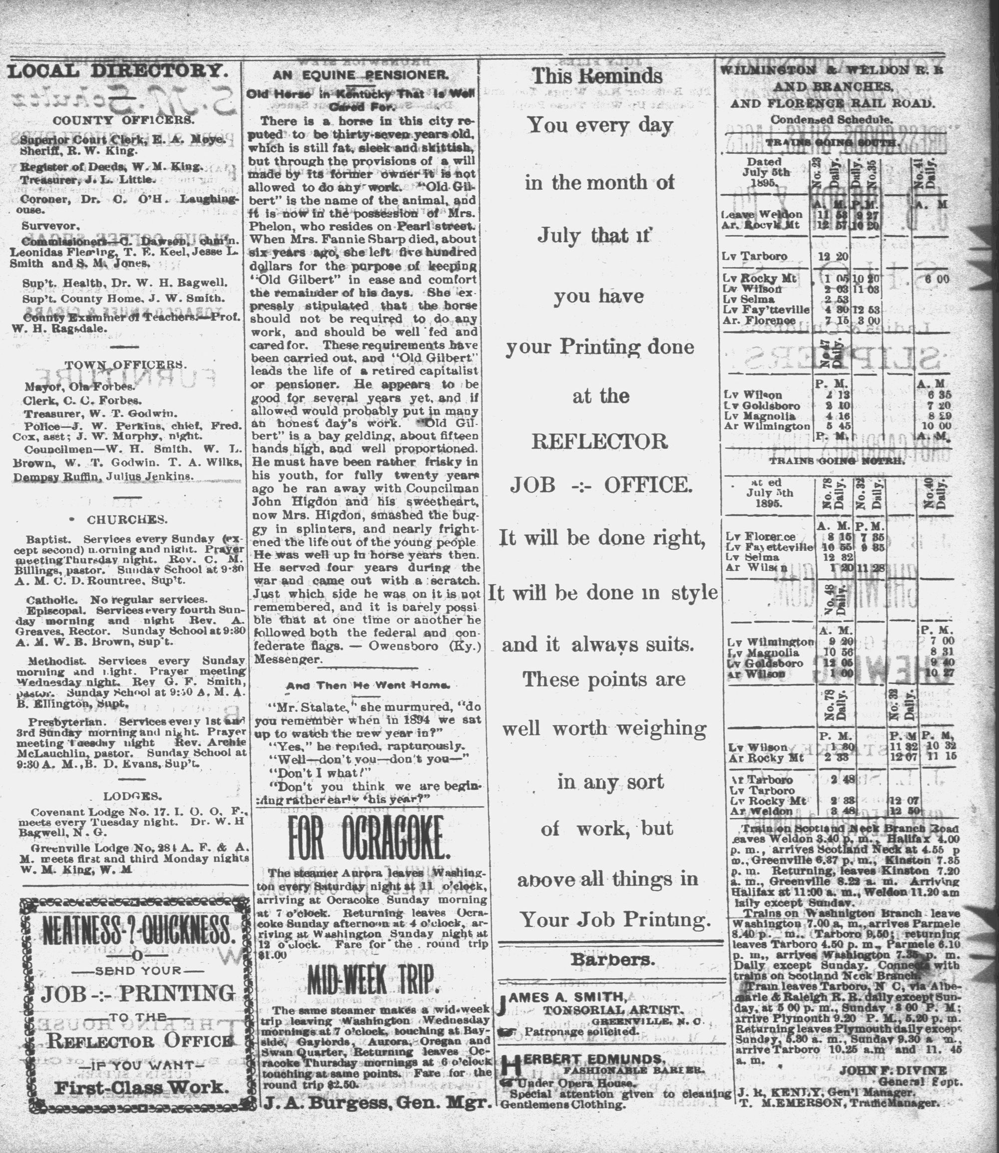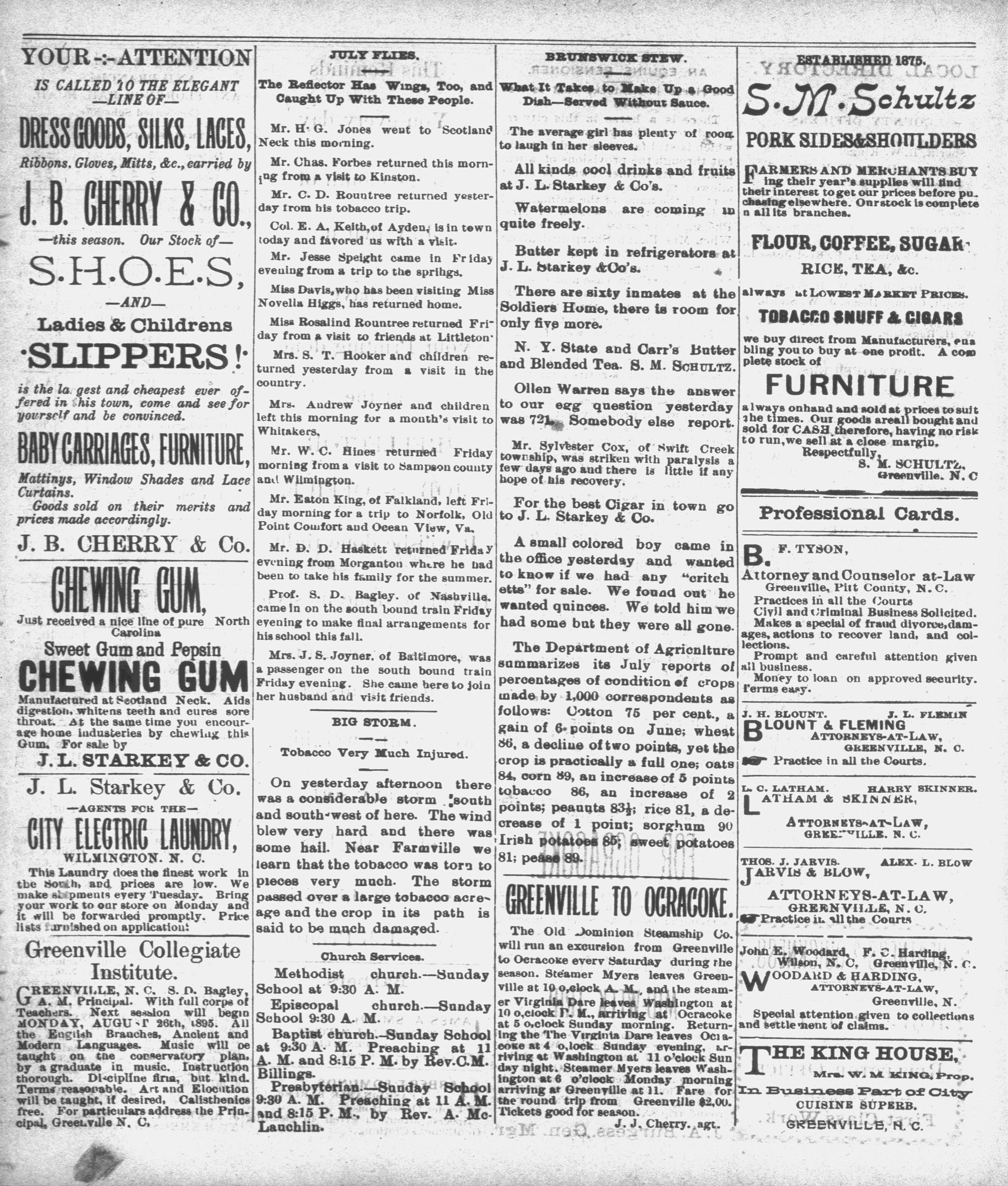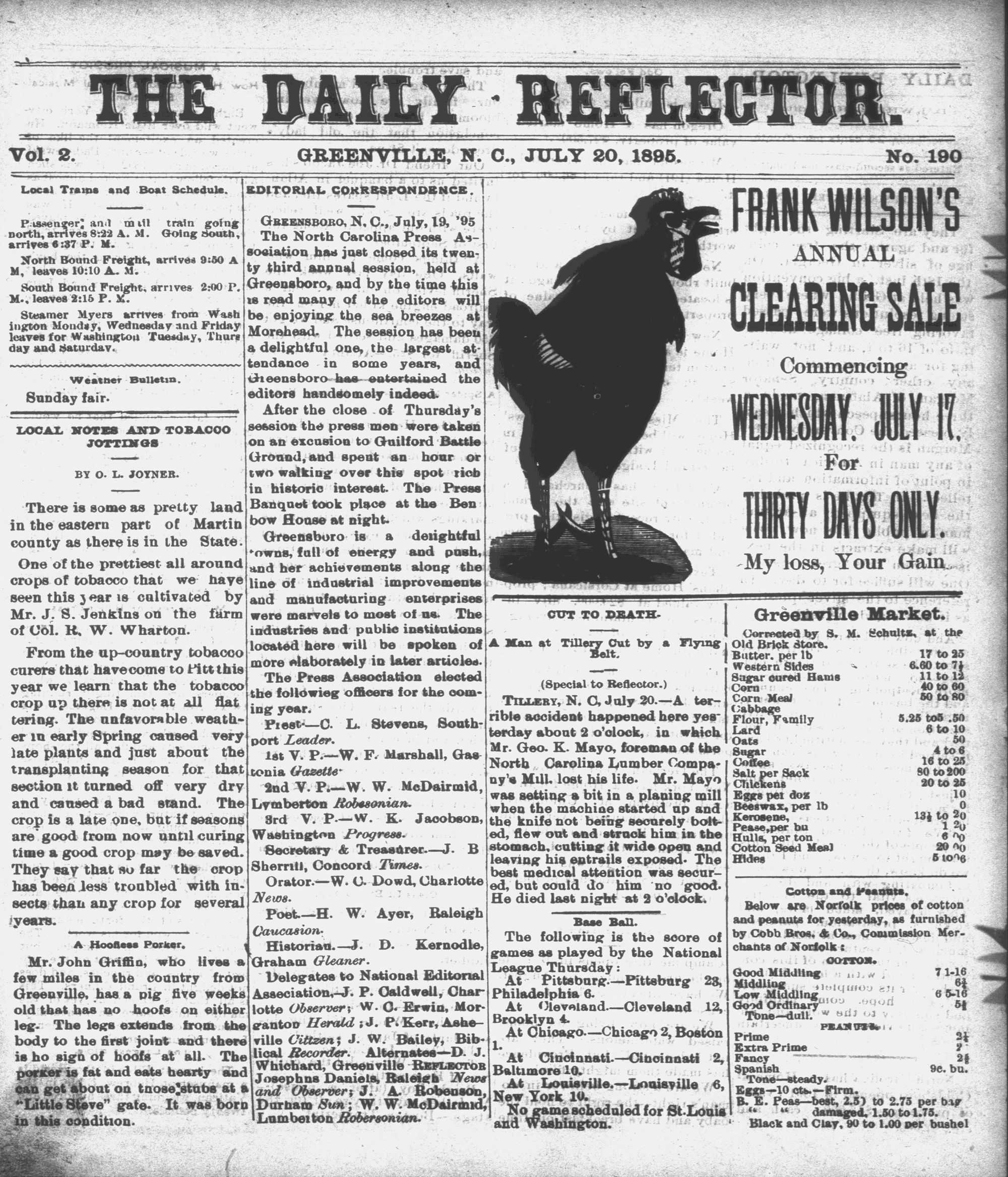 The newspaper was established in 1882, and was originally named the Eastern Reflector. It was founded by Julian Whichard and David Jordan with equipment they purchased from The Greenville Express. On December 10, 1894, it adopted the name The Reflector and began publishing every day. Cox Newspapers acquired The Daily Reflector in 1996. Creator: Daily Reflector (Greenville, N.C.) - July 20, 1895