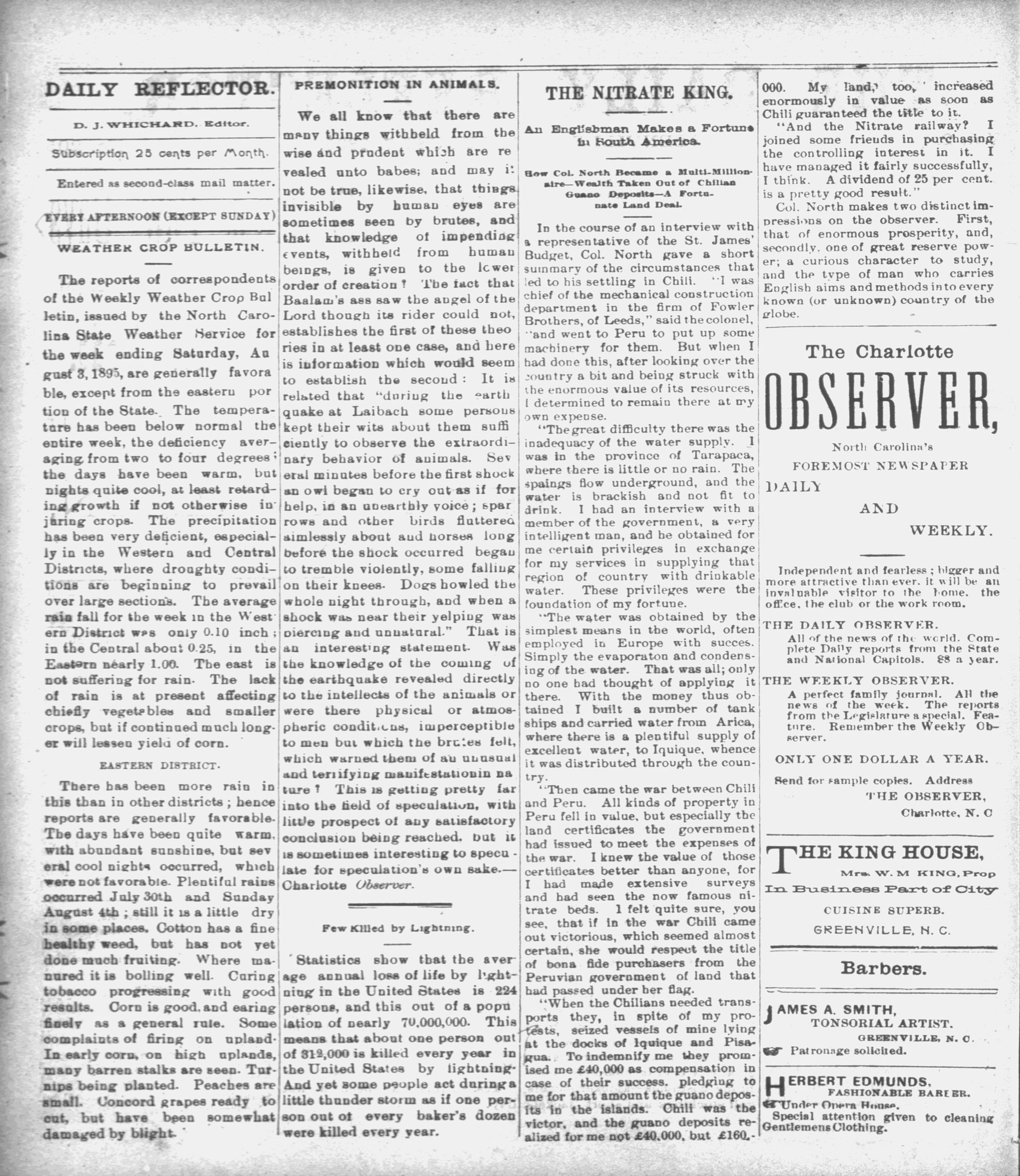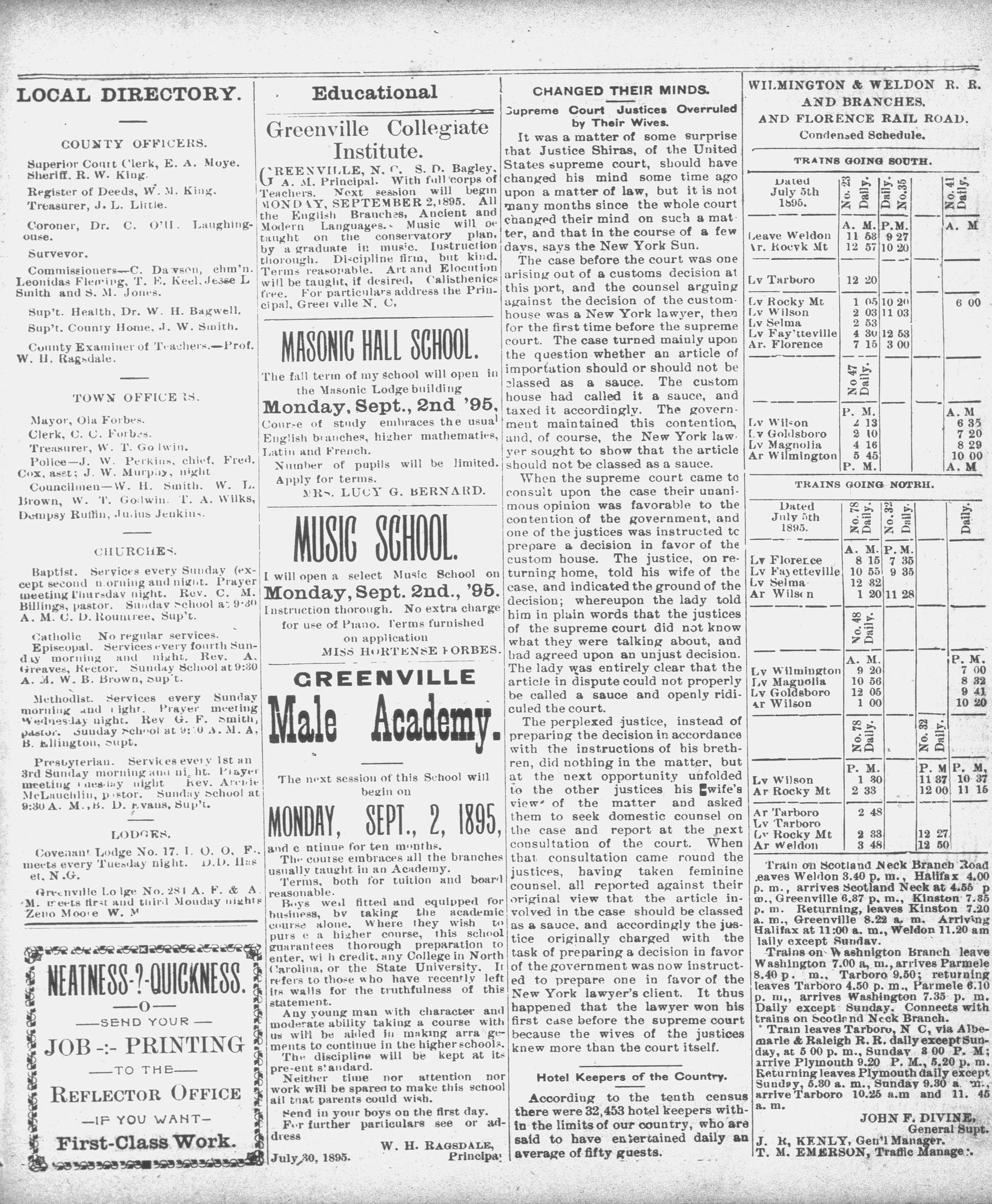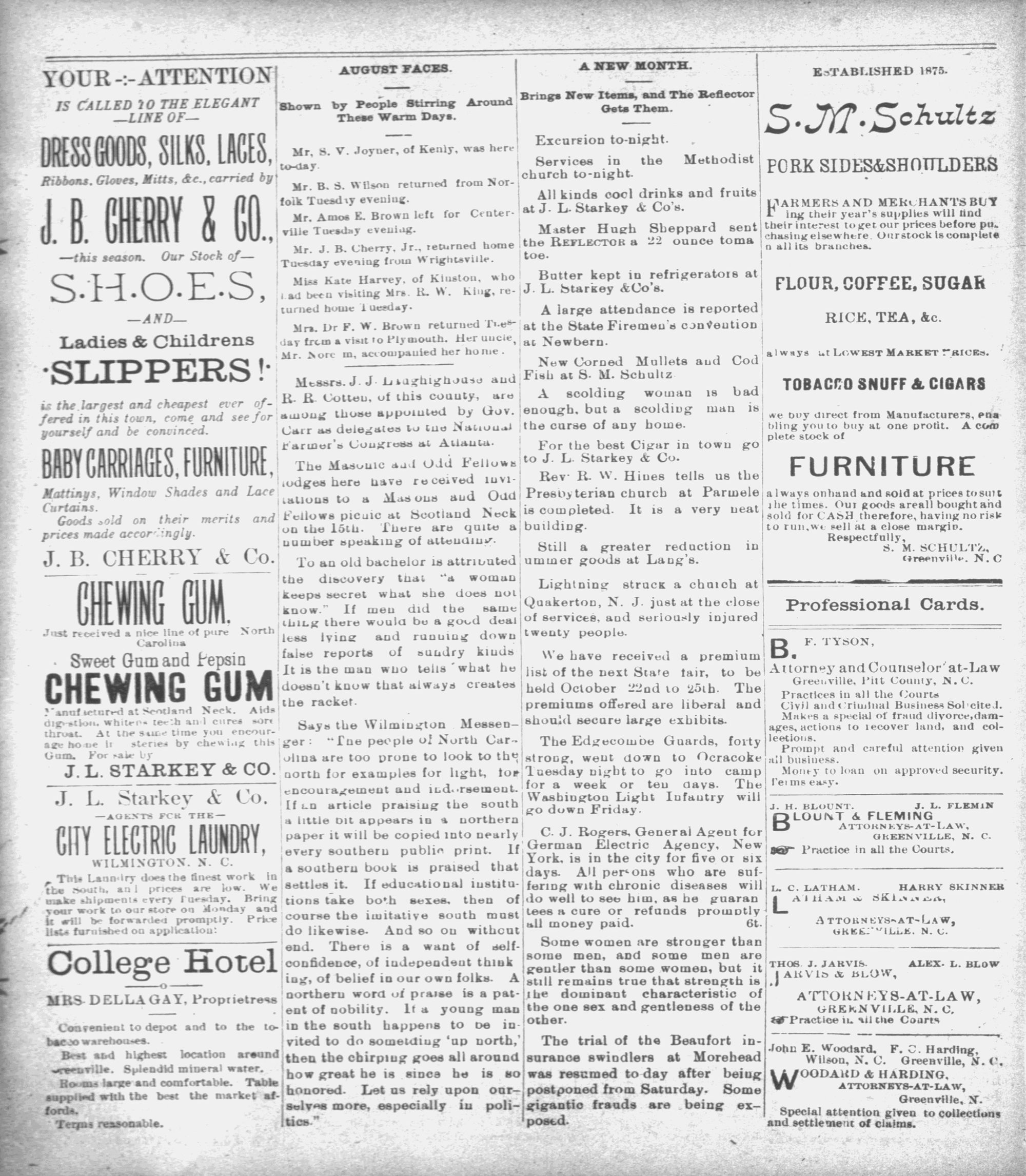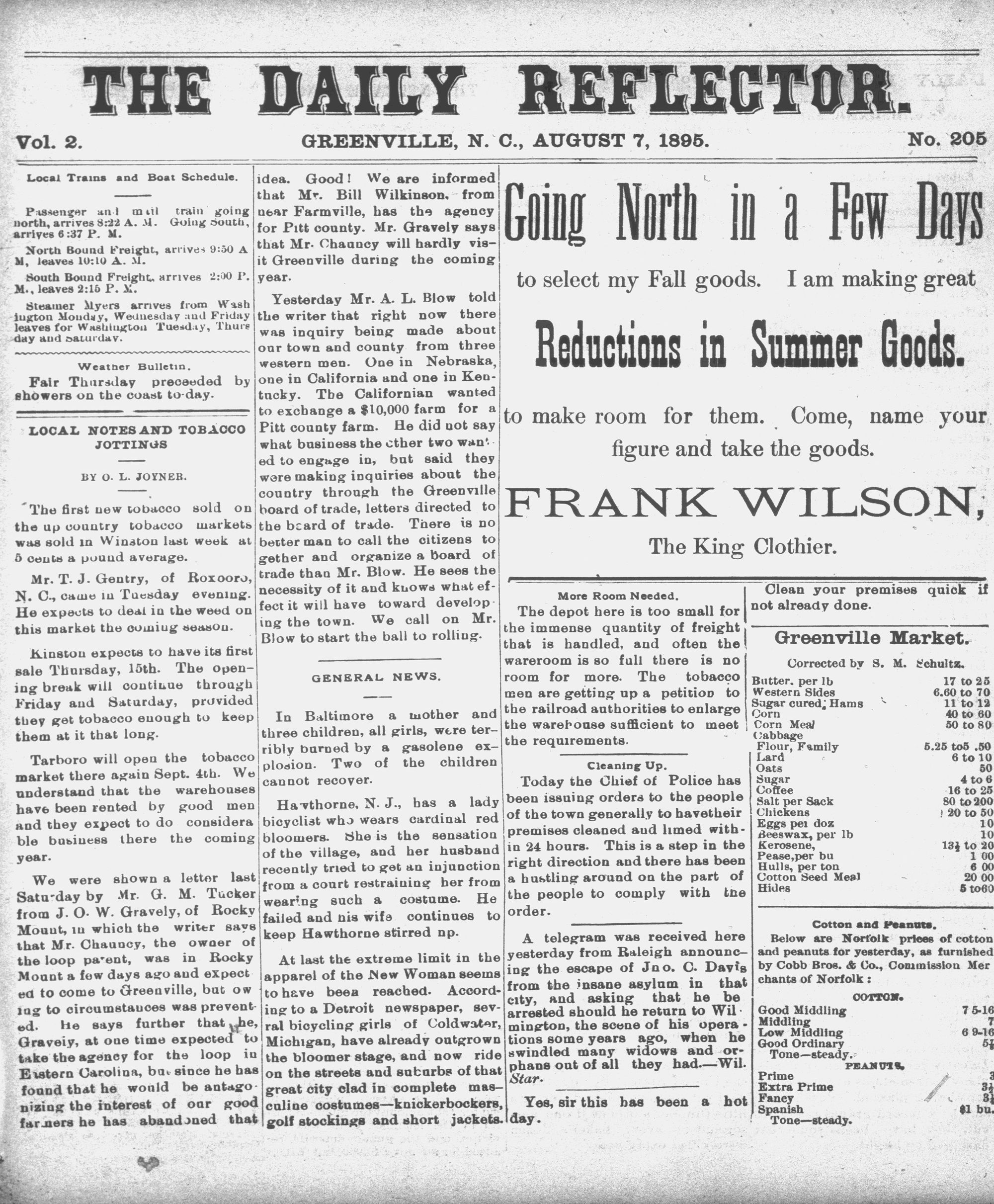 The newspaper was established in 1882, and was originally named the Eastern Reflector. It was founded by Julian Whichard and David Jordan with equipment they purchased from The Greenville Express. On December 10, 1894, it adopted the name The Reflector and began publishing every day. Cox Newspapers acquired The Daily Reflector in 1996. Creator: Daily Reflector (Greenville, N.C.) - August 7, 1895