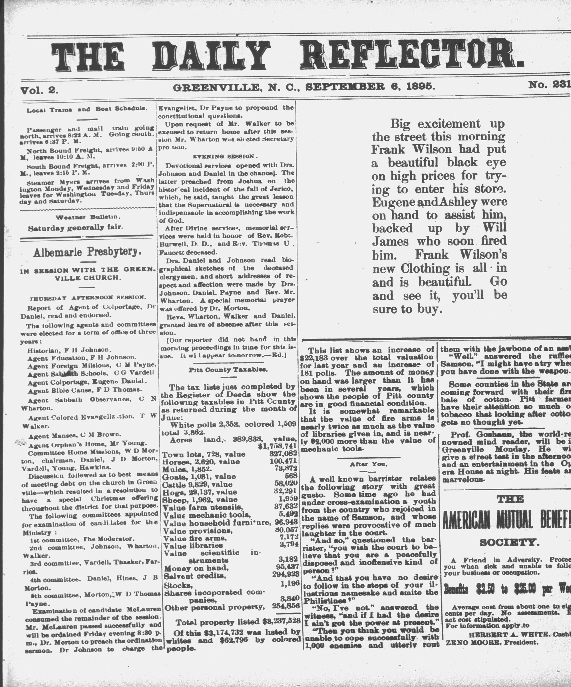 The newspaper was established in 1882, and was originally named the Eastern Reflector. It was founded by Julian Whichard and David Jordan with equipment they purchased from The Greenville Express. On December 10, 1894, it adopted the name The Reflector and began publishing every day. Cox Newspapers acquired The Daily Reflector in 1996. Creator: Daily Reflector (Greenville, N.C.) - September 6, 1895