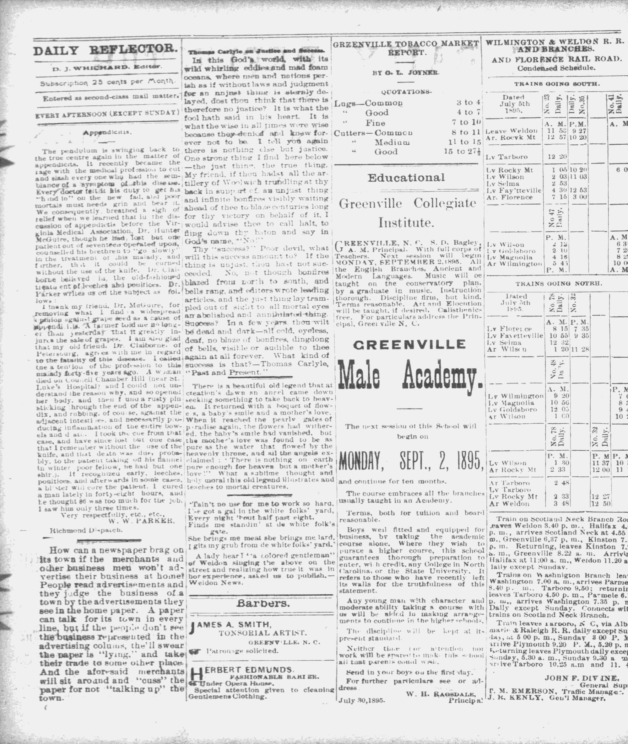The newspaper was established in 1882, and was originally named the Eastern Reflector. It was founded by Julian Whichard and David Jordan with equipment they purchased from The Greenville Express. On December 10, 1894, it adopted the name The Reflector and began publishing every day. Cox Newspapers acquired The Daily Reflector in 1996. Creator: Daily Reflector (Greenville, N.C.) - September 9, 1895