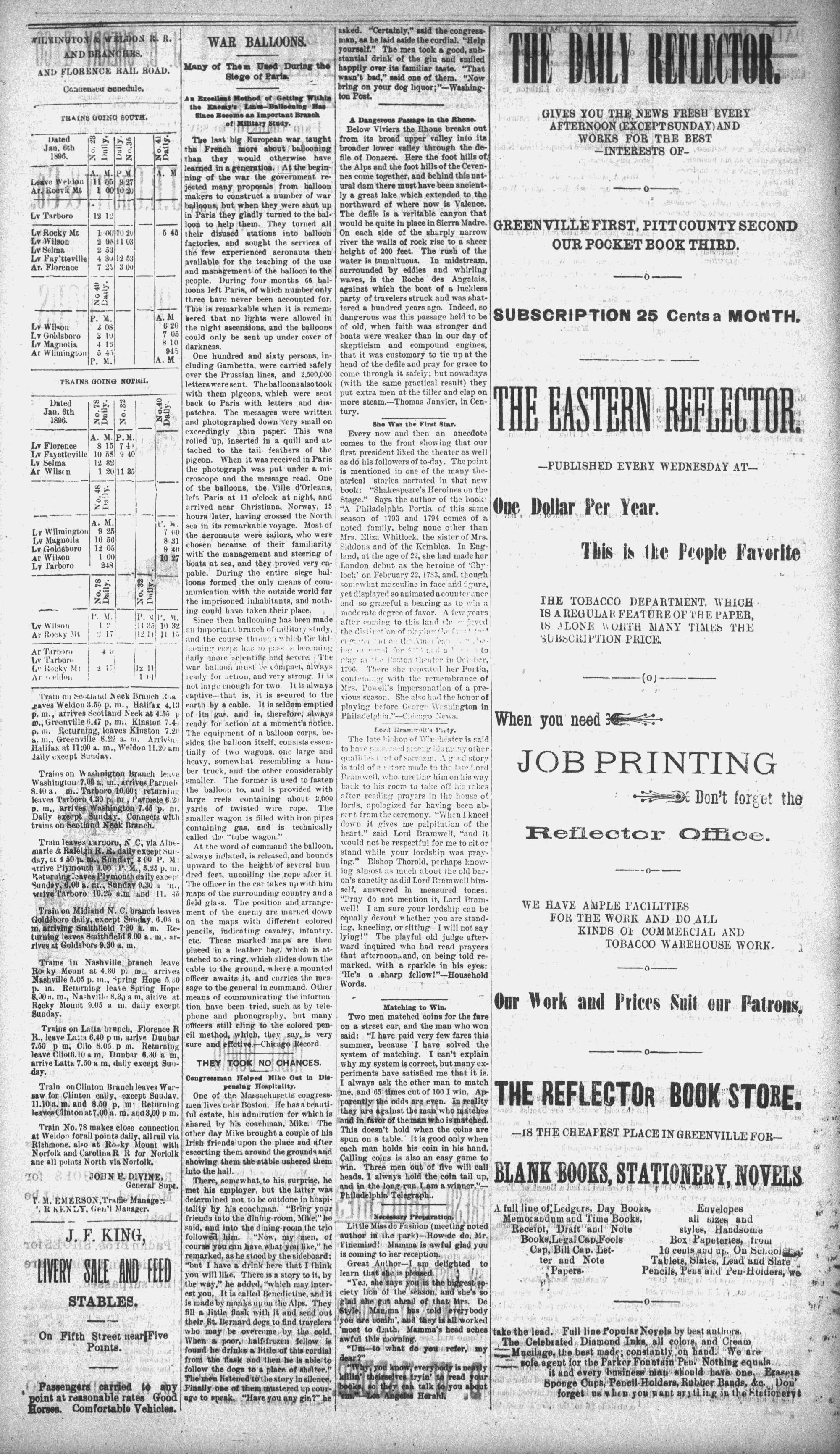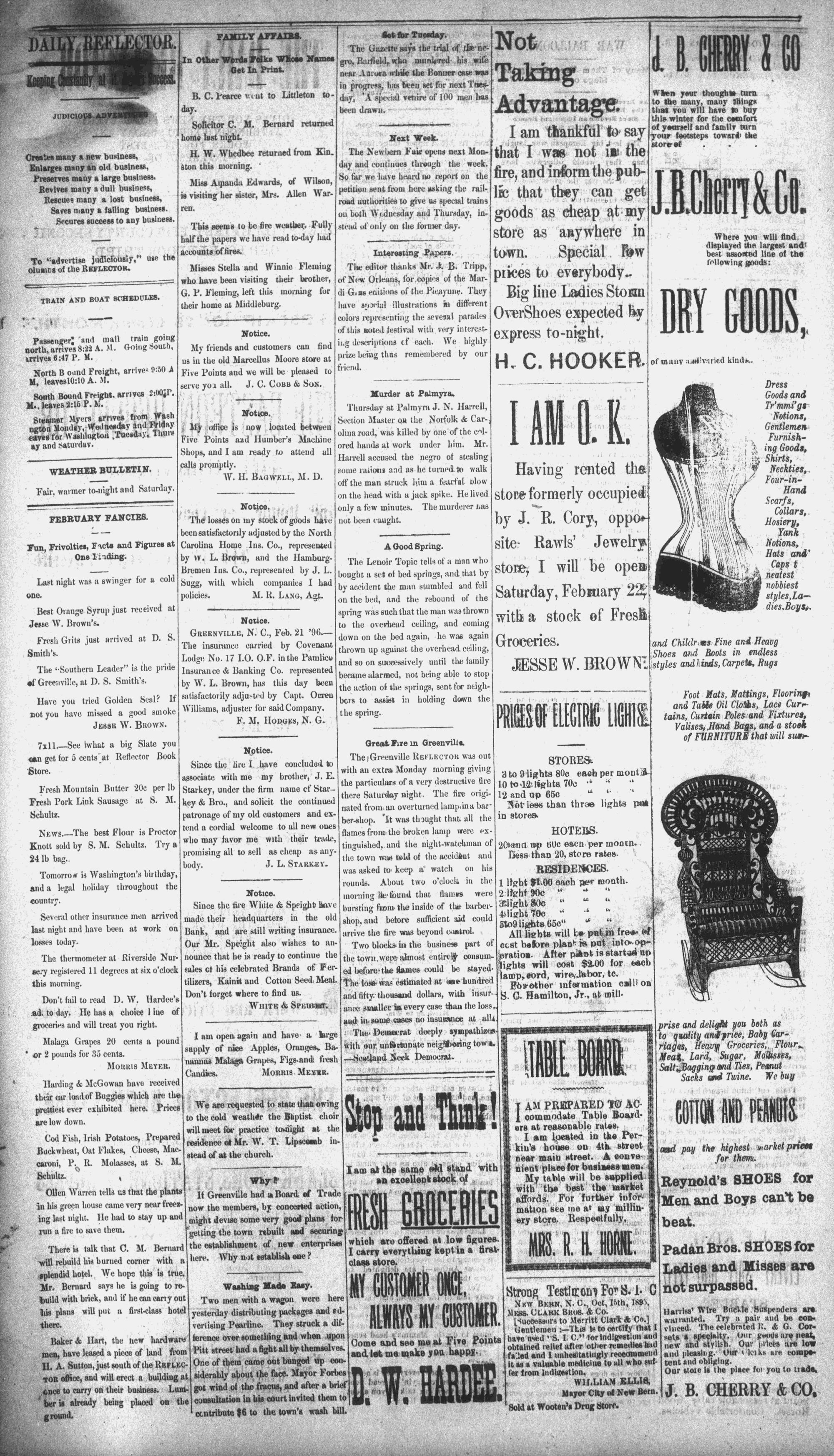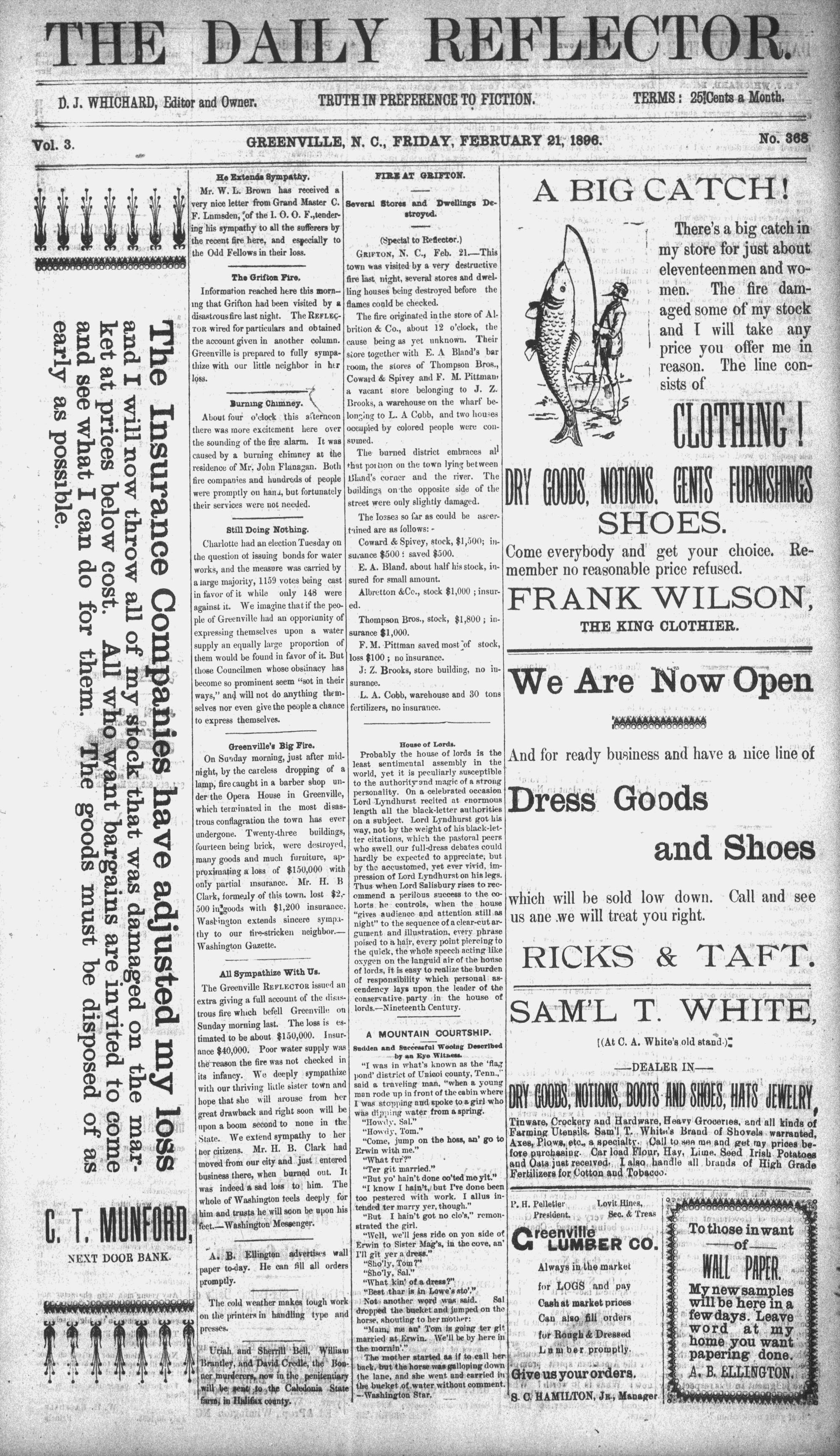 The newspaper was established in 1882, and was originally named the Eastern Reflector. It was founded by Julian Whichard and David Jordan with equipment they purchased from The Greenville Express. On December 10, 1894, it adopted the name The Reflector and began publishing every day. Cox Newspapers acquired The Daily Reflector in 1996. Creator: Daily Reflector (Greenville, N.C.) - February 21, 1896
