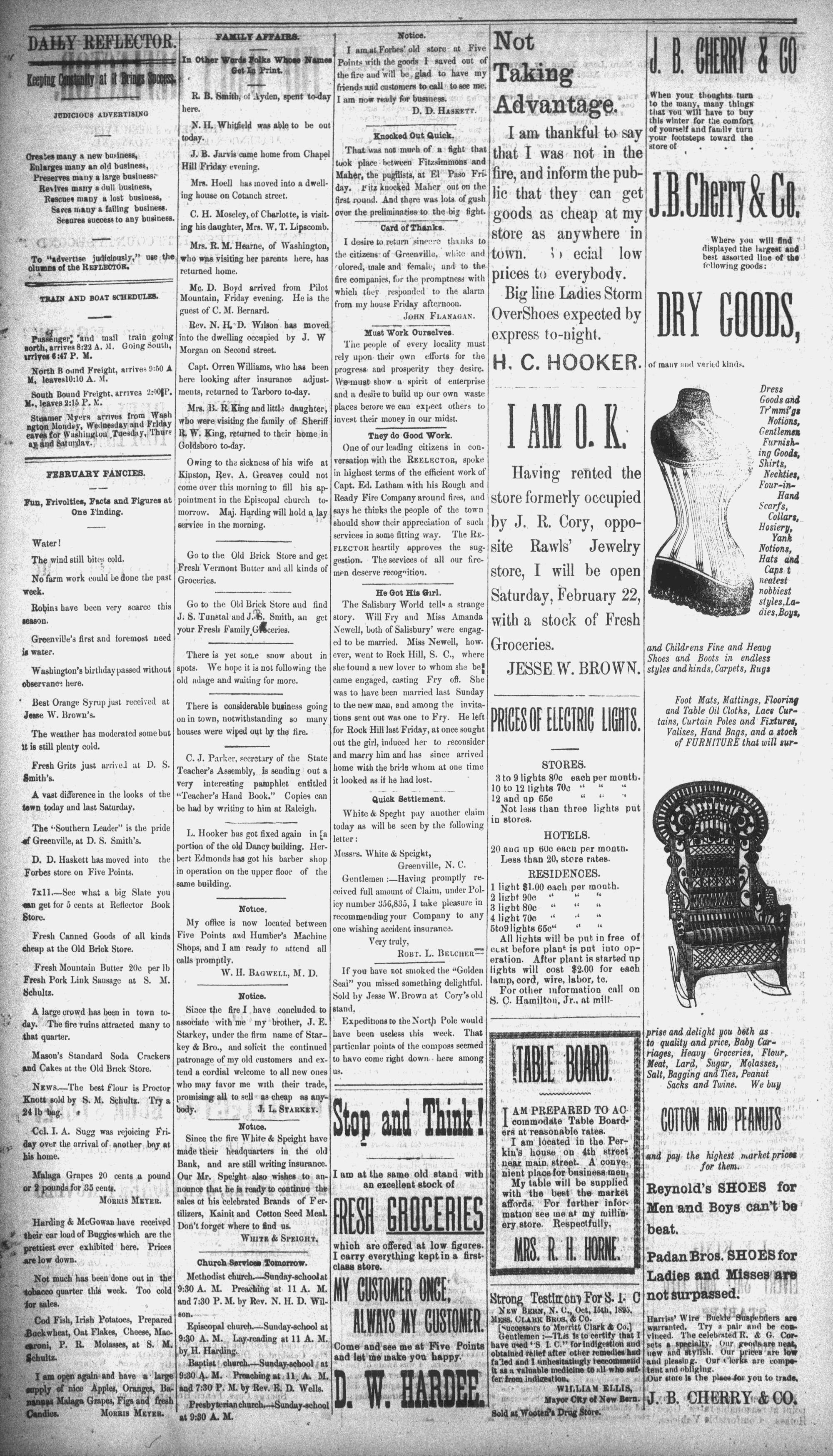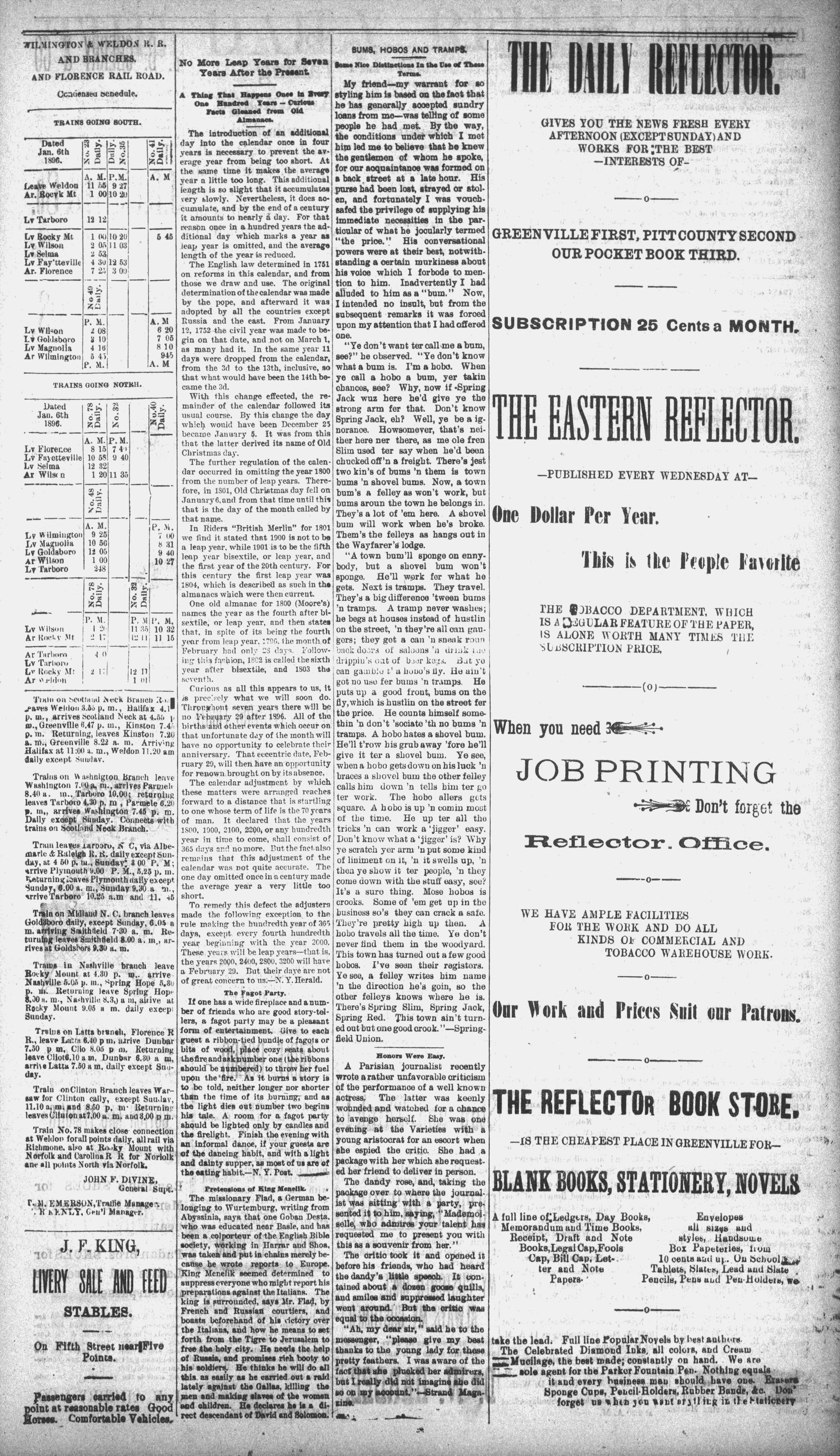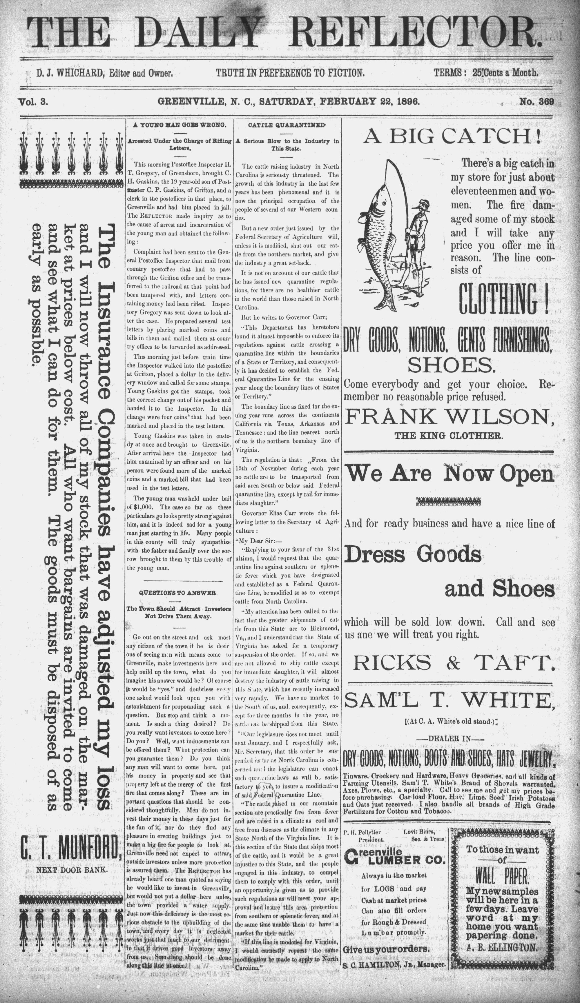 The newspaper was established in 1882, and was originally named the Eastern Reflector. It was founded by Julian Whichard and David Jordan with equipment they purchased from The Greenville Express. On December 10, 1894, it adopted the name The Reflector and began publishing every day. Cox Newspapers acquired The Daily Reflector in 1996. Creator: Daily Reflector (Greenville, N.C.) - February 22, 1896