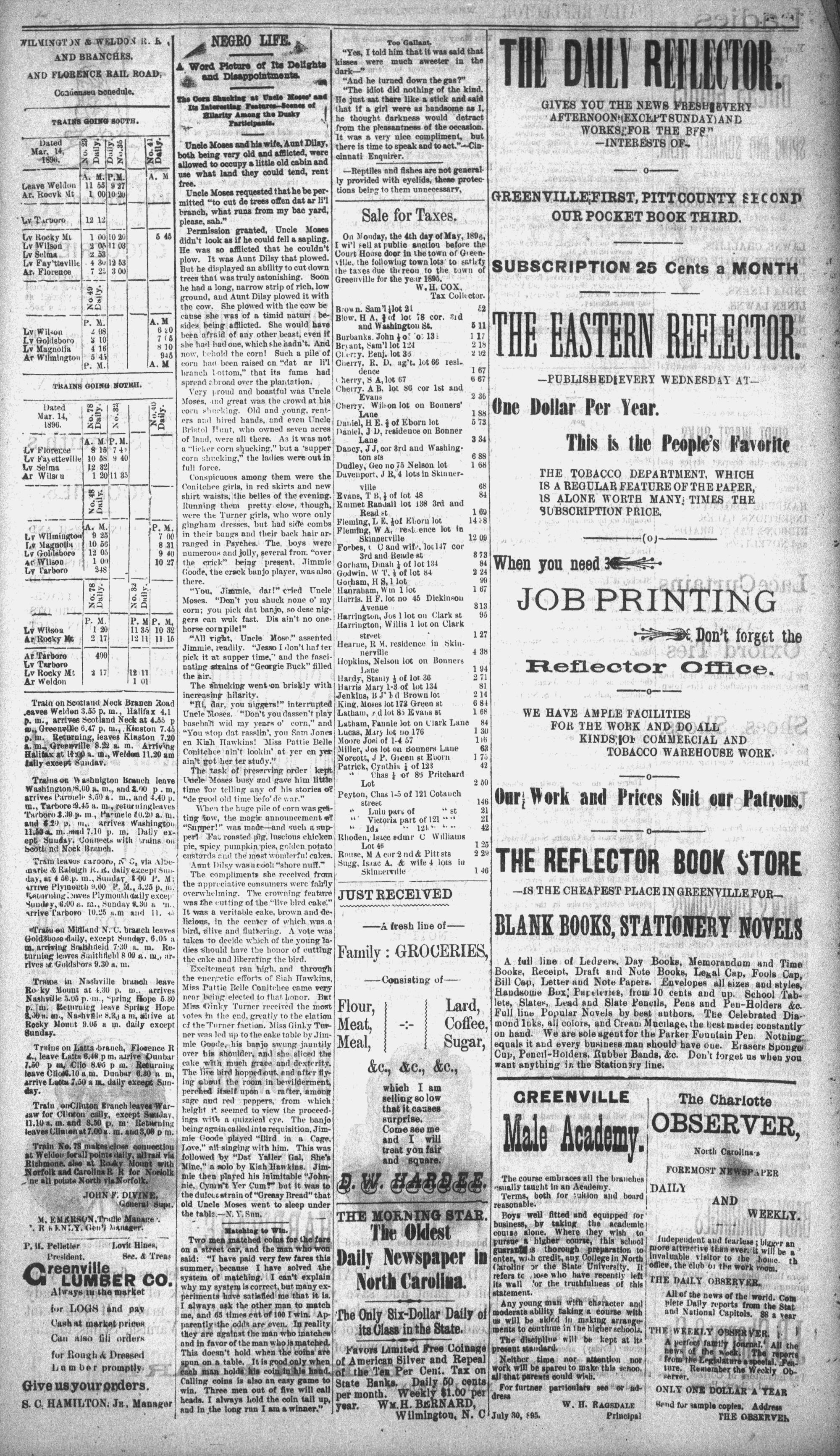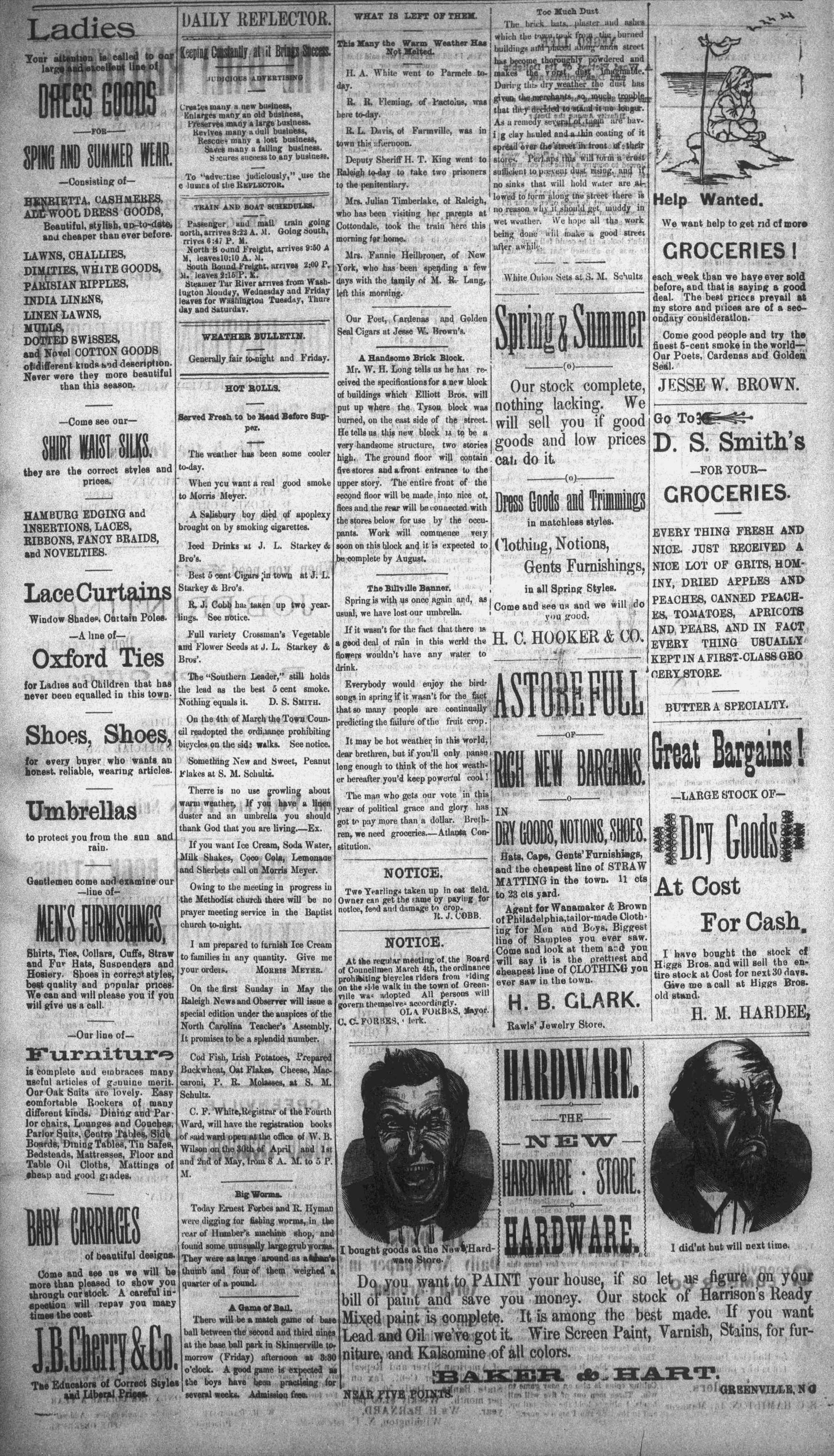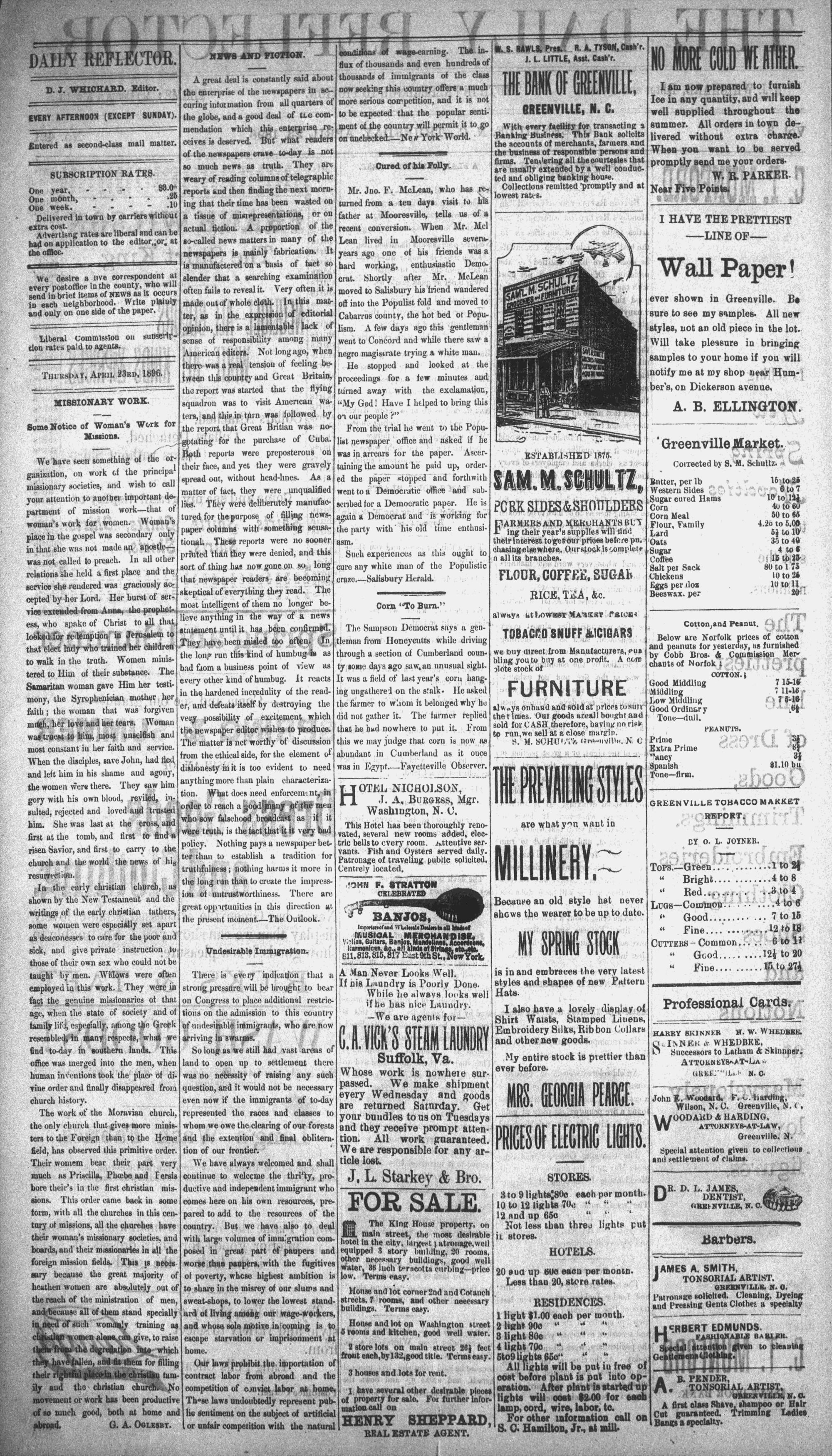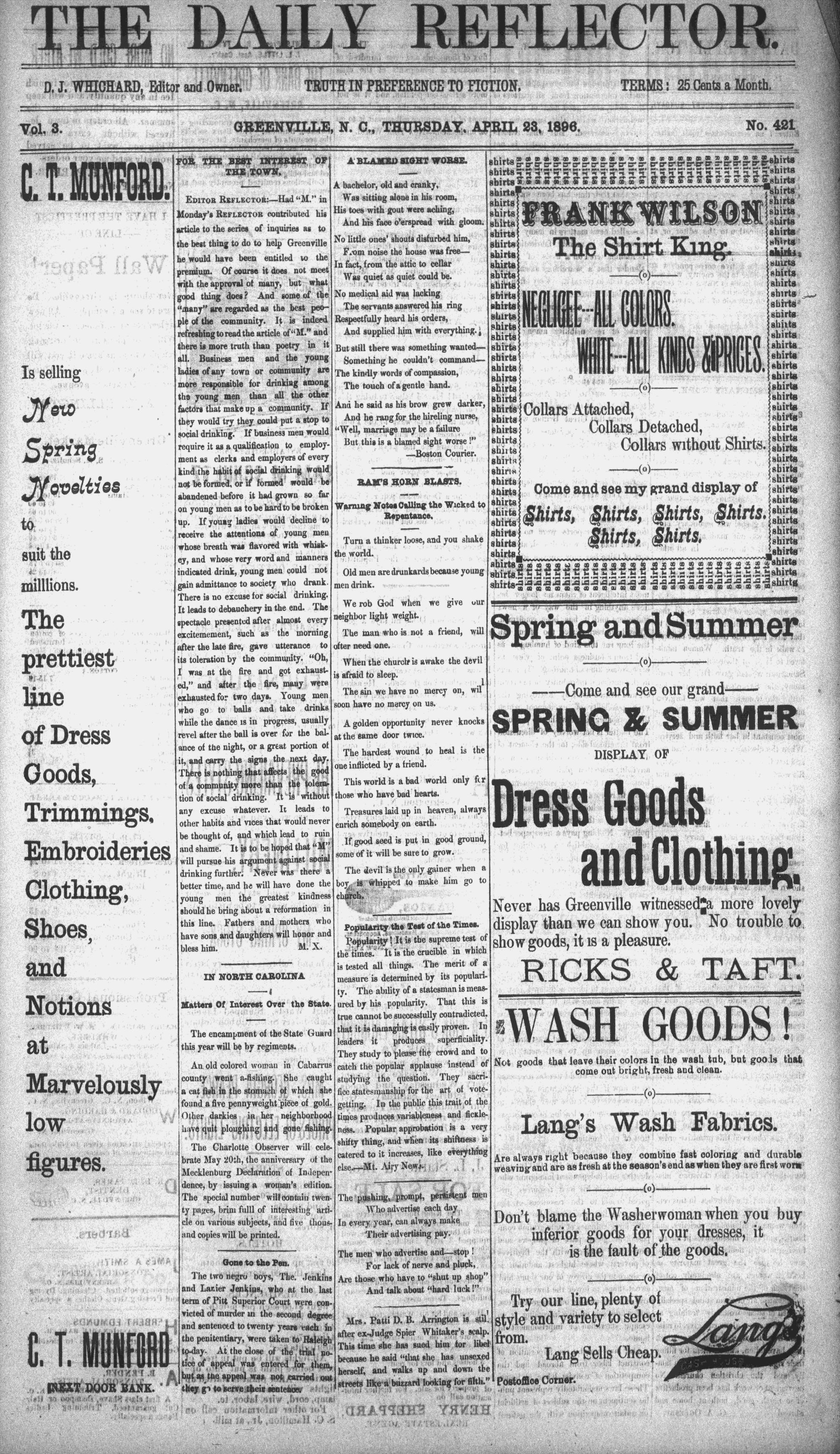 The newspaper was established in 1882, and was originally named the Eastern Reflector. It was founded by Julian Whichard and David Jordan with equipment they purchased from The Greenville Express. On December 10, 1894, it adopted the name The Reflector and began publishing every day. Cox Newspapers acquired The Daily Reflector in 1996. Creator: Daily Reflector (Greenville, N.C.) - April 23, 1896