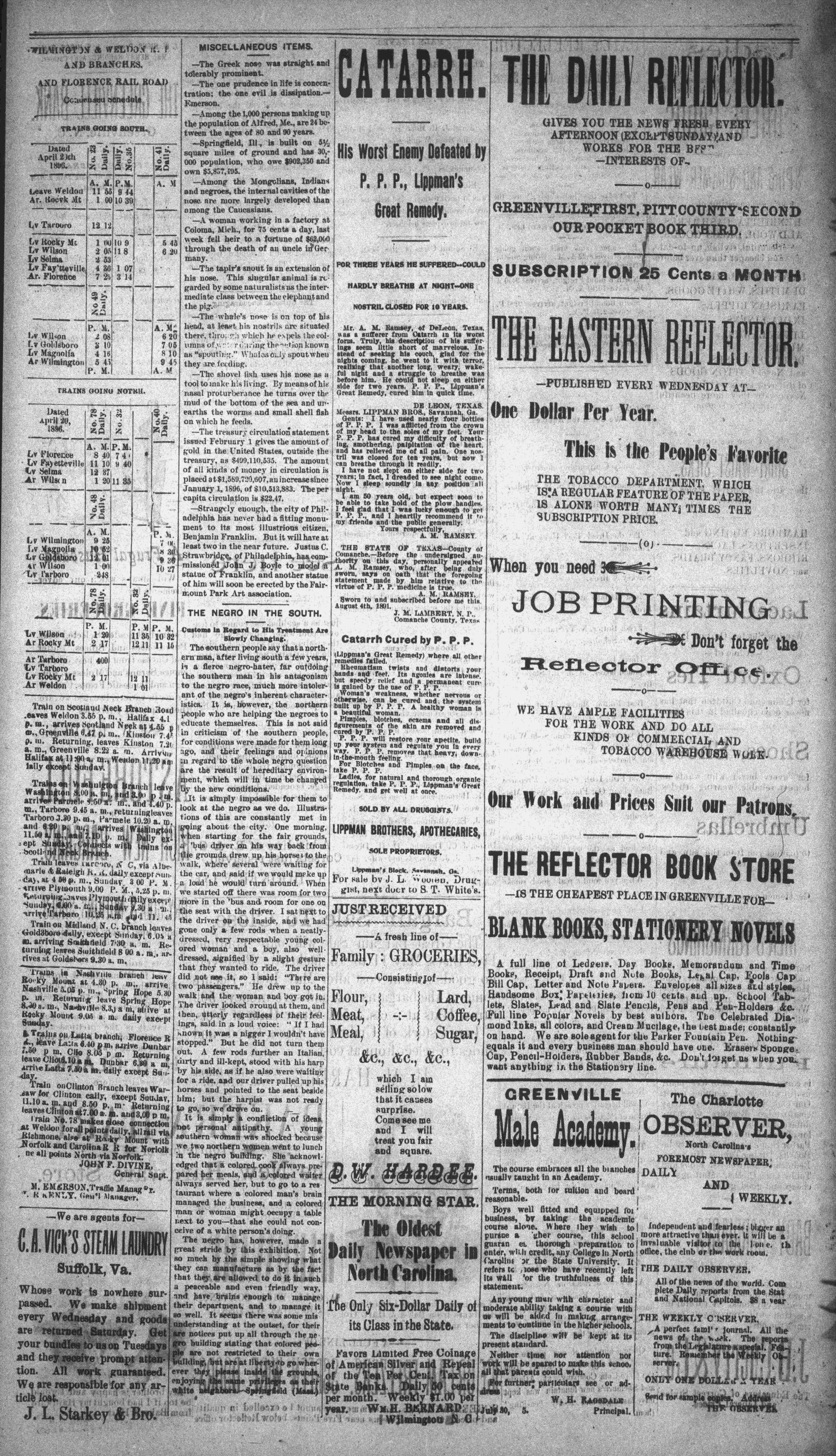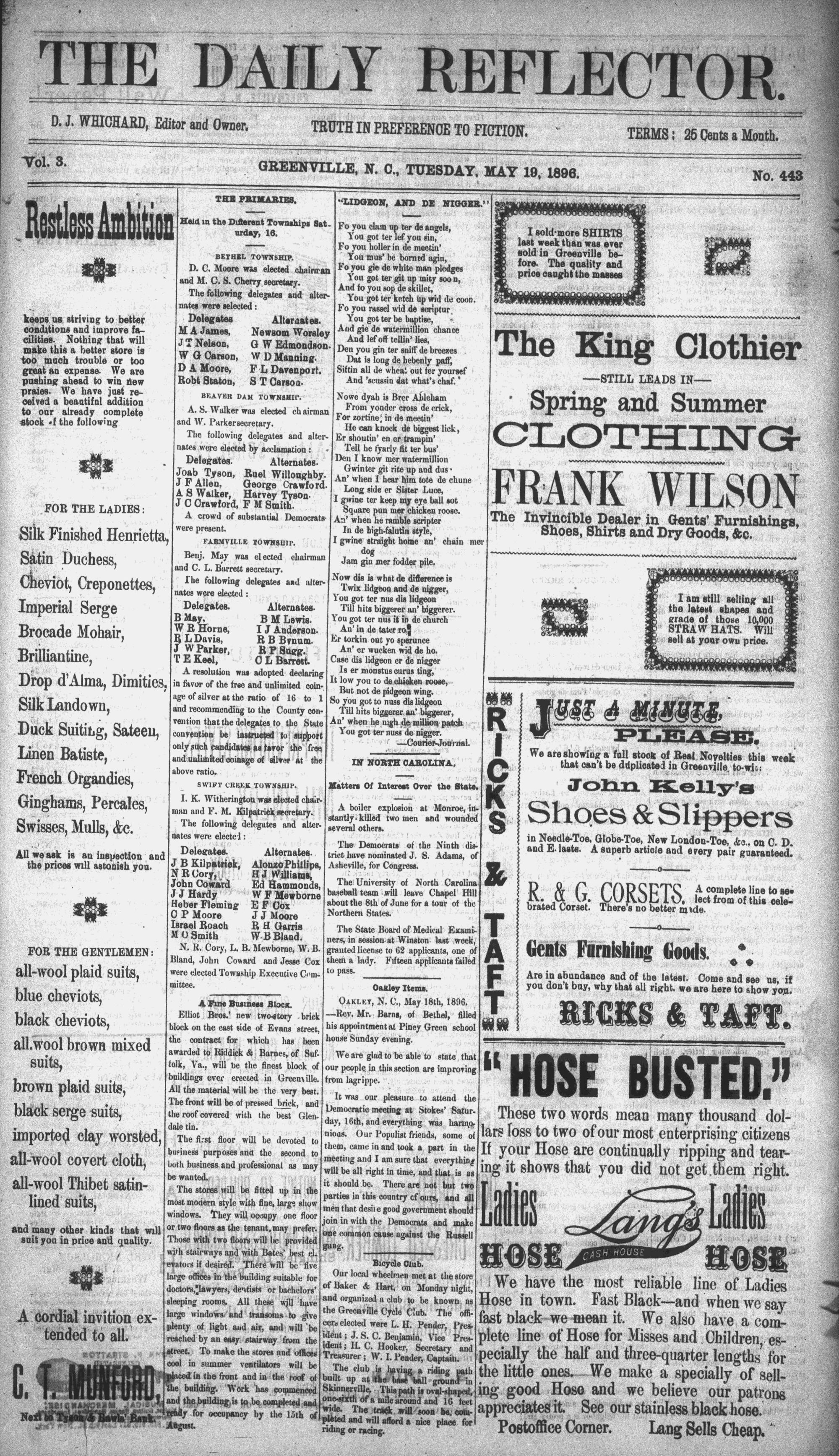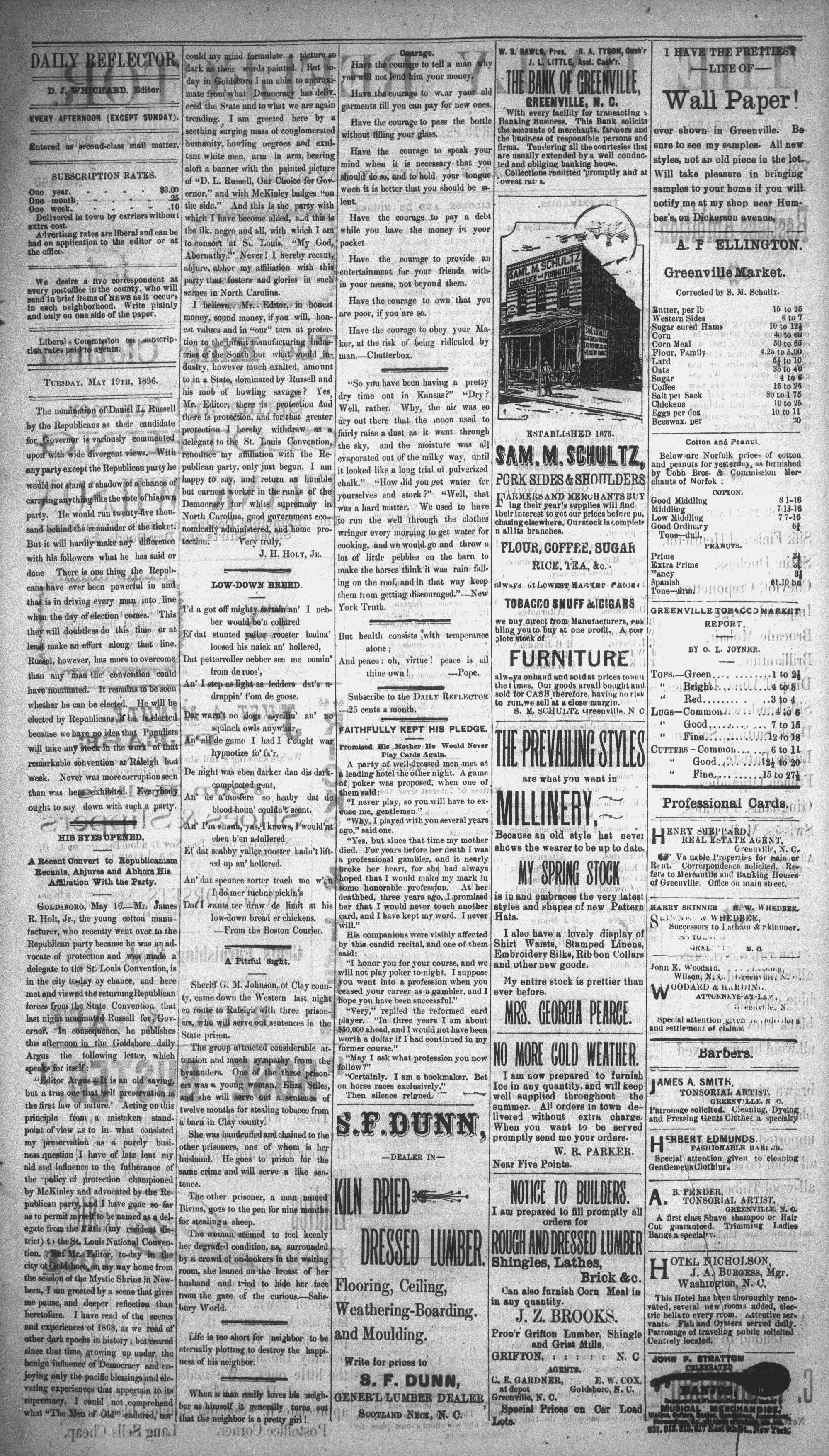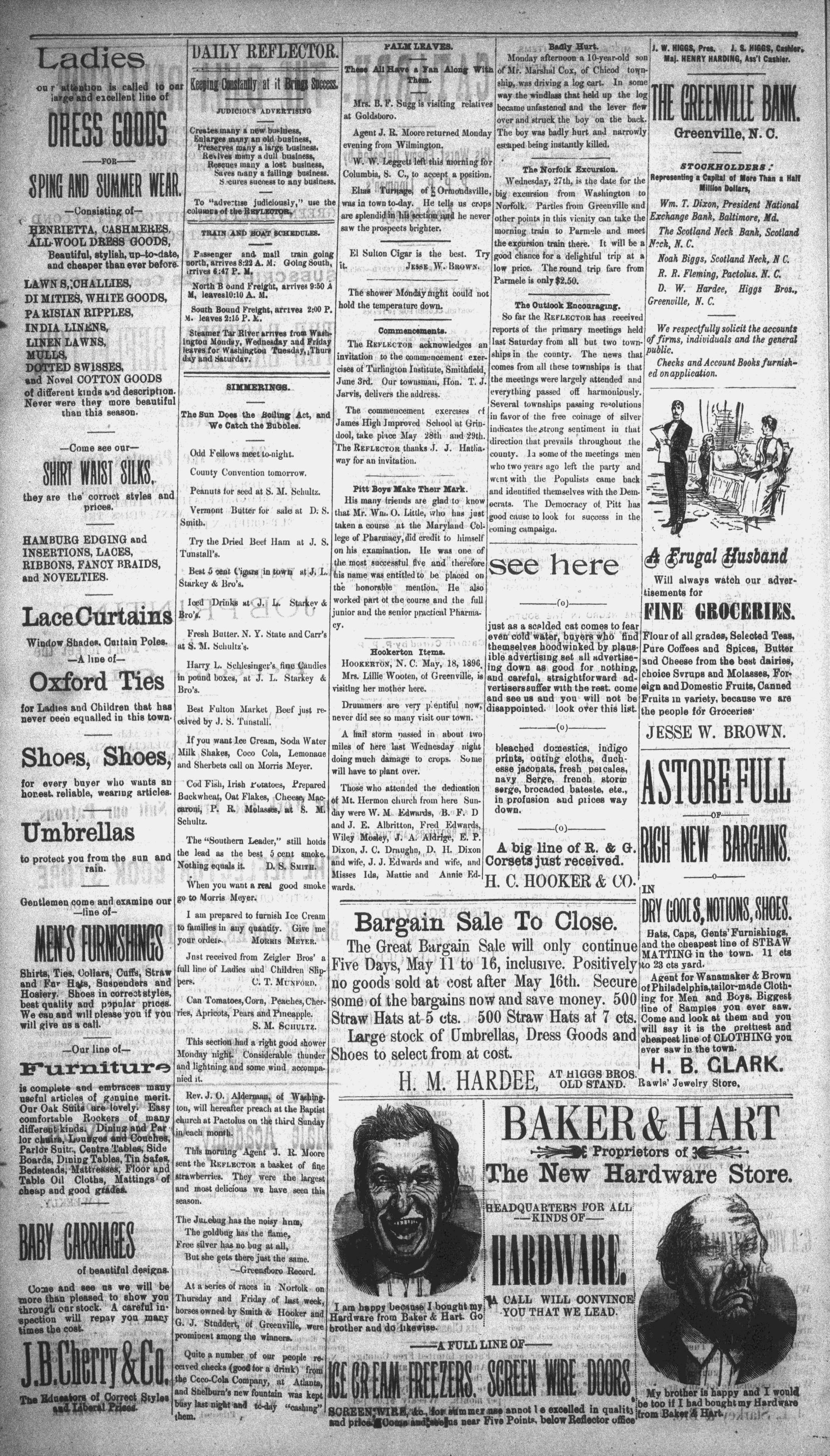 The newspaper was established in 1882, and was originally named the Eastern Reflector. It was founded by Julian Whichard and David Jordan with equipment they purchased from The Greenville Express. On December 10, 1894, it adopted the name The Reflector and began publishing every day. Cox Newspapers acquired The Daily Reflector in 1996. Creator: Daily Reflector (Greenville, N.C.) - May 19, 1896