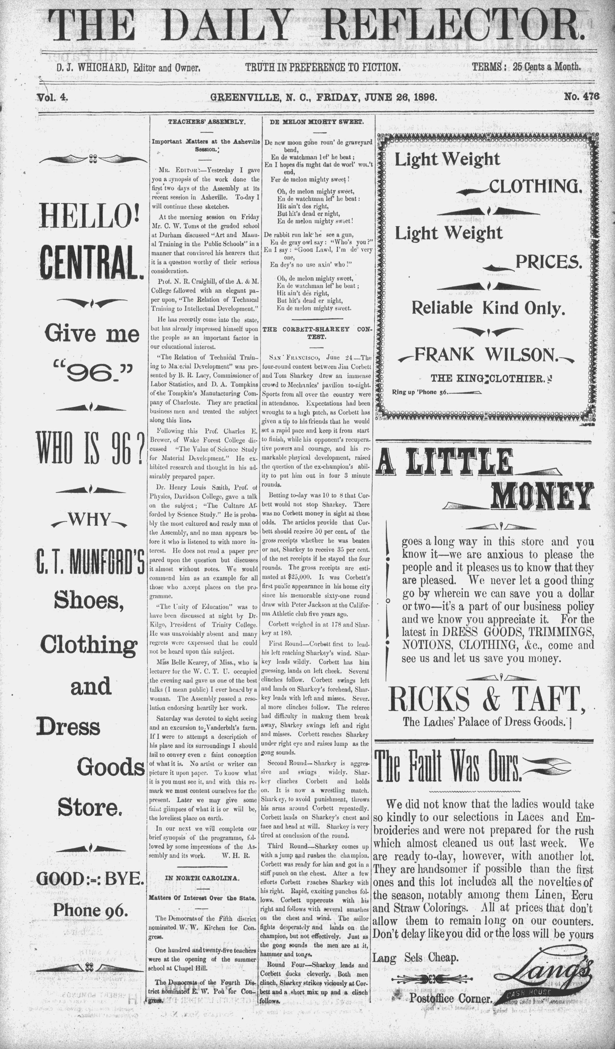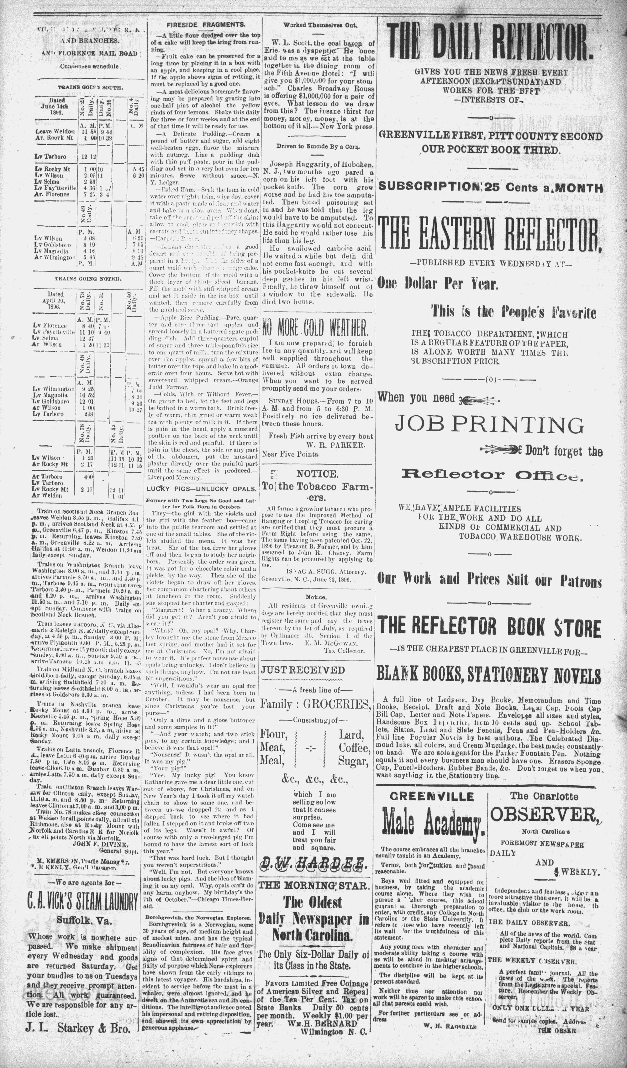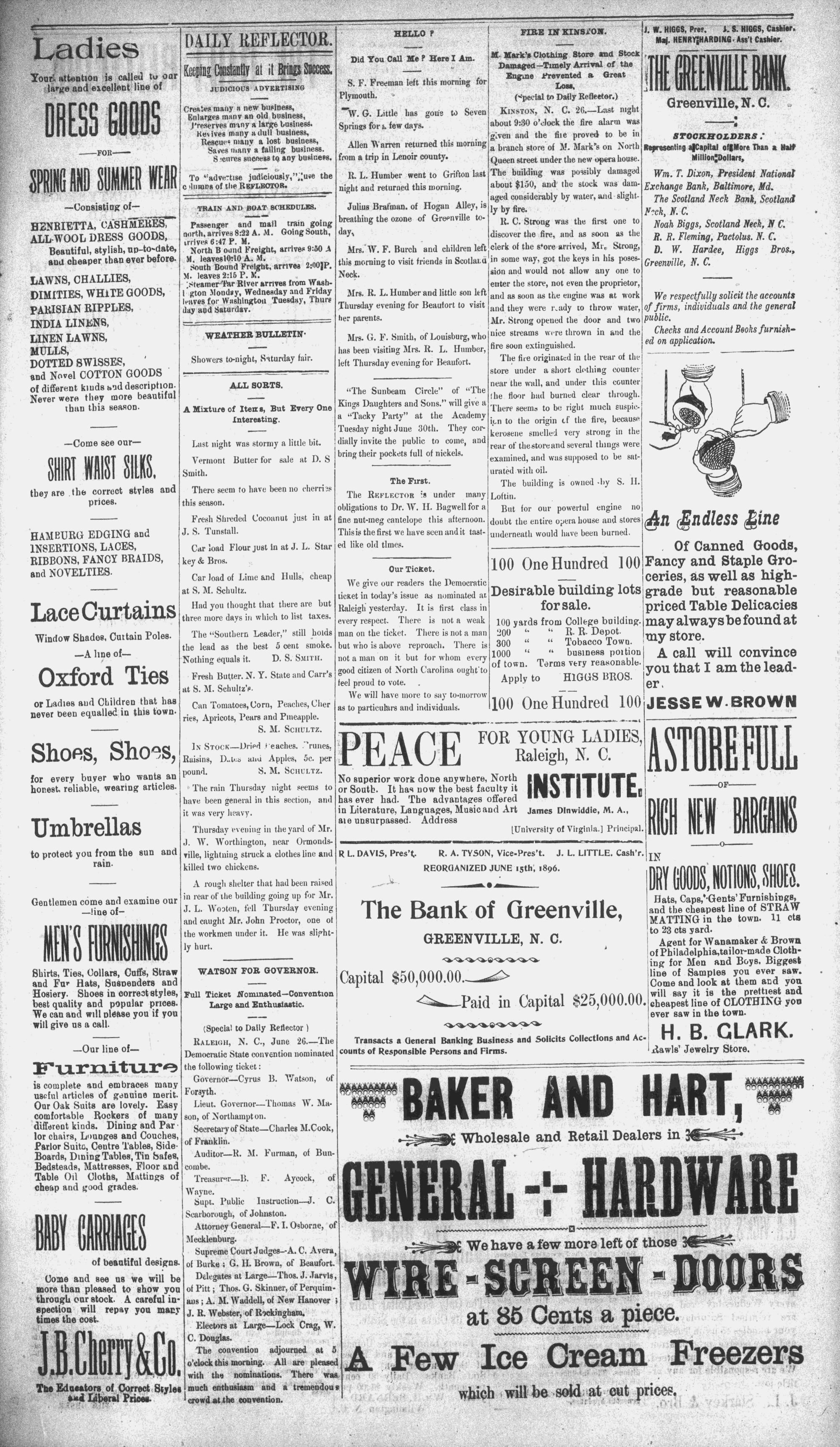 The newspaper was established in 1882, and was originally named the Eastern Reflector. It was founded by Julian Whichard and David Jordan with equipment they purchased from The Greenville Express. On December 10, 1894, it adopted the name The Reflector and began publishing every day. Cox Newspapers acquired The Daily Reflector in 1996. Creator: Daily Reflector (Greenville, N.C.) - June 26, 1896