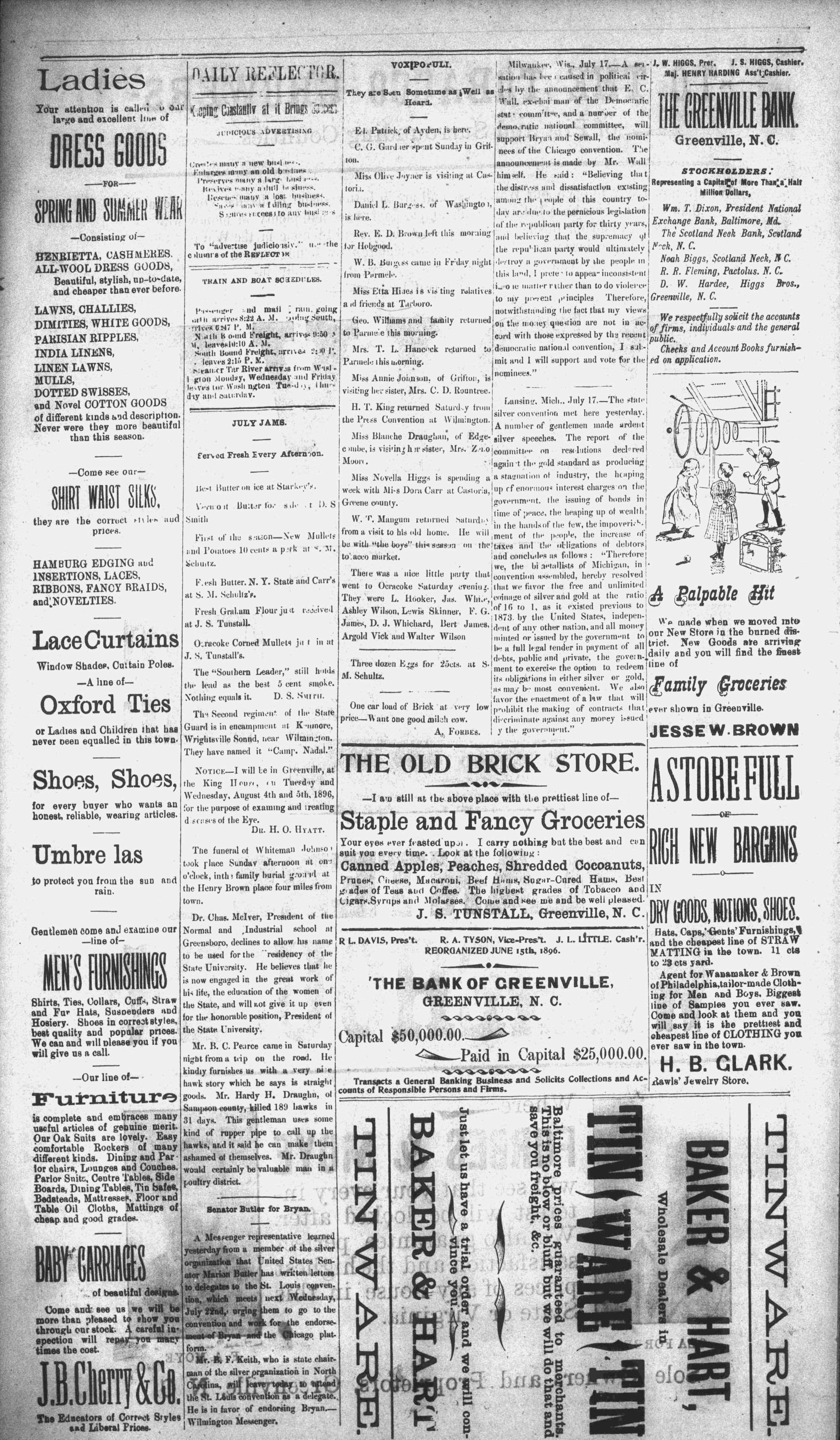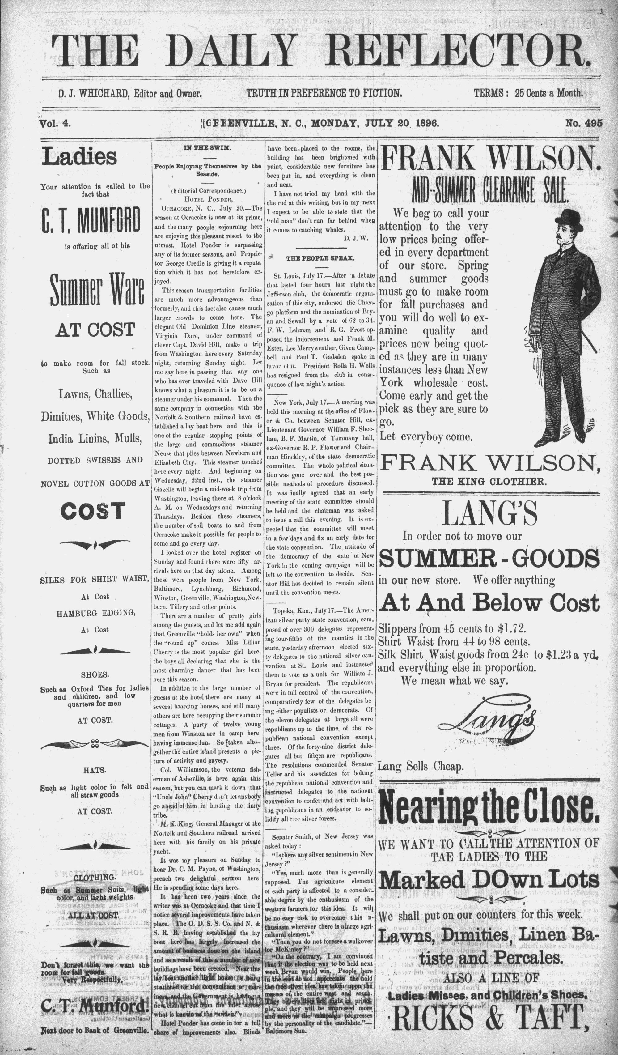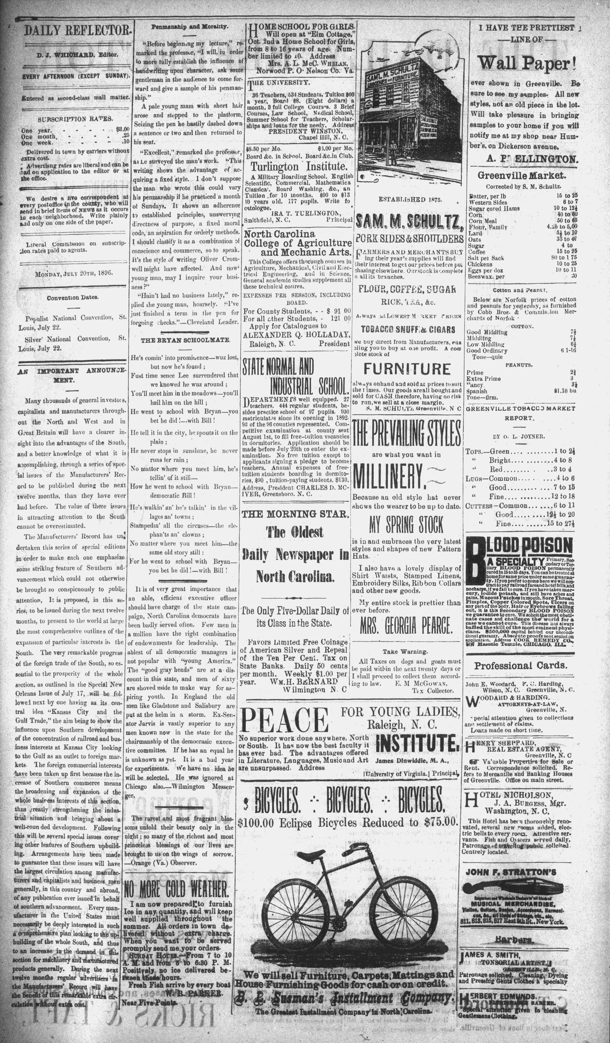 The newspaper was established in 1882, and was originally named the Eastern Reflector. It was founded by Julian Whichard and David Jordan with equipment they purchased from The Greenville Express. On December 10, 1894, it adopted the name The Reflector and began publishing every day. Cox Newspapers acquired The Daily Reflector in 1996. Creator: Daily Reflector (Greenville, N.C.) - July 20, 1896
