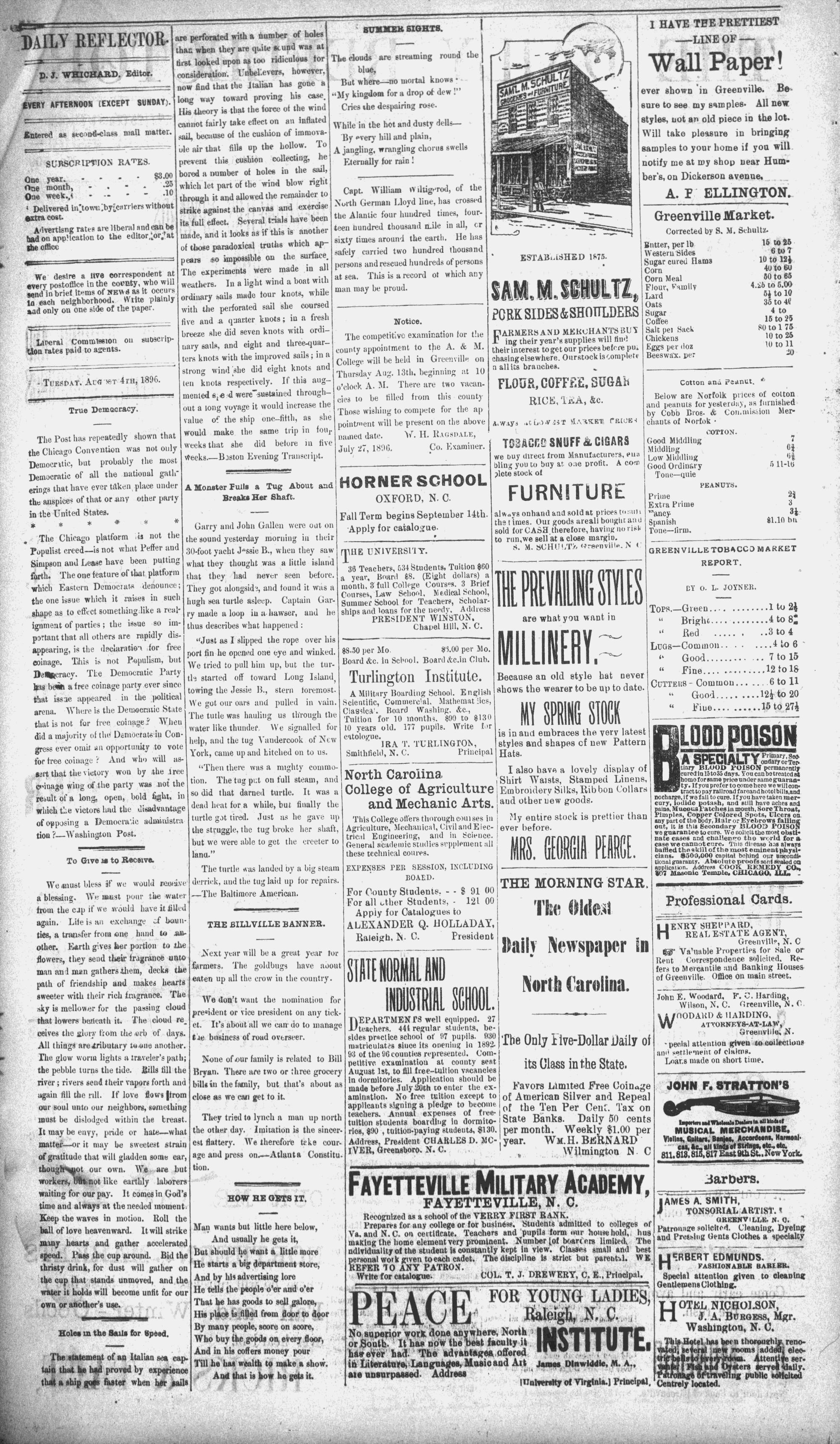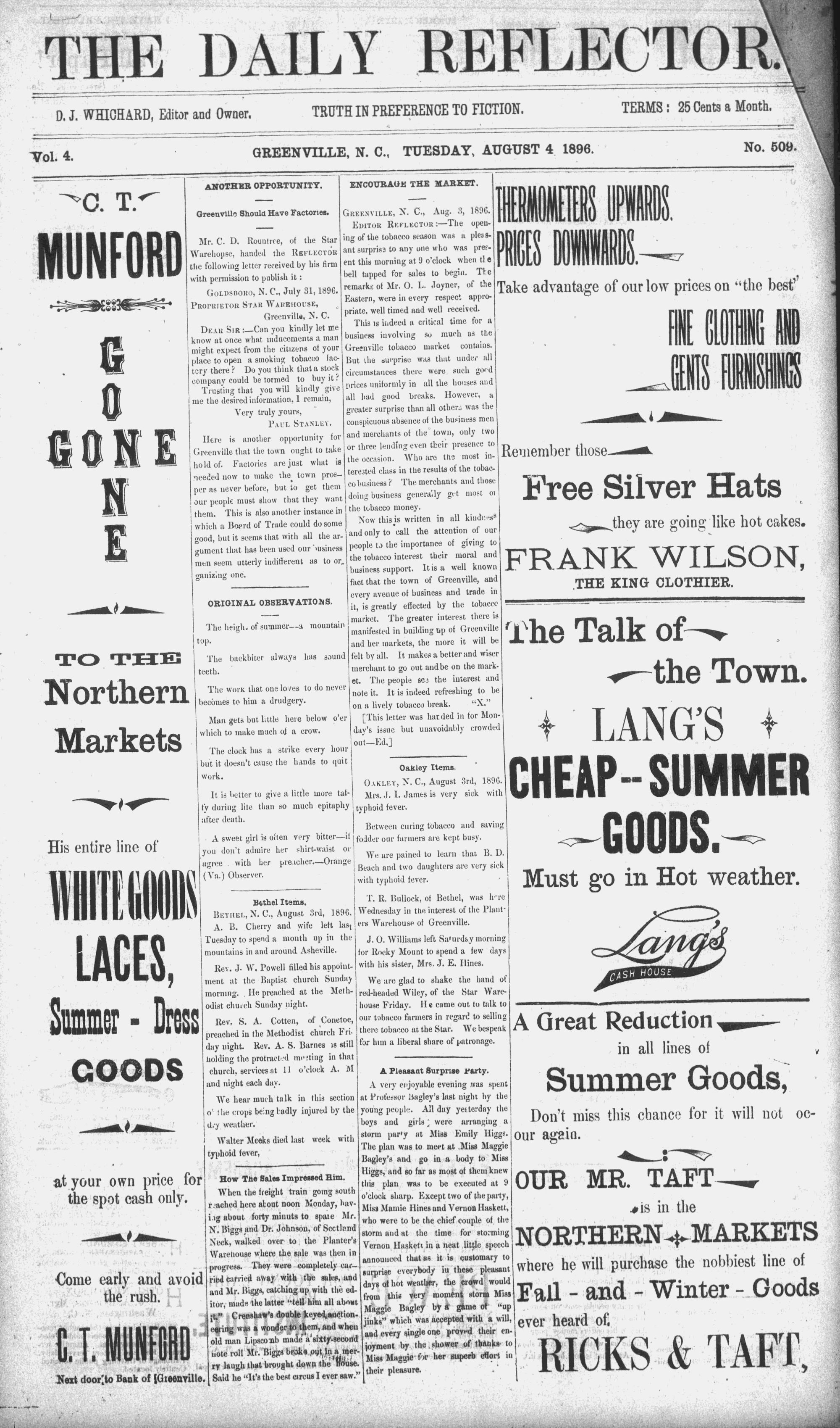 Vol. 4. GREENVILLE, N. C.. TUESDAY, AUGUST 4 1896. © No. 509.