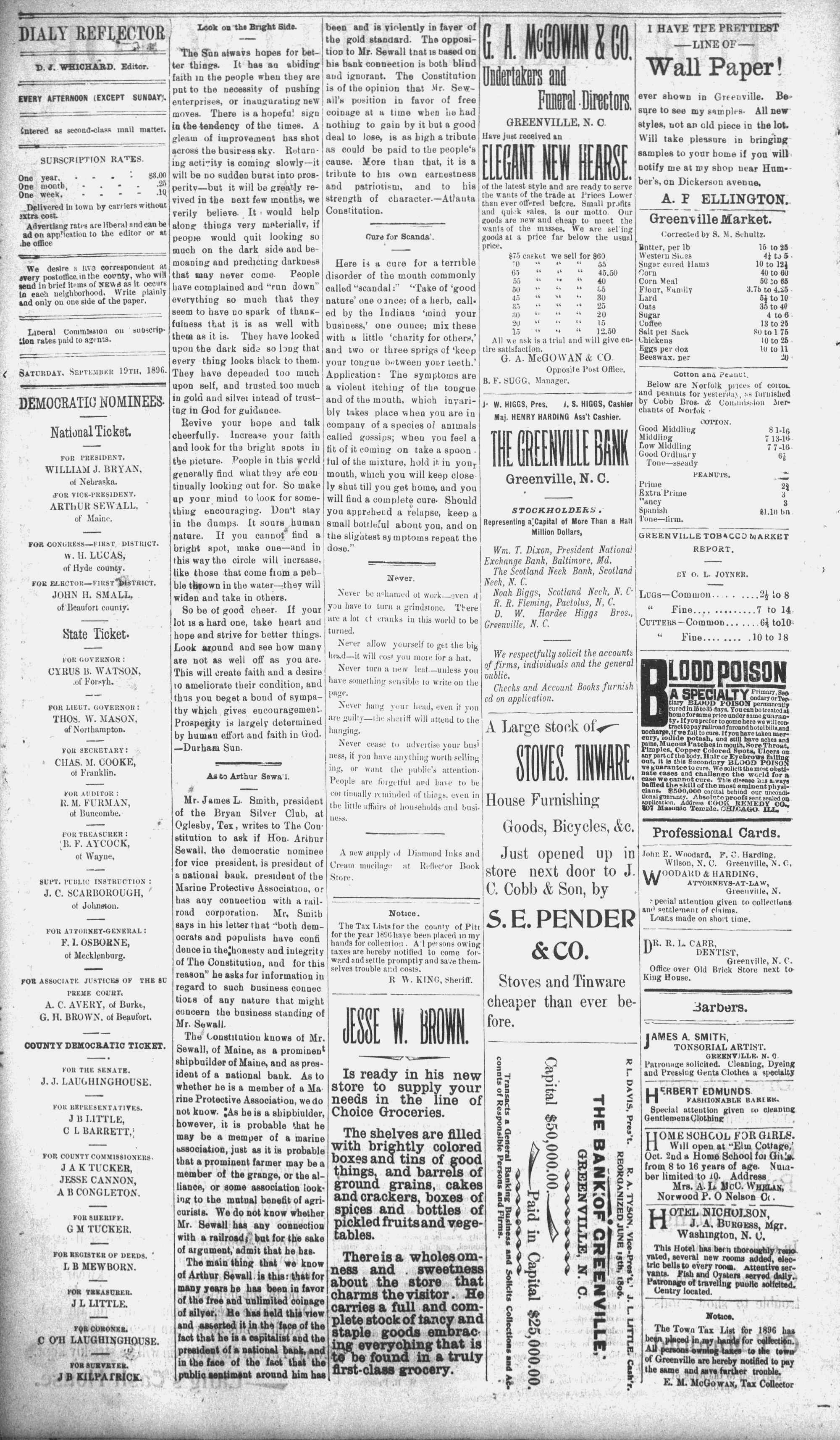 The newspaper was established in 1882, and was originally named the Eastern Reflector. It was founded by Julian Whichard and David Jordan with equipment they purchased from The Greenville Express. On December 10, 1894, it adopted the name The Reflector and began publishing every day. Cox Newspapers acquired The Daily Reflector in 1996. Creator: Daily Reflector (Greenville, N.C.) - September 19, 1896