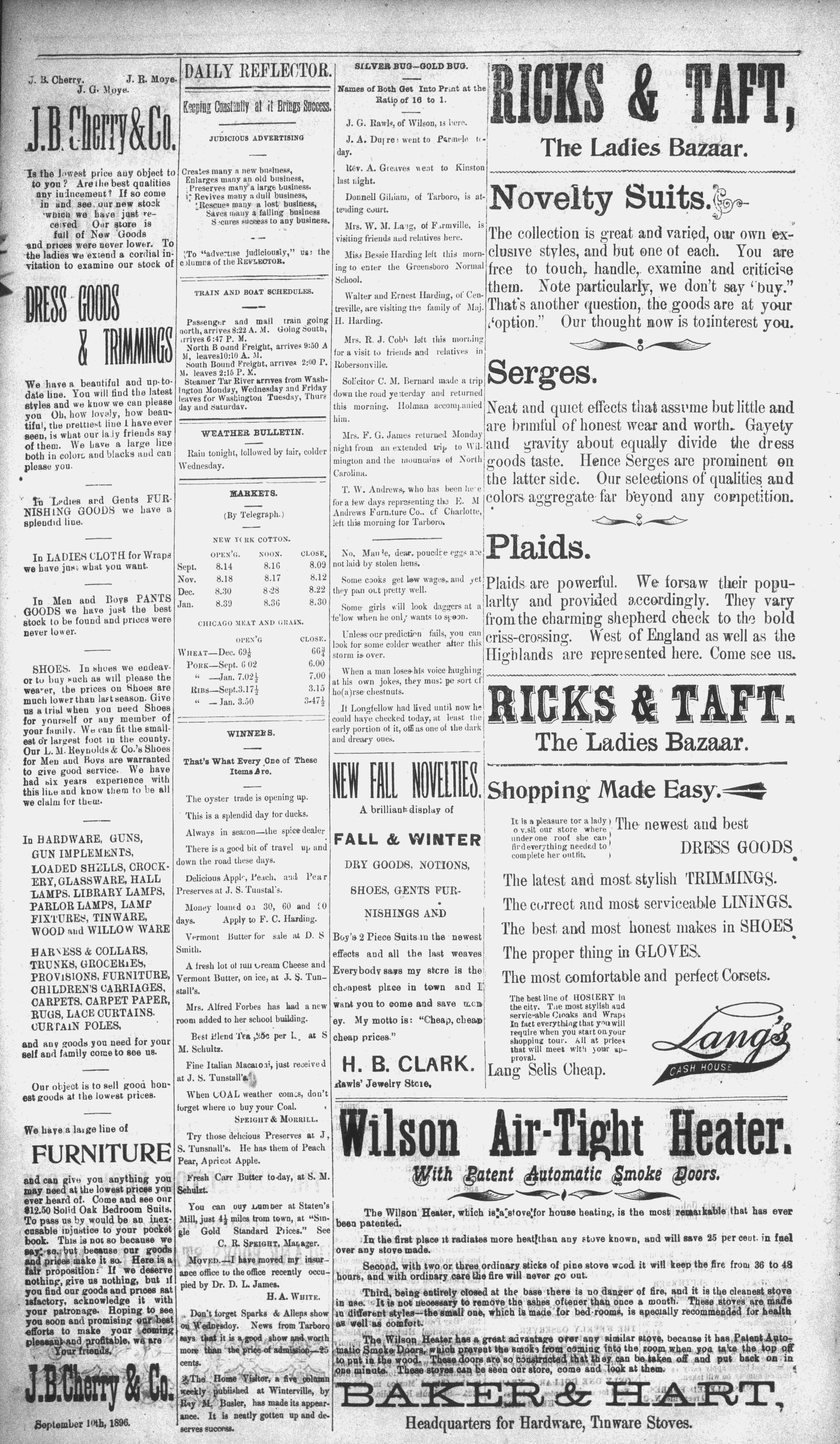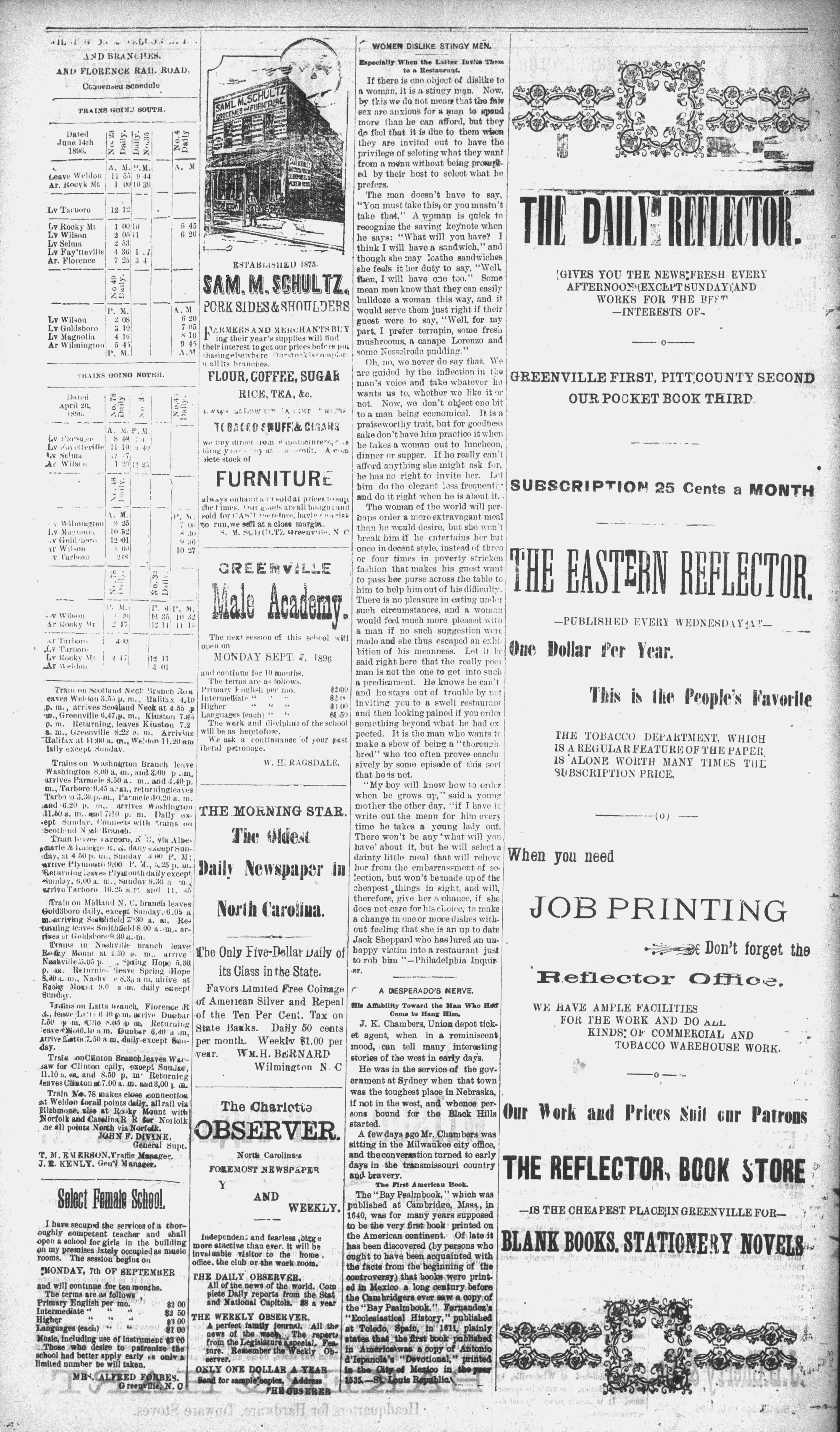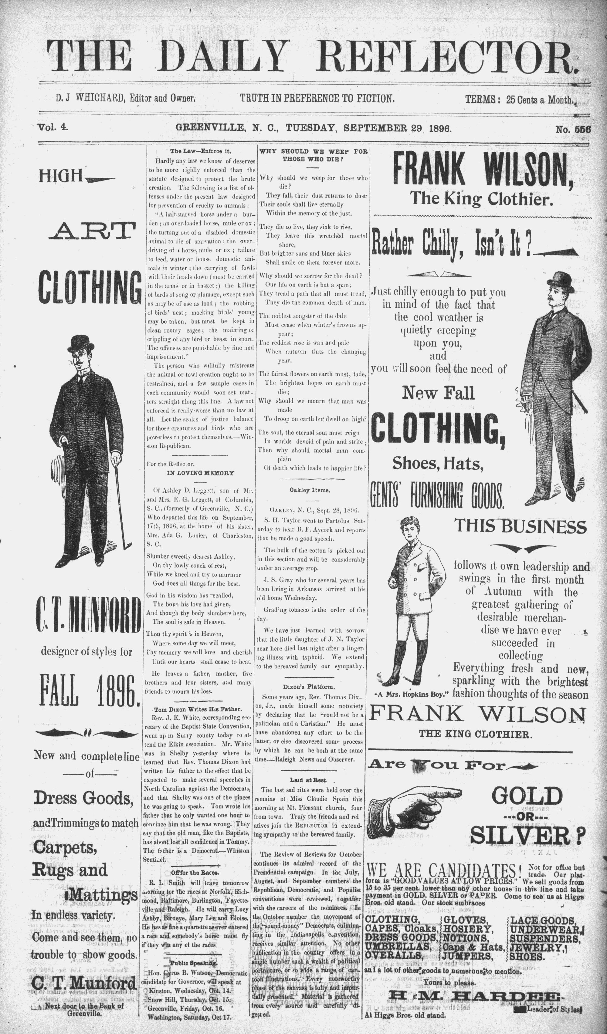 The newspaper was established in 1882, and was originally named the Eastern Reflector. It was founded by Julian Whichard and David Jordan with equipment they purchased from The Greenville Express. On December 10, 1894, it adopted the name The Reflector and began publishing every day. Cox Newspapers acquired The Daily Reflector in 1996. Creator: Daily Reflector (Greenville, N.C.) - September 29, 1896