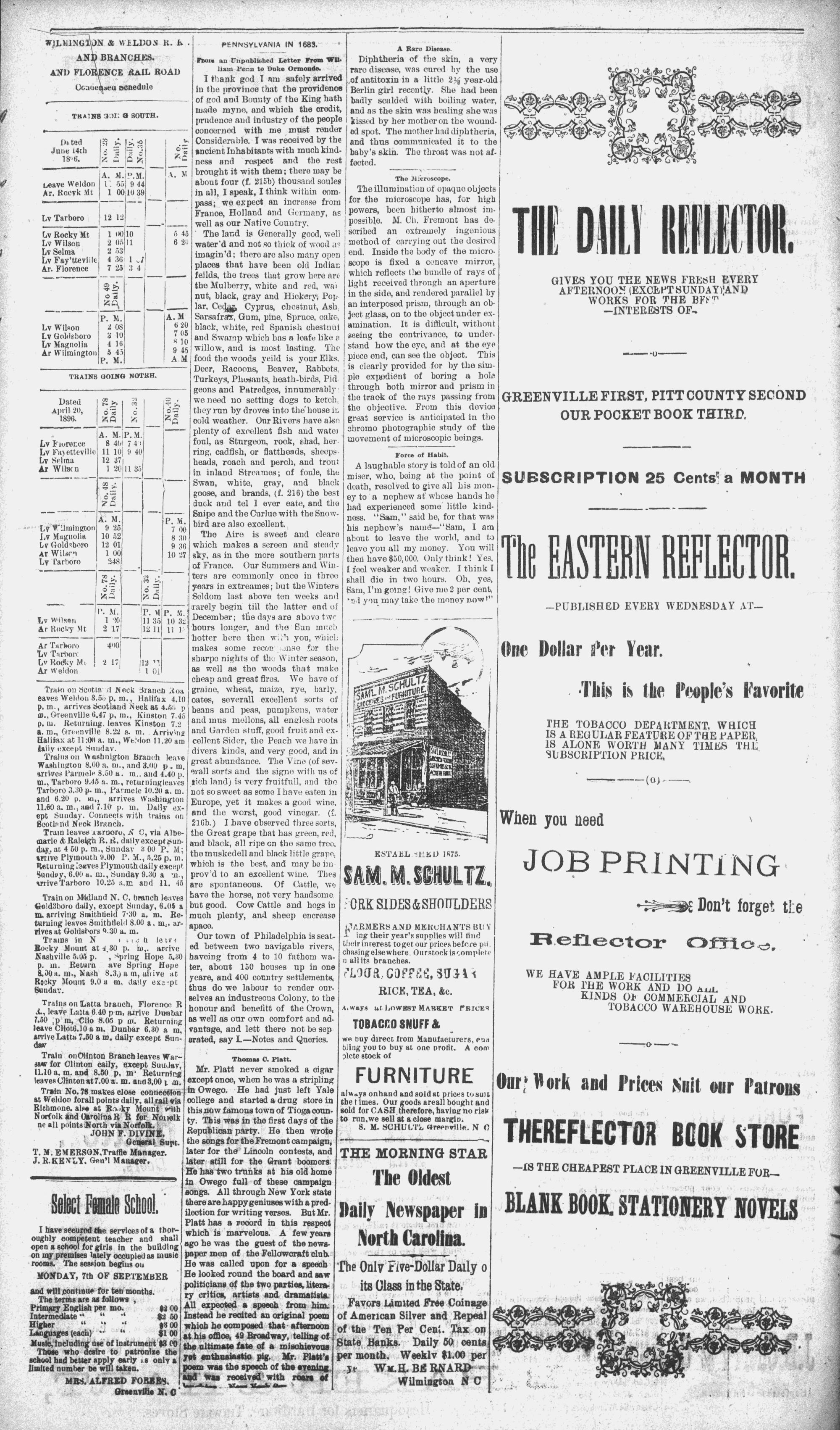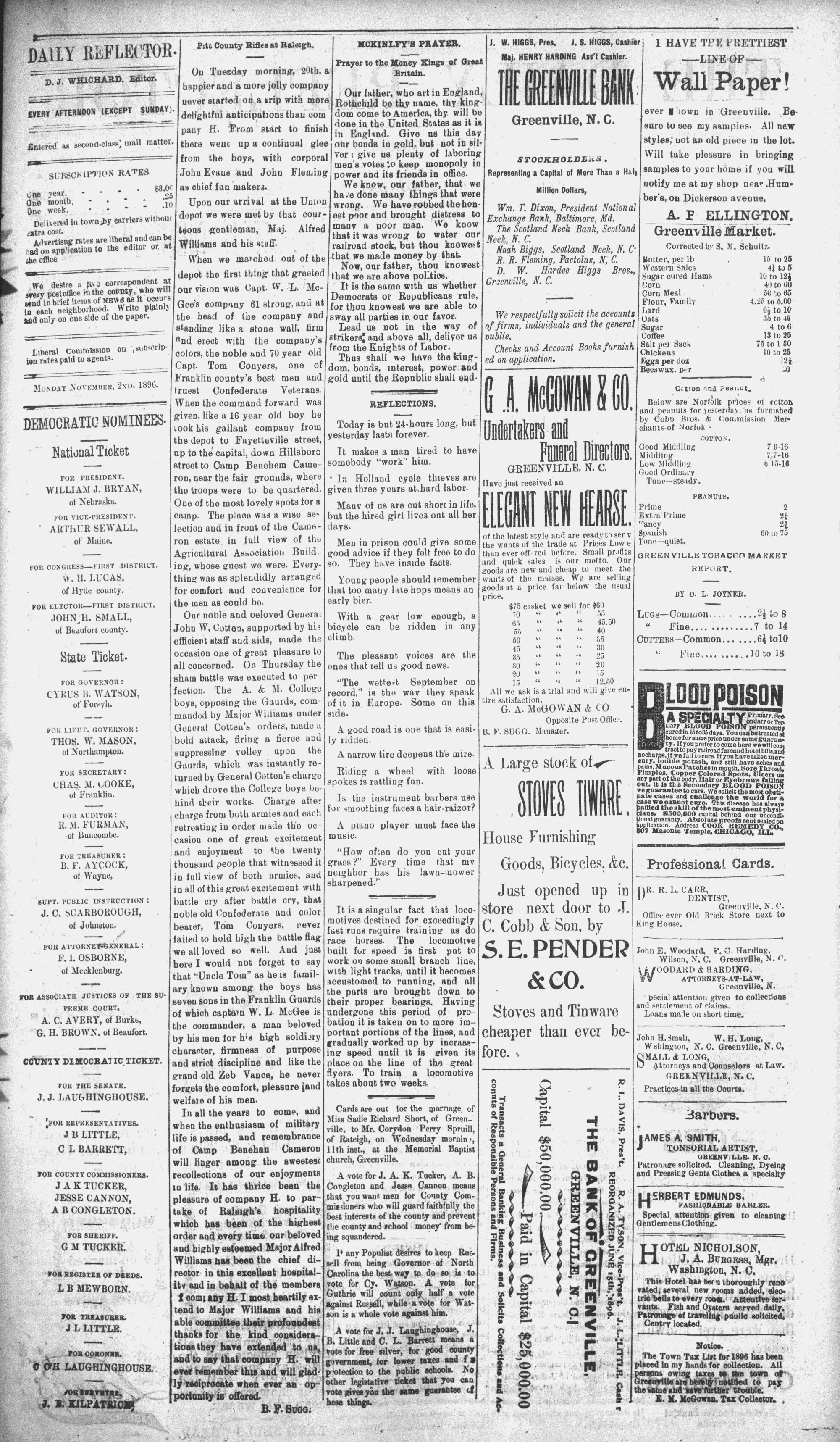The newspaper was established in 1882, and was originally named the Eastern Reflector. It was founded by Julian Whichard and David Jordan with equipment they purchased from The Greenville Express. On December 10, 1894, it adopted the name The Reflector and began publishing every day. Cox Newspapers acquired The Daily Reflector in 1996. Creator: Daily Reflector (Greenville, N.C.) - November 2, 1896