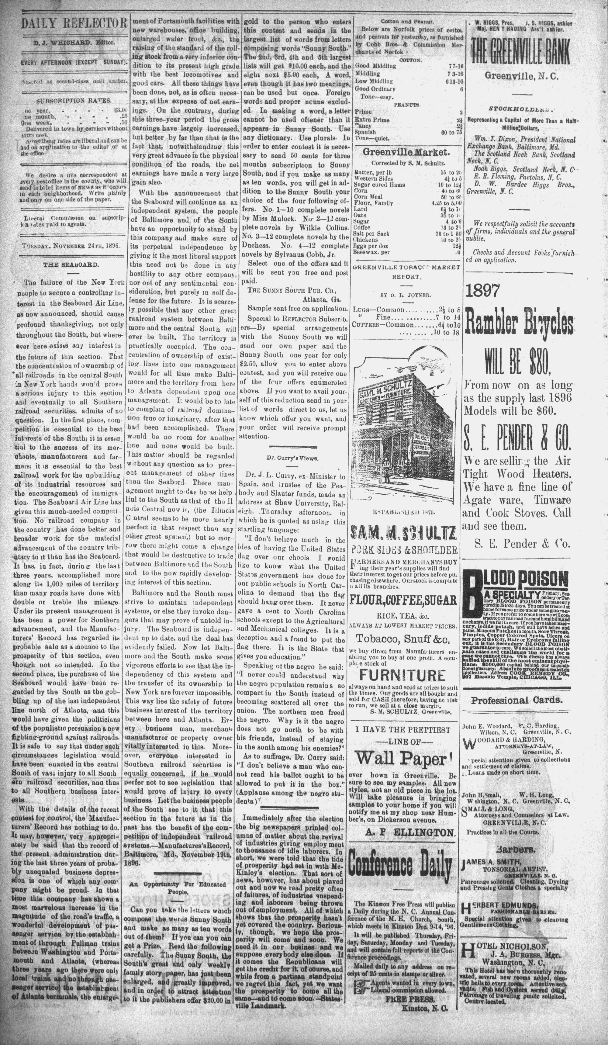 The newspaper was established in 1882, and was originally named the Eastern Reflector. It was founded by Julian Whichard and David Jordan with equipment they purchased from The Greenville Express. On December 10, 1894, it adopted the name The Reflector and began publishing every day. Cox Newspapers acquired The Daily Reflector in 1996. Creator: Daily Reflector (Greenville, N.C.) - November 24, 1896