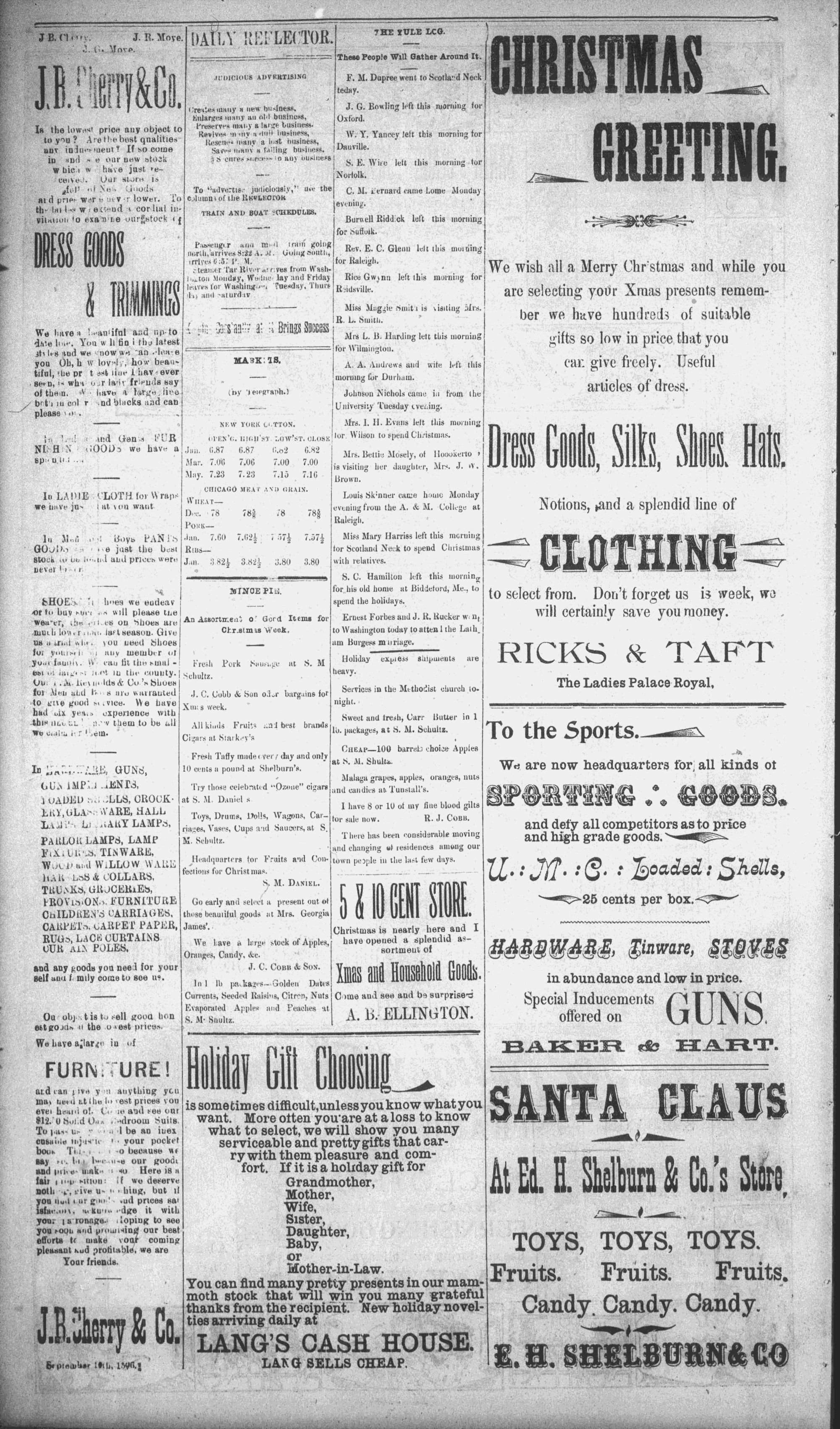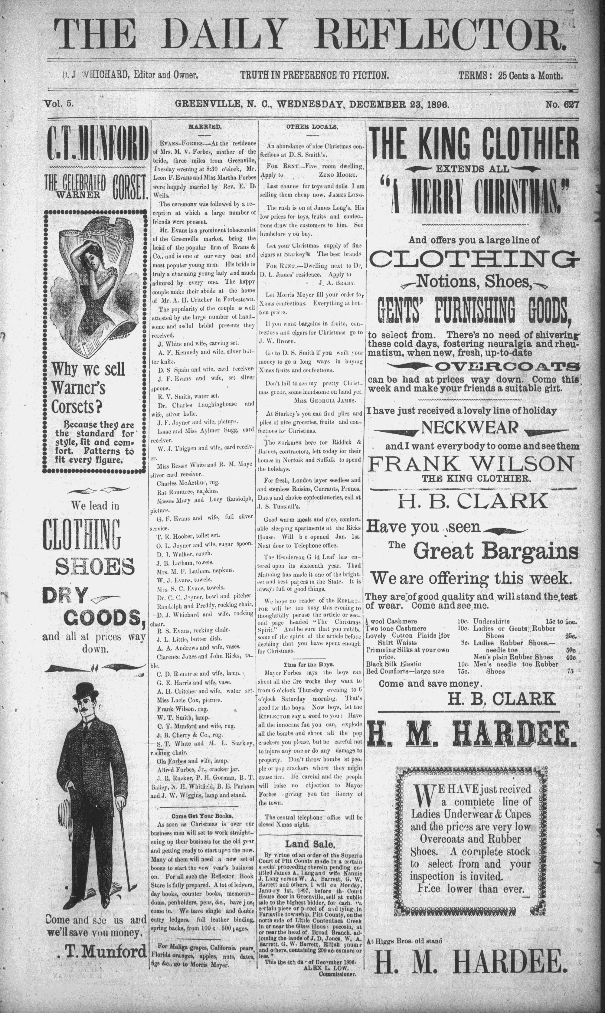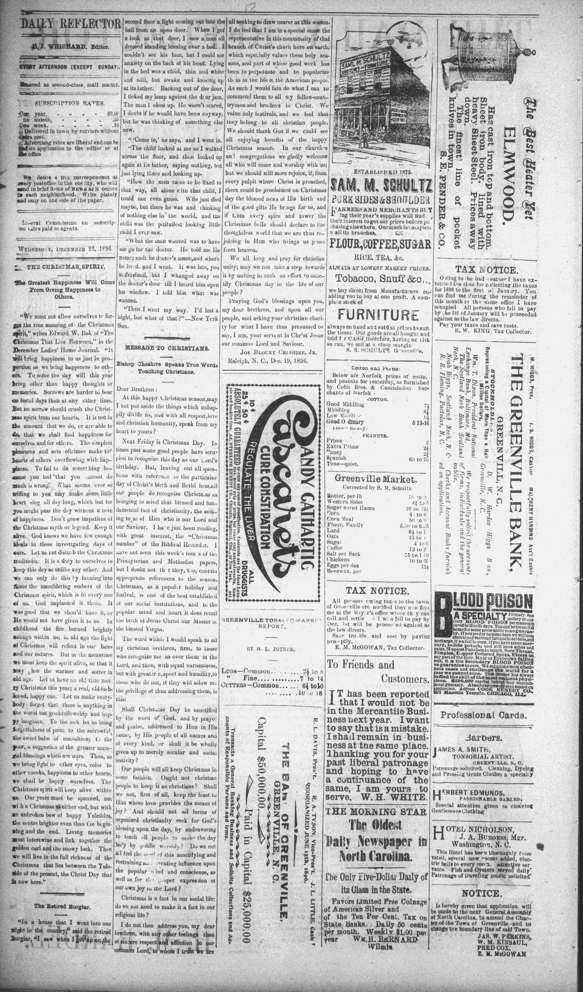 The newspaper was established in 1882, and was originally named the Eastern Reflector. It was founded by Julian Whichard and David Jordan with equipment they purchased from The Greenville Express. On December 10, 1894, it adopted the name The Reflector and began publishing every day. Cox Newspapers acquired The Daily Reflector in 1996. Creator: Daily Reflector (Greenville, N.C.) - December 23, 1896