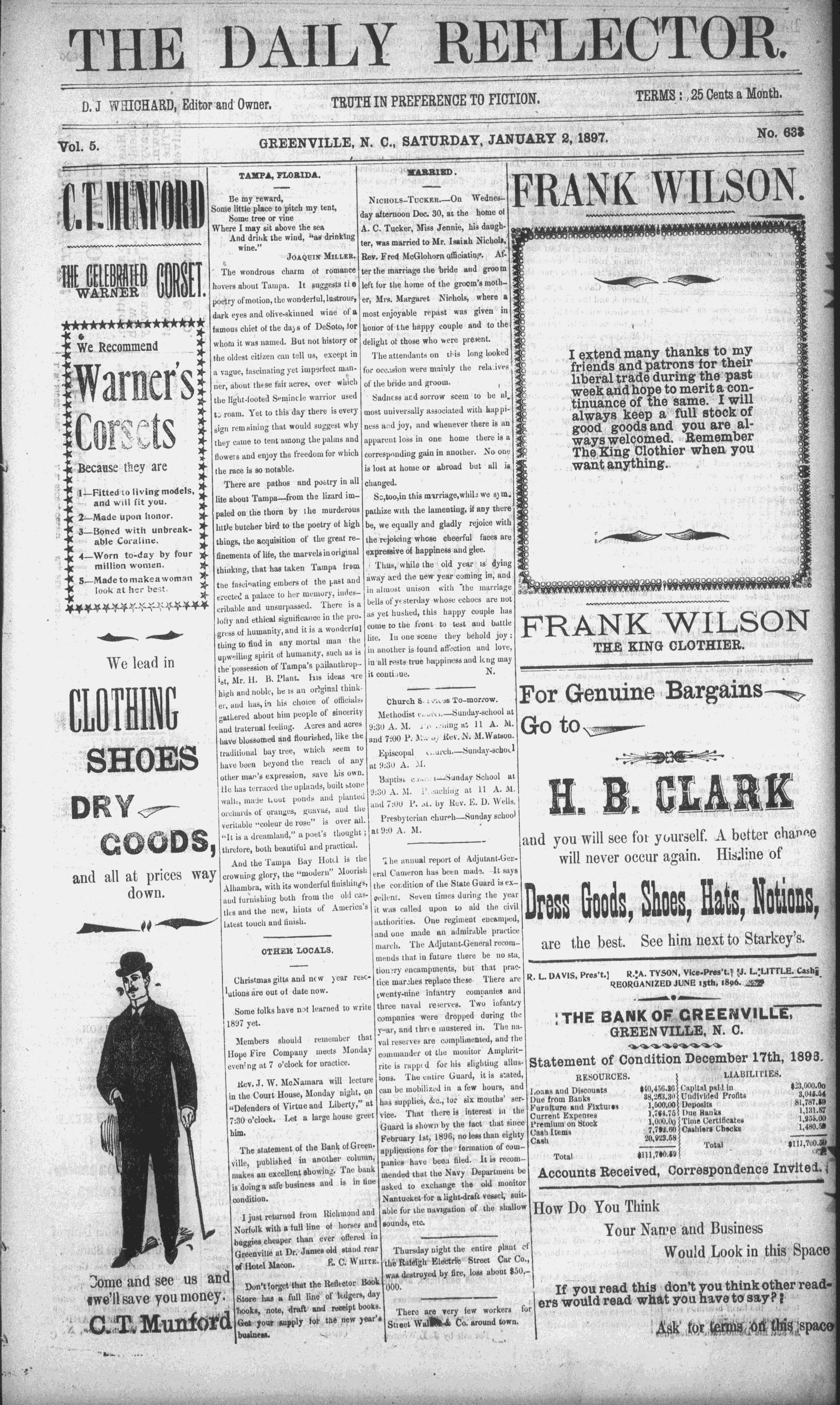 = 5. GREENVILLE, N. C., SATURDAY, JANUARY 2, 1897. No. 633