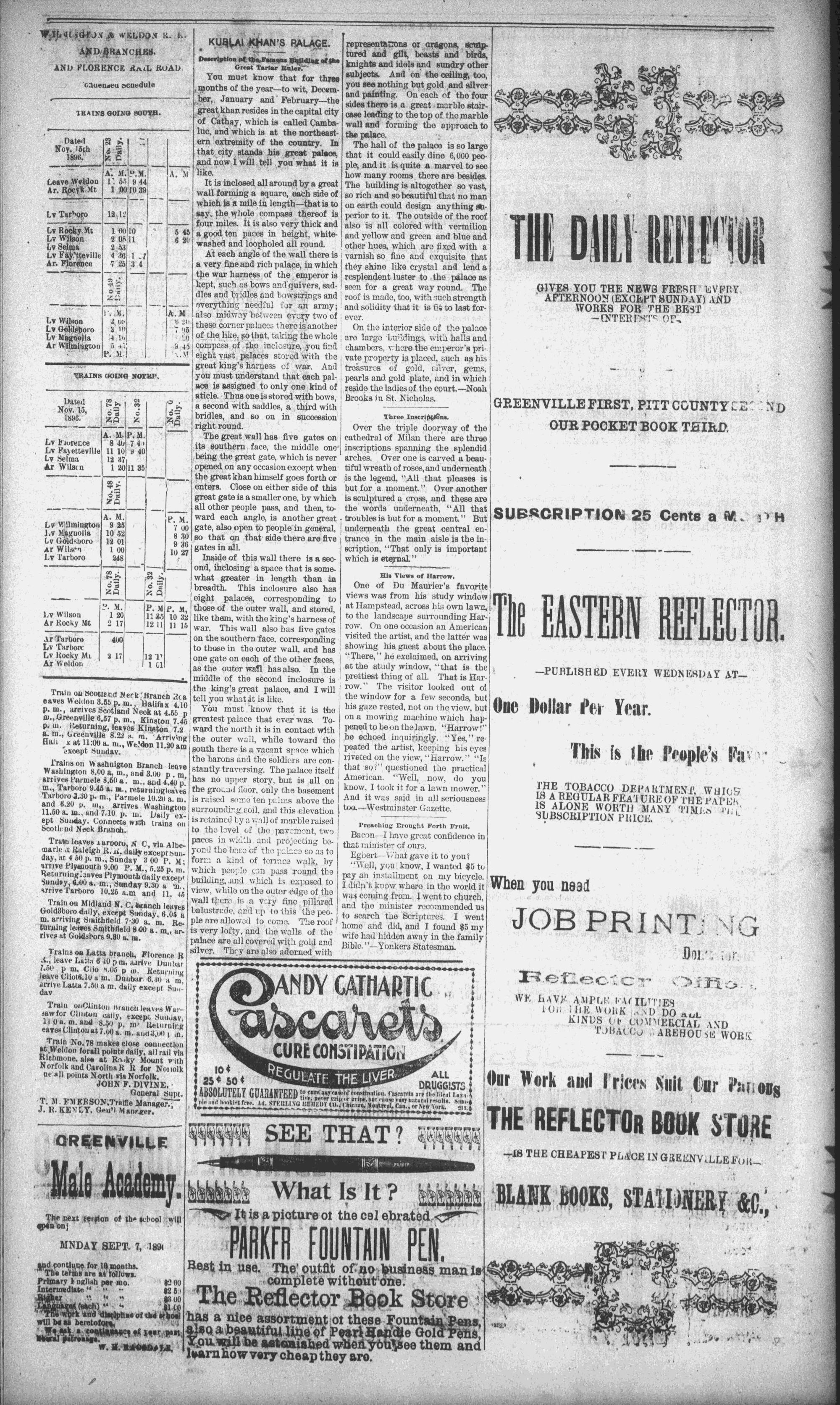 The newspaper was established in 1882, and was originally named the Eastern Reflector. It was founded by Julian Whichard and David Jordan with equipment they purchased from The Greenville Express. On December 10, 1894, it adopted the name The Reflector and began publishing every day. Cox Newspapers acquired The Daily Reflector in 1996. Creator: Daily Reflector (Greenville, N.C.) - January 7, 1897