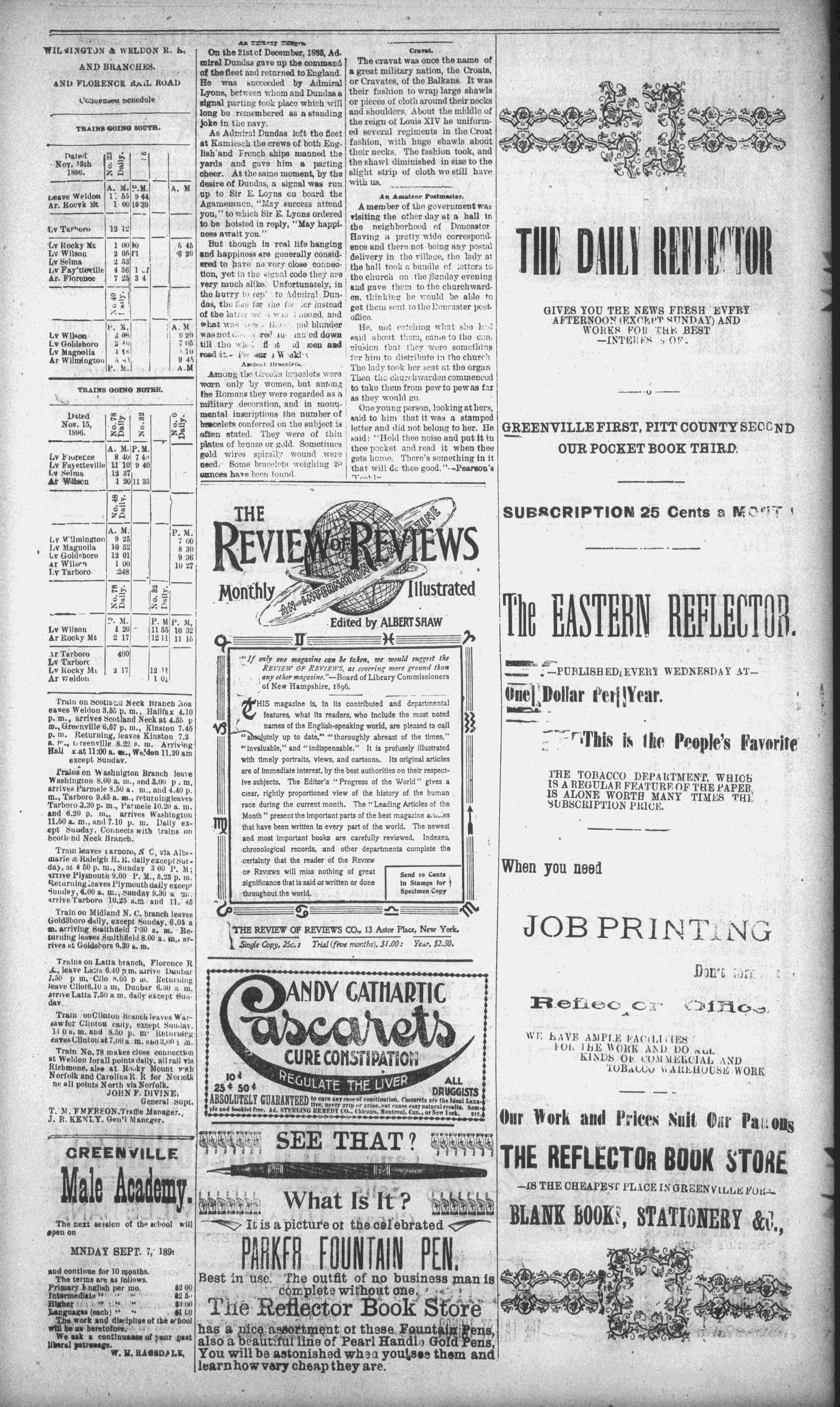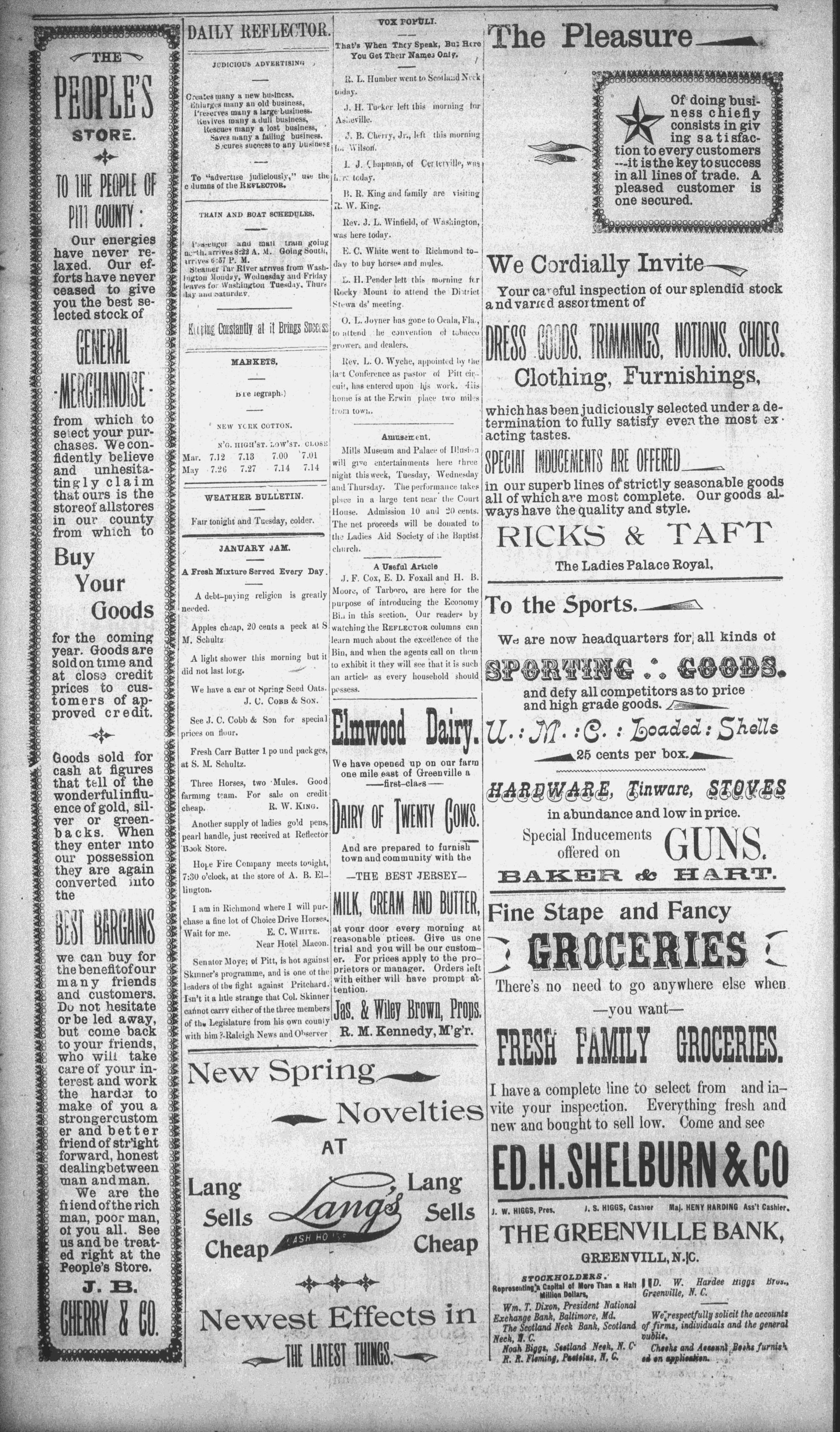 The newspaper was established in 1882, and was originally named the Eastern Reflector. It was founded by Julian Whichard and David Jordan with equipment they purchased from The Greenville Express. On December 10, 1894, it adopted the name The Reflector and began publishing every day. Cox Newspapers acquired The Daily Reflector in 1996. Creator: Daily Reflector (Greenville, N.C.) - January 11, 1897