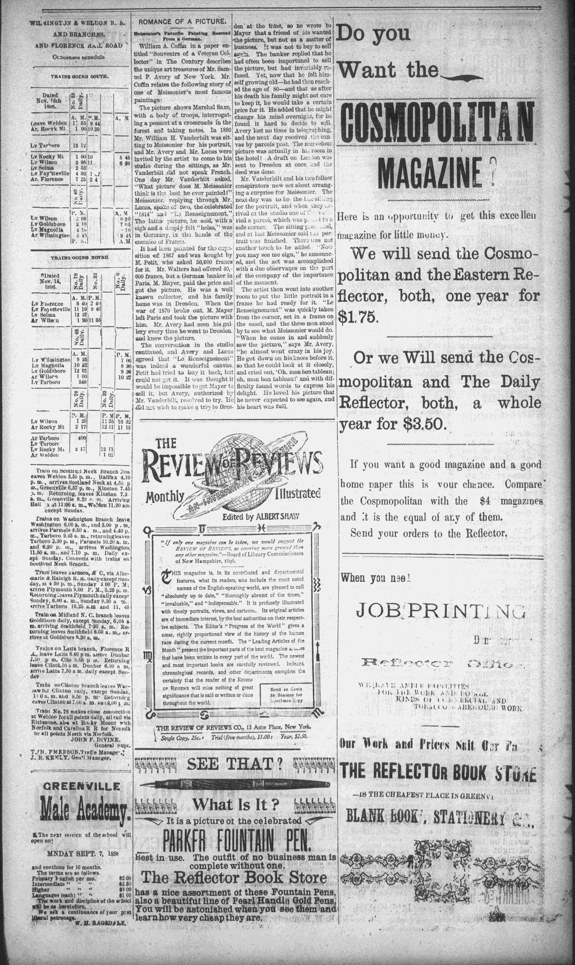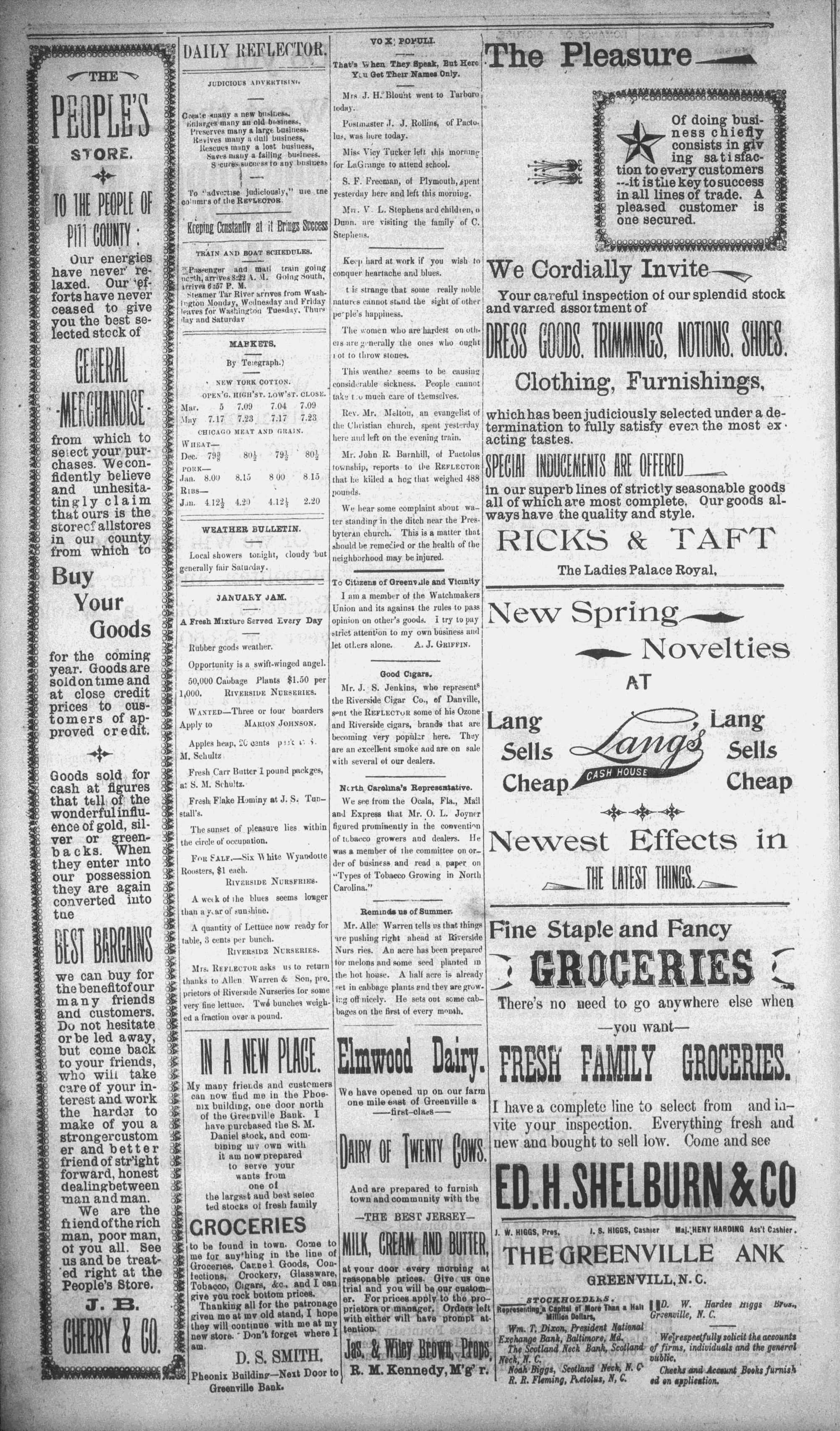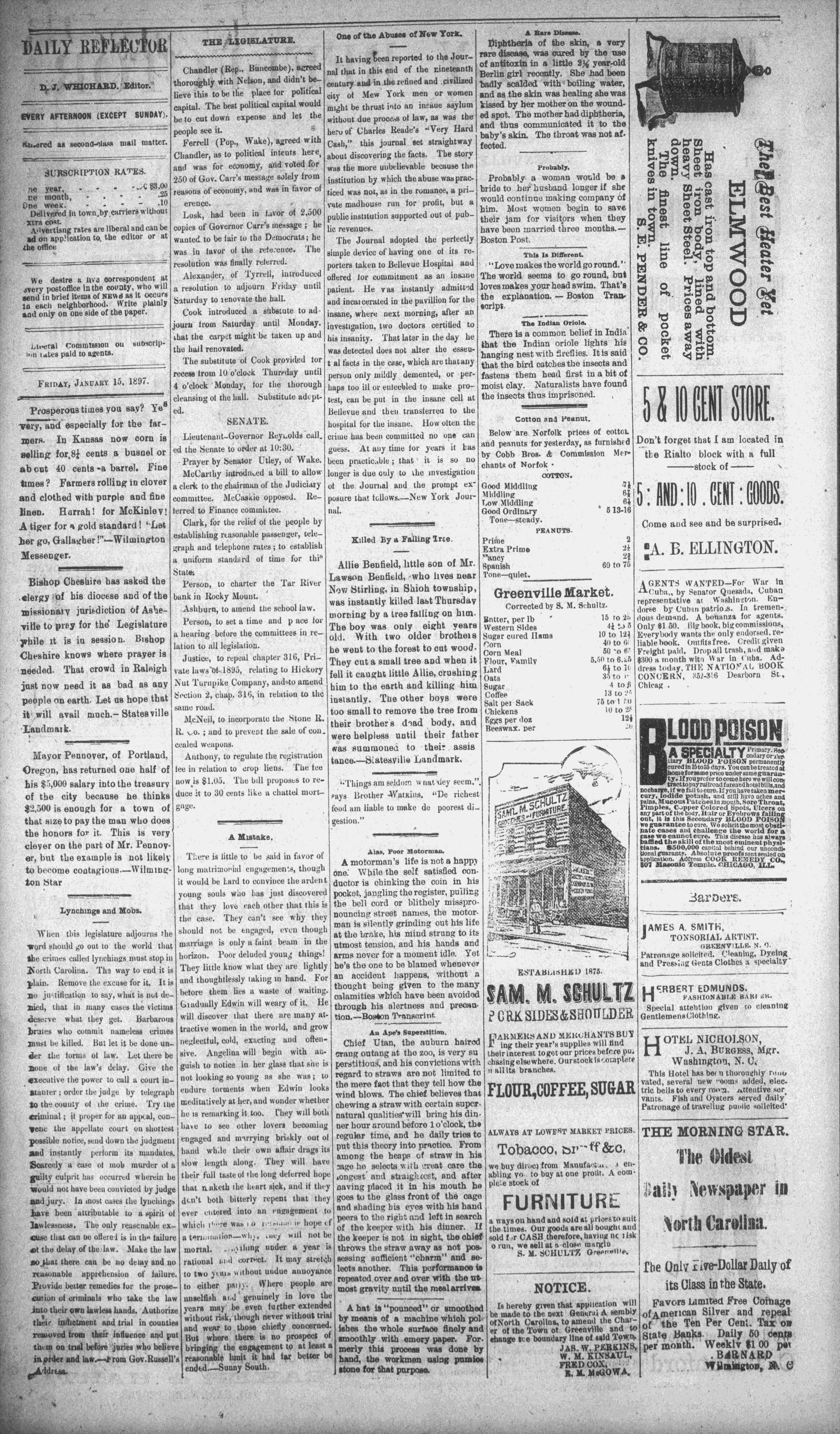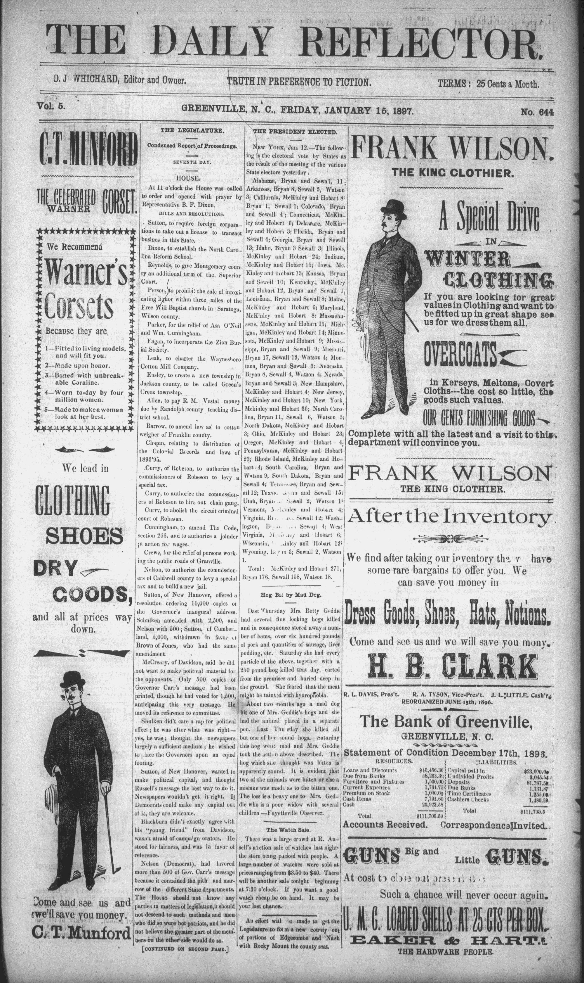 The newspaper was established in 1882, and was originally named the Eastern Reflector. It was founded by Julian Whichard and David Jordan with equipment they purchased from The Greenville Express. On December 10, 1894, it adopted the name The Reflector and began publishing every day. Cox Newspapers acquired The Daily Reflector in 1996. Creator: Daily Reflector (Greenville, N.C.) - January 15, 1897