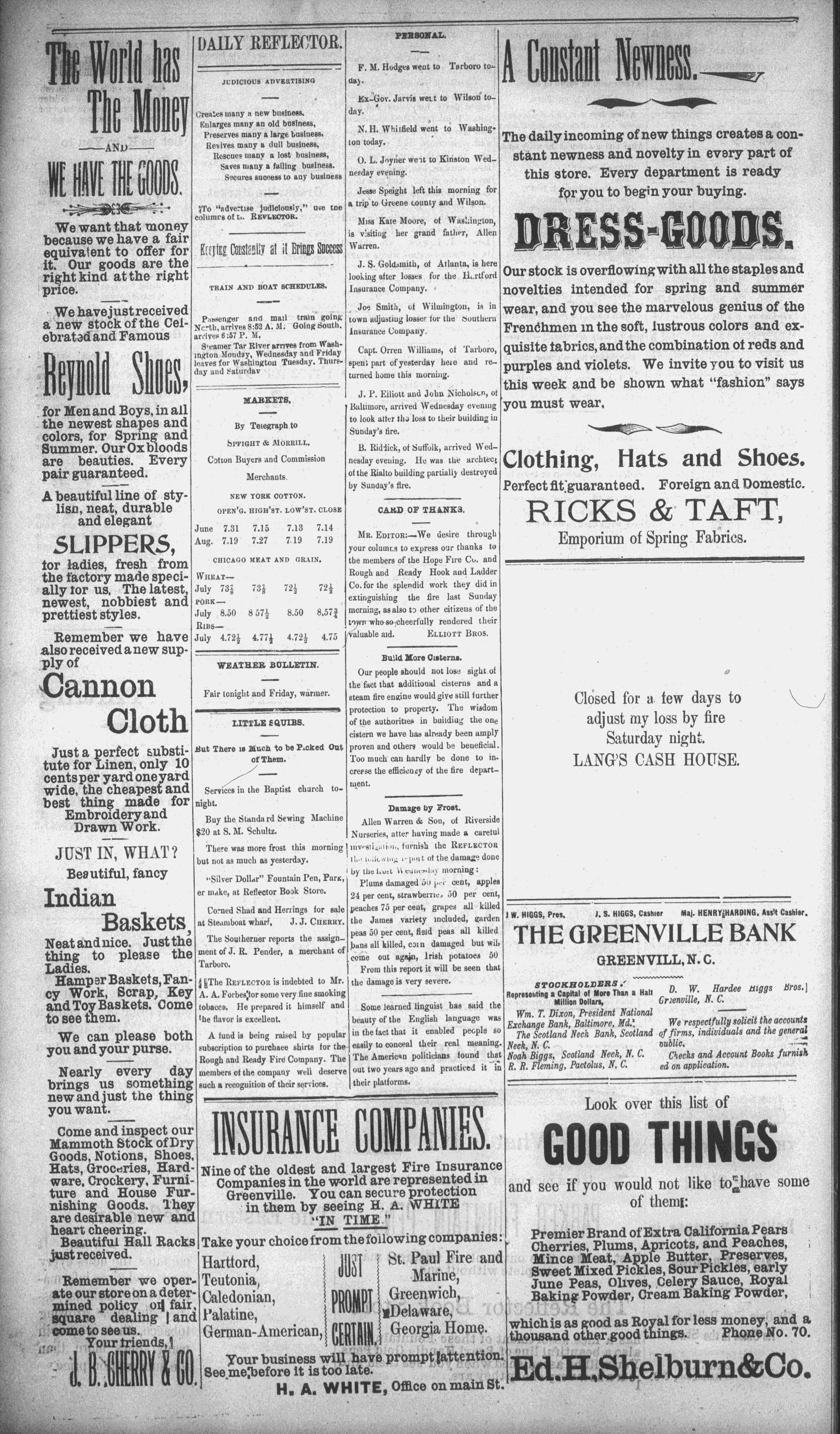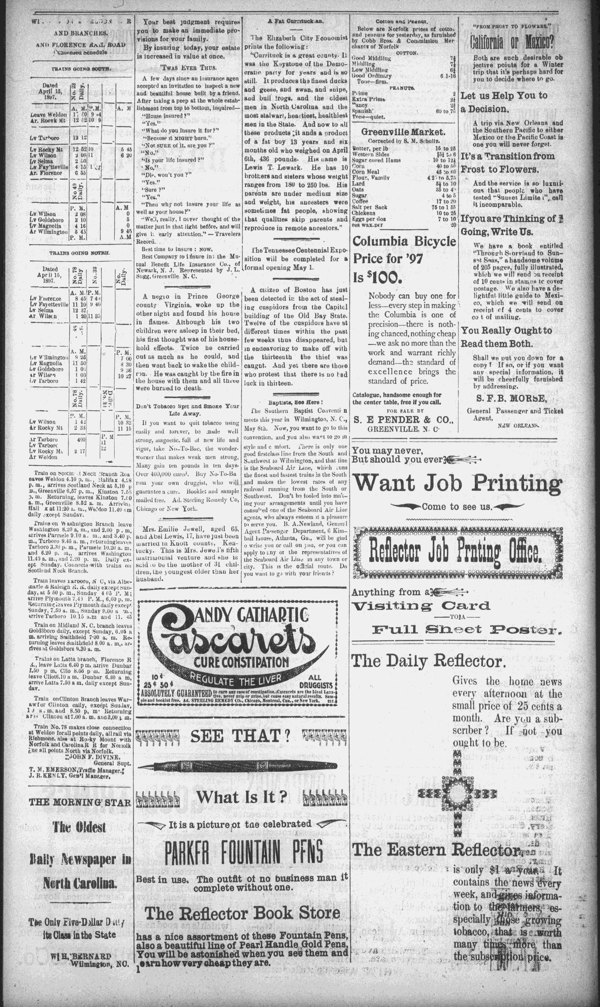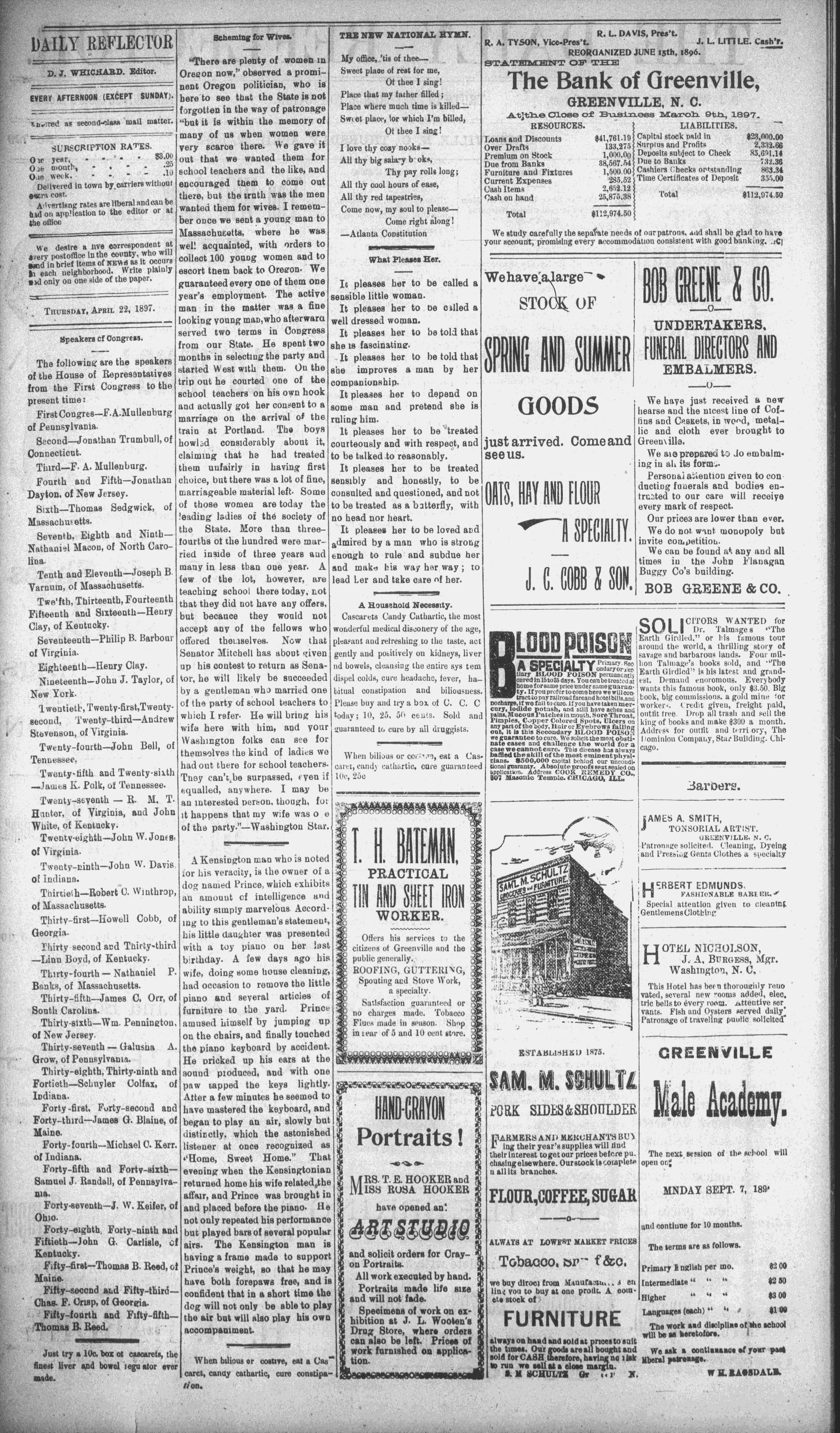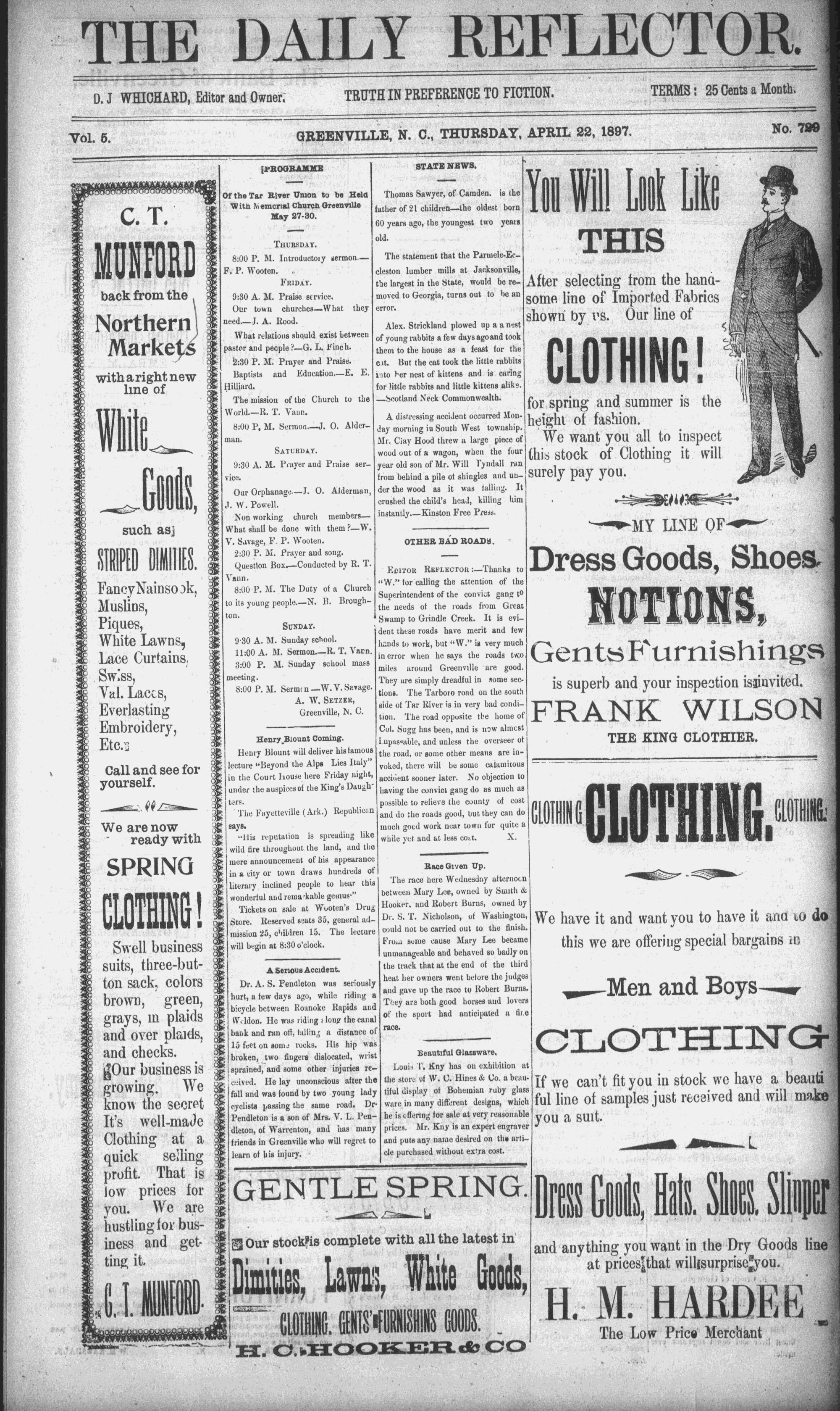 The newspaper was established in 1882, and was originally named the Eastern Reflector. It was founded by Julian Whichard and David Jordan with equipment they purchased from The Greenville Express. On December 10, 1894, it adopted the name The Reflector and began publishing every day. Cox Newspapers acquired The Daily Reflector in 1996. Creator: Daily Reflector (Greenville, N.C.) - April 22, 1897