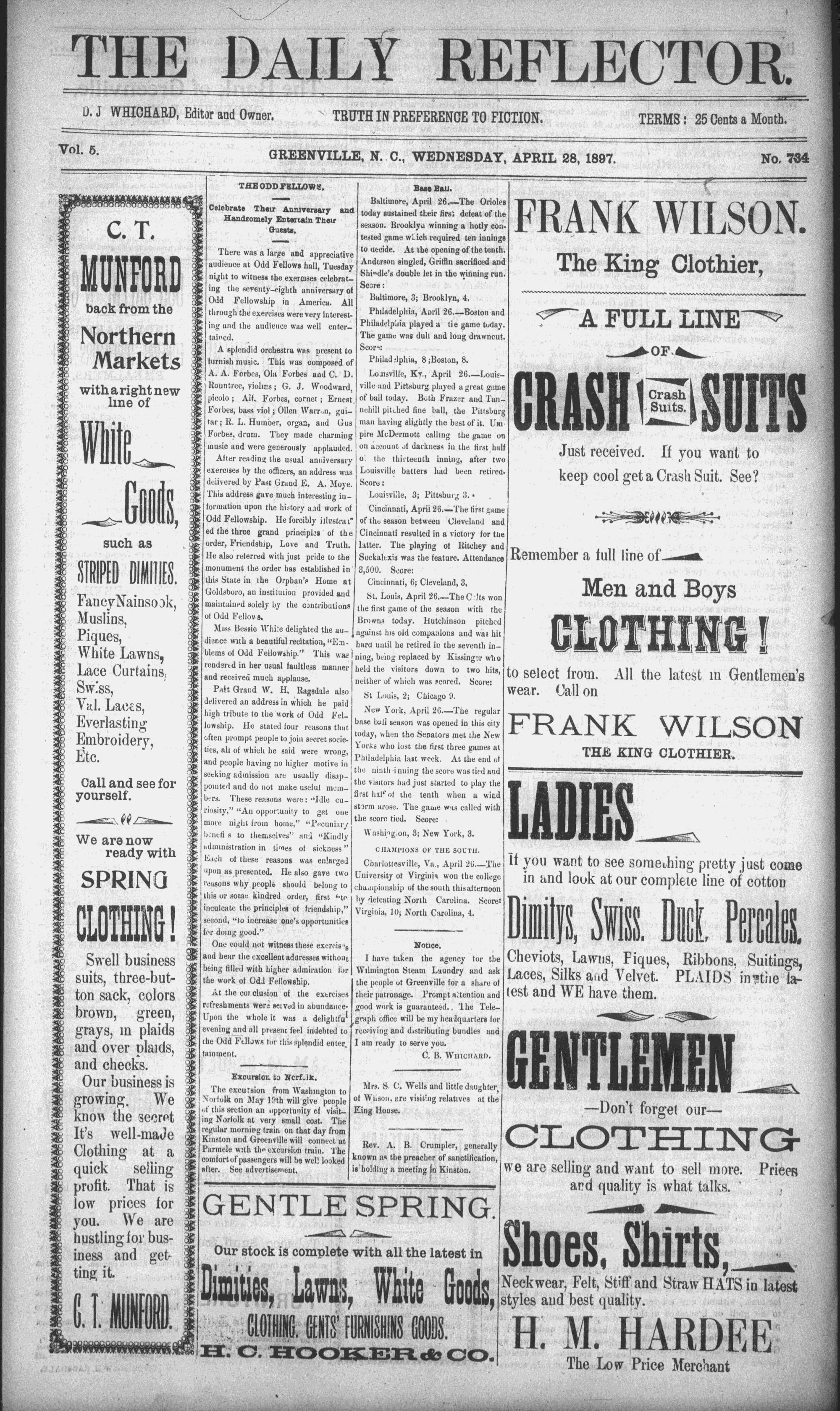 The newspaper was established in 1882, and was originally named the Eastern Reflector. It was founded by Julian Whichard and David Jordan with equipment they purchased from The Greenville Express. On December 10, 1894, it adopted the name The Reflector and began publishing every day. Cox Newspapers acquired The Daily Reflector in 1996. Creator: Daily Reflector (Greenville, N.C.) - April 28, 1897