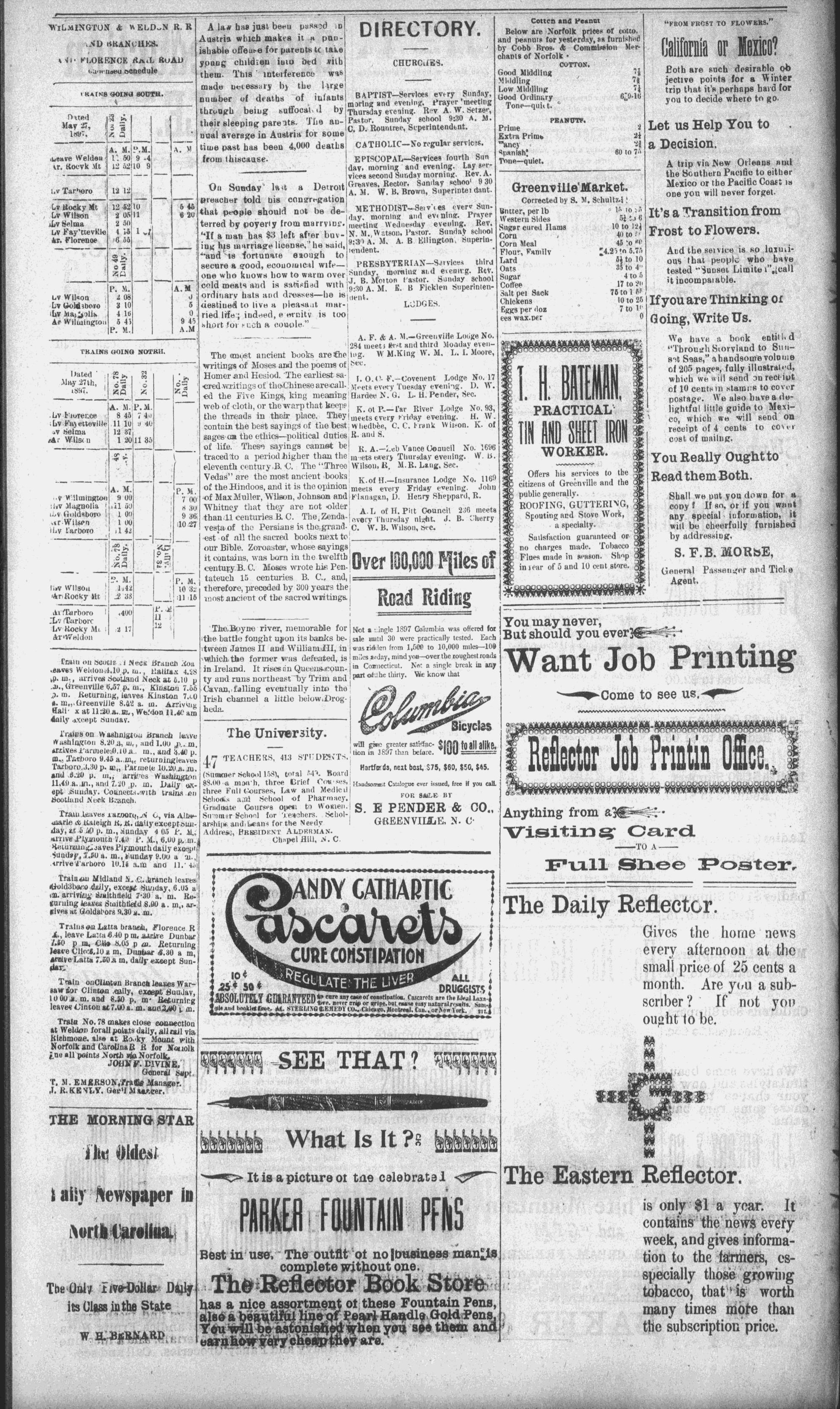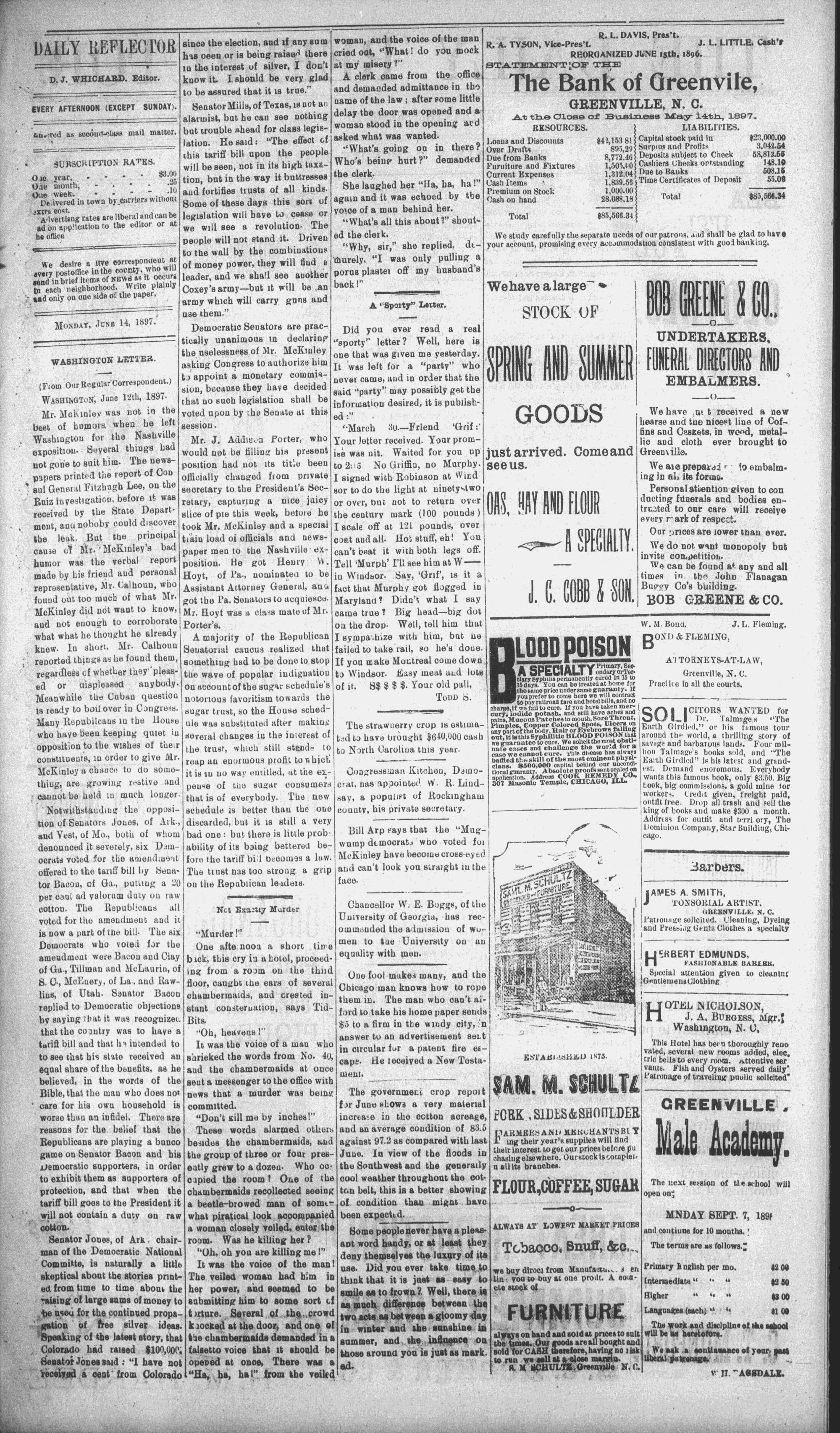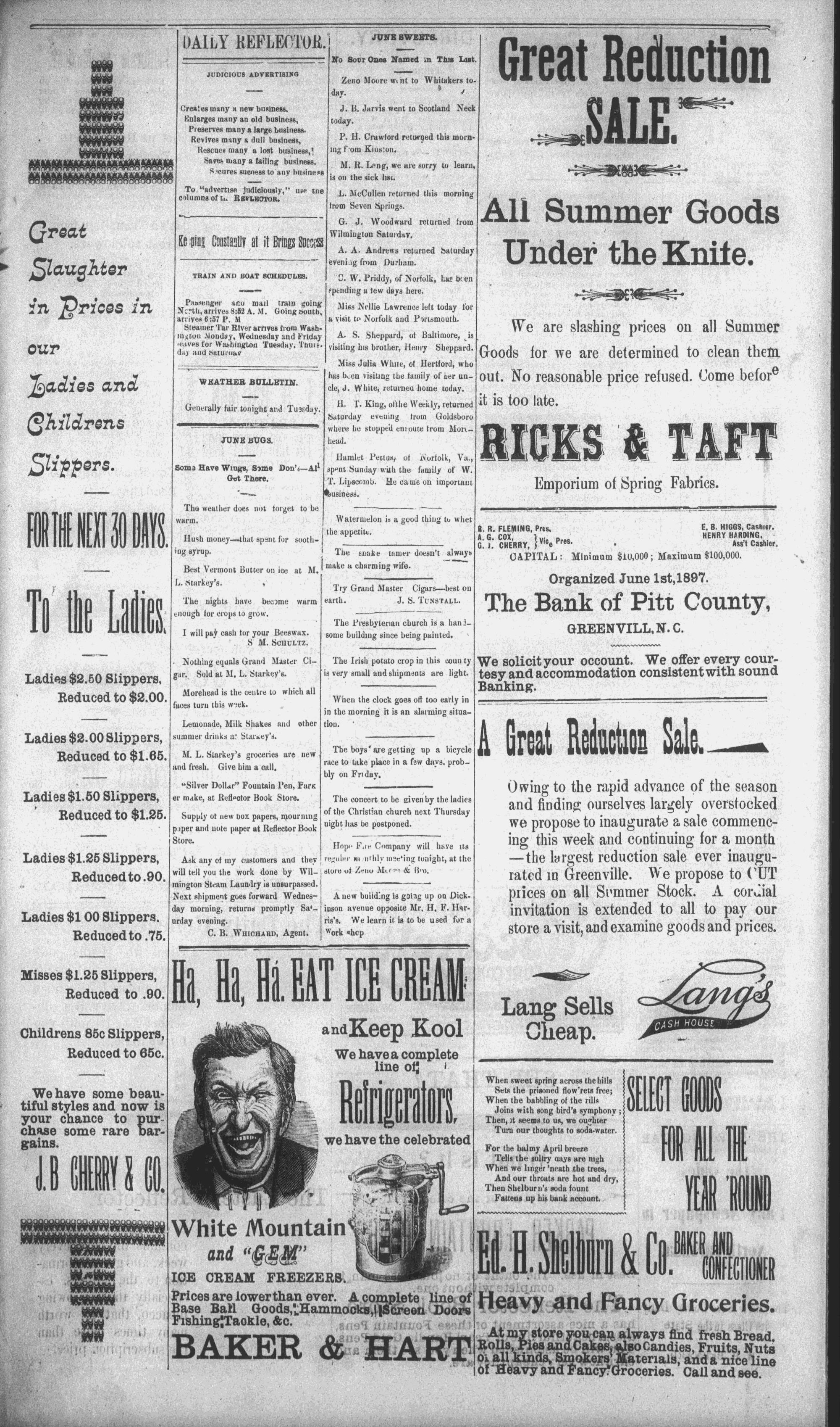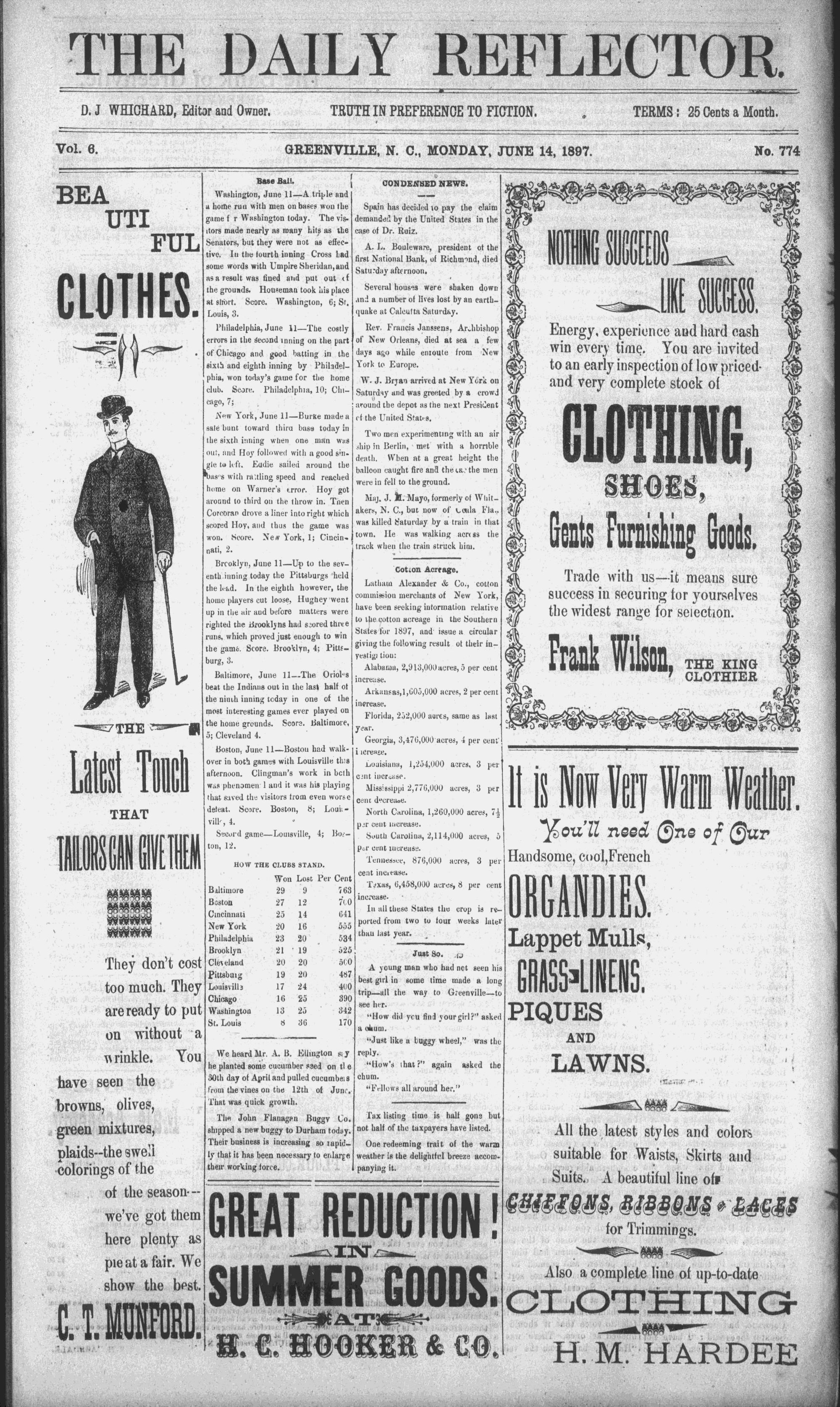 The newspaper was established in 1882, and was originally named the Eastern Reflector. It was founded by Julian Whichard and David Jordan with equipment they purchased from The Greenville Express. On December 10, 1894, it adopted the name The Reflector and began publishing every day. Cox Newspapers acquired The Daily Reflector in 1996. Creator: Daily Reflector (Greenville, N.C.) - June 14, 1897