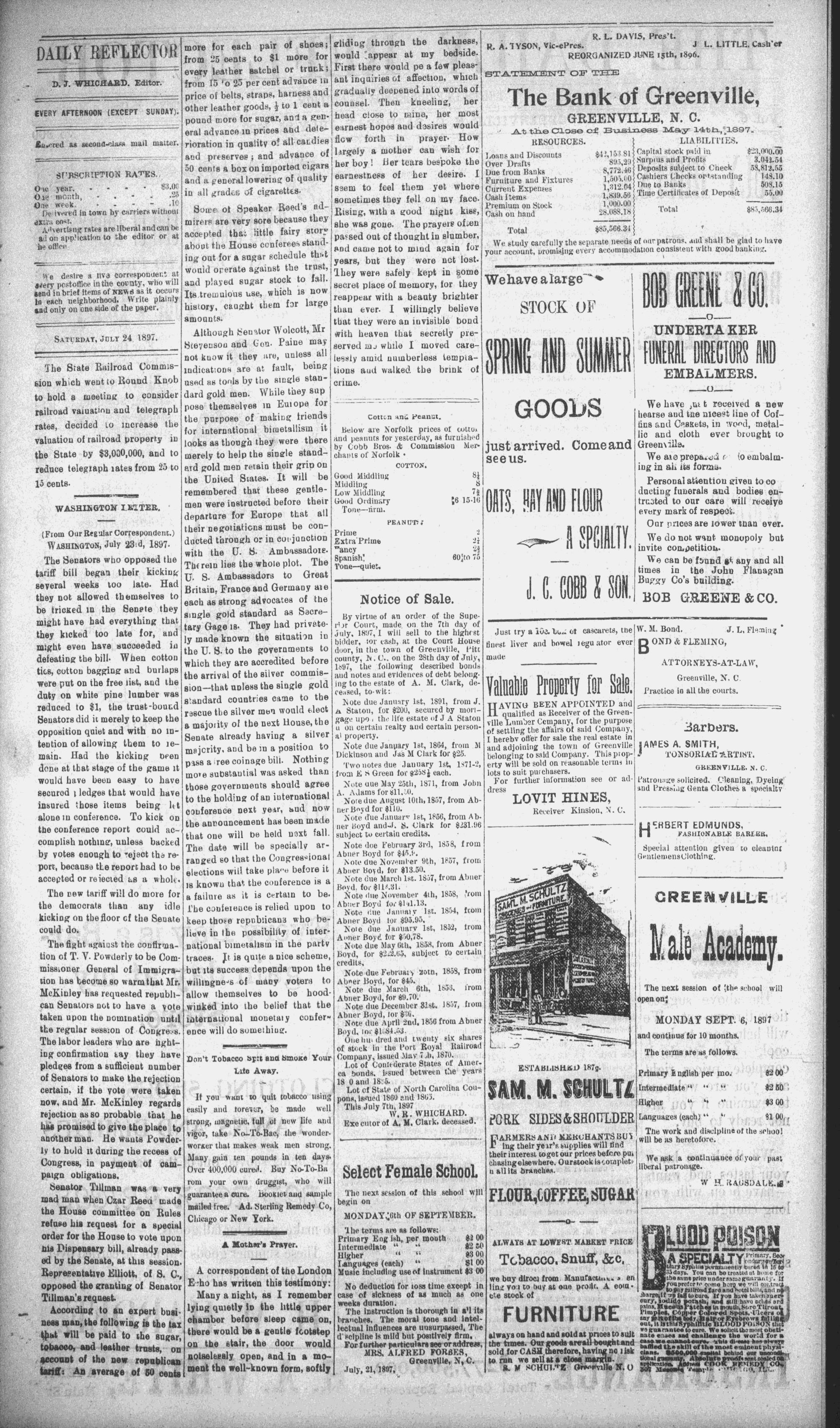 The newspaper was established in 1882, and was originally named the Eastern Reflector. It was founded by Julian Whichard and David Jordan with equipment they purchased from The Greenville Express. On December 10, 1894, it adopted the name The Reflector and began publishing every day. Cox Newspapers acquired The Daily Reflector in 1996. Creator: Daily Reflector (Greenville, N.C.) - July 24, 1897