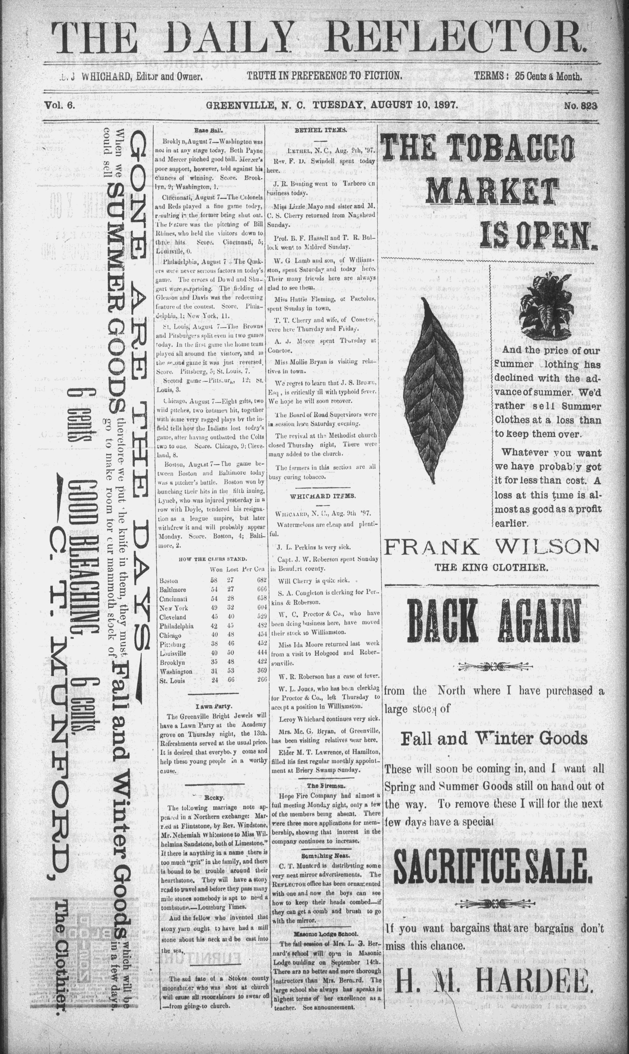 Vol. 6. GREENVILLE, N. C. TUESDAY, AUGUST 10, 1897. | ~No. 823