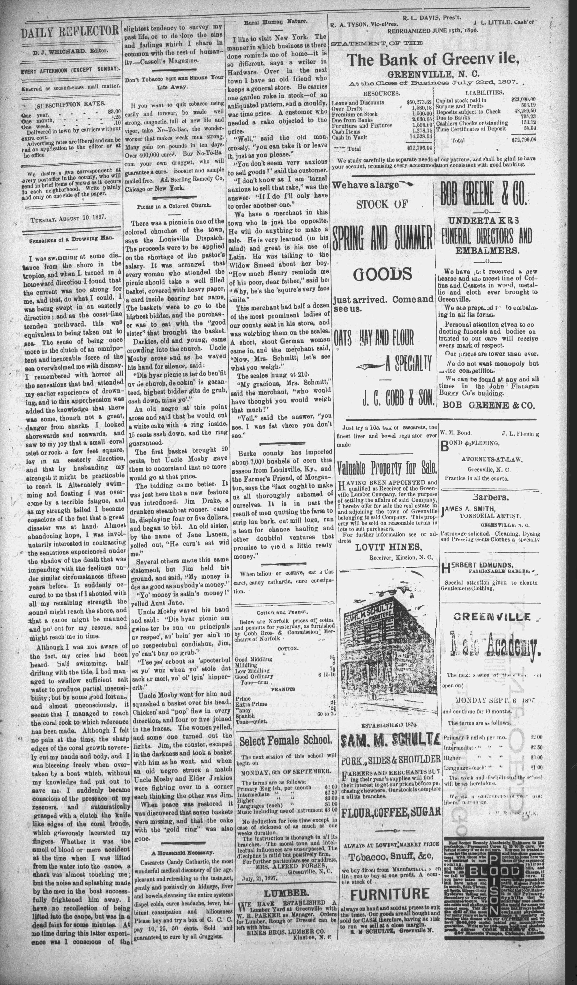 The newspaper was established in 1882, and was originally named the Eastern Reflector. It was founded by Julian Whichard and David Jordan with equipment they purchased from The Greenville Express. On December 10, 1894, it adopted the name The Reflector and began publishing every day. Cox Newspapers acquired The Daily Reflector in 1996. Creator: Daily Reflector (Greenville, N.C.) - August 10, 1897