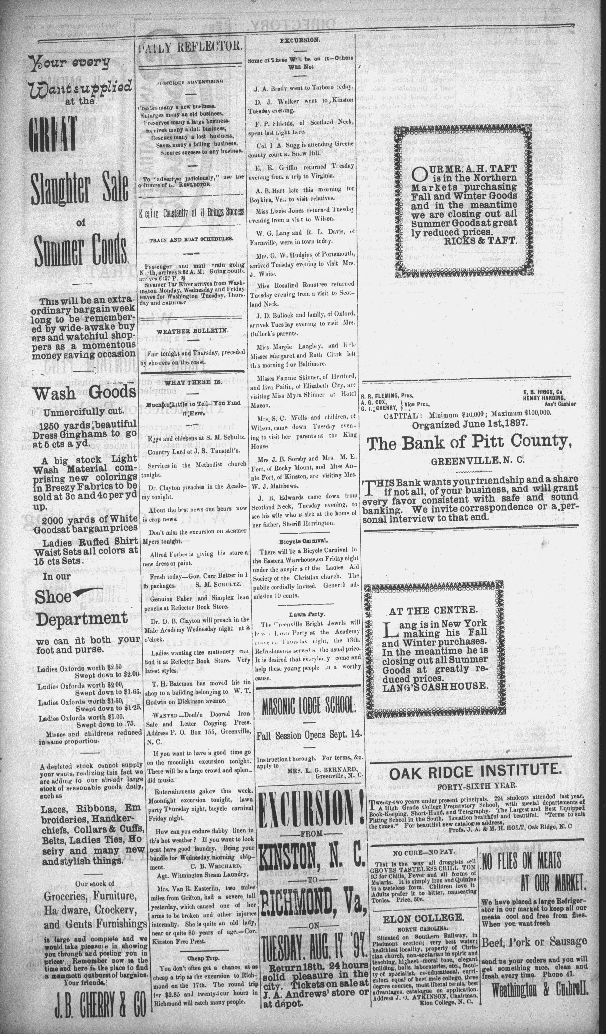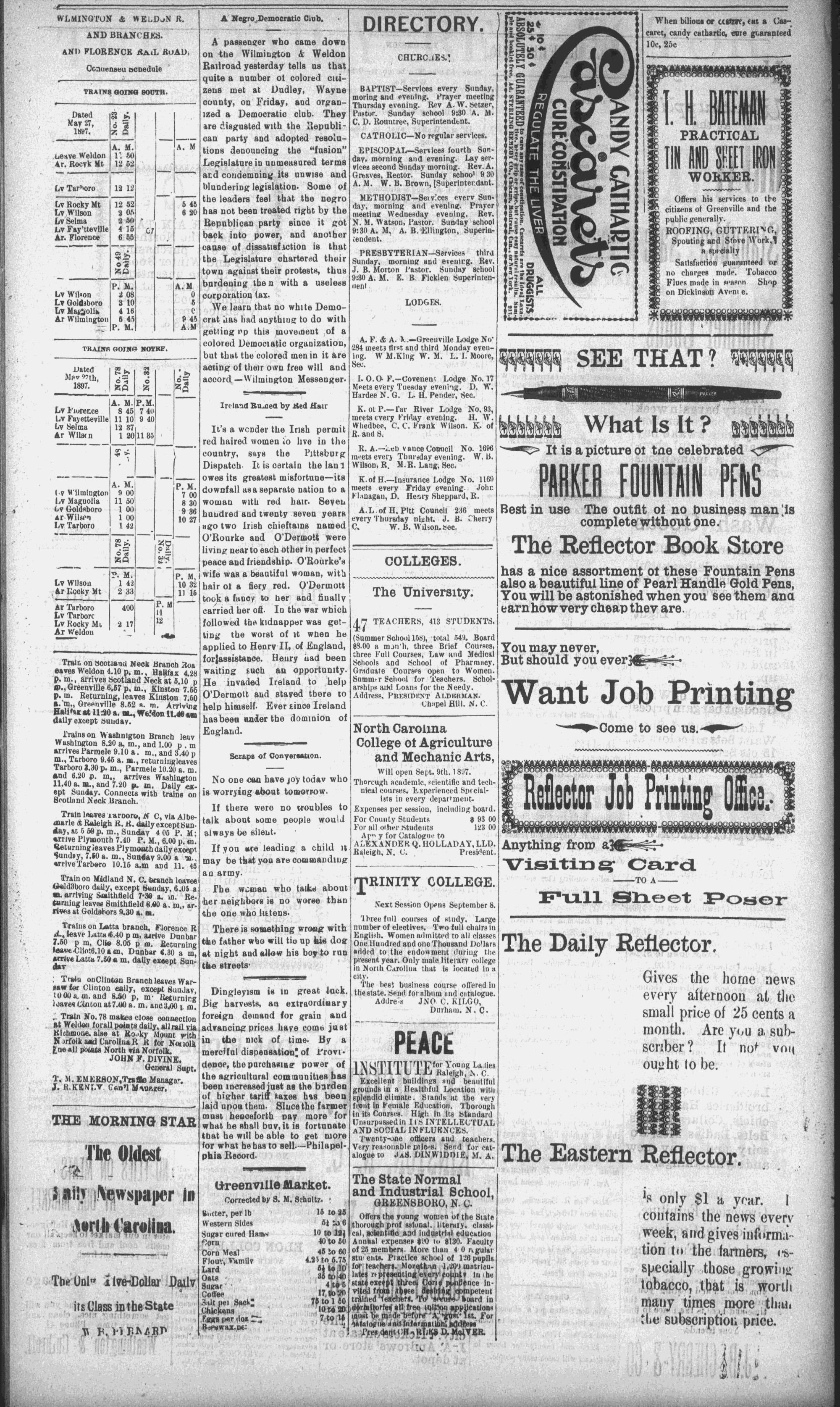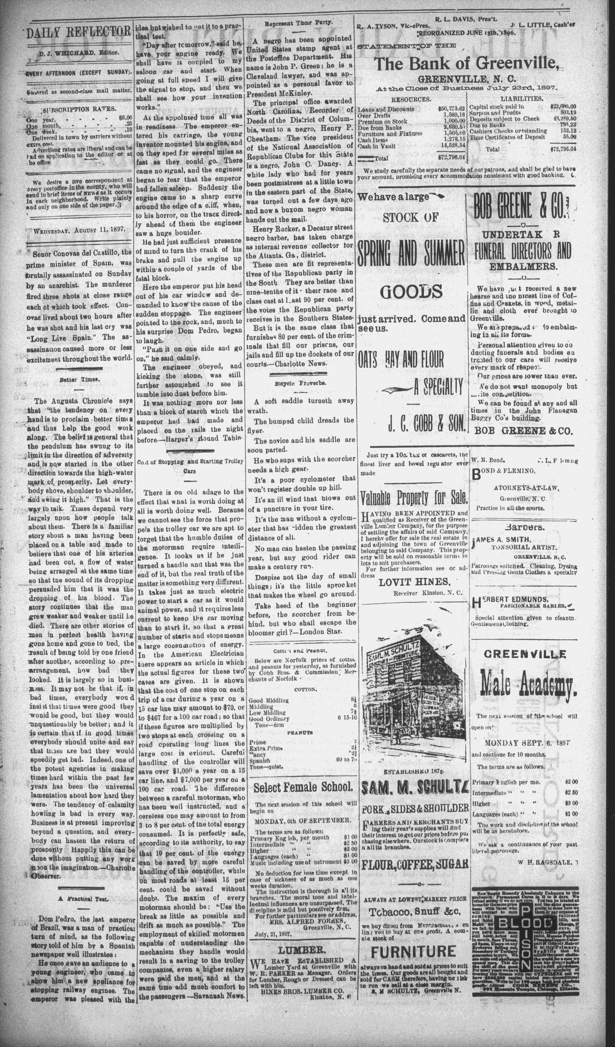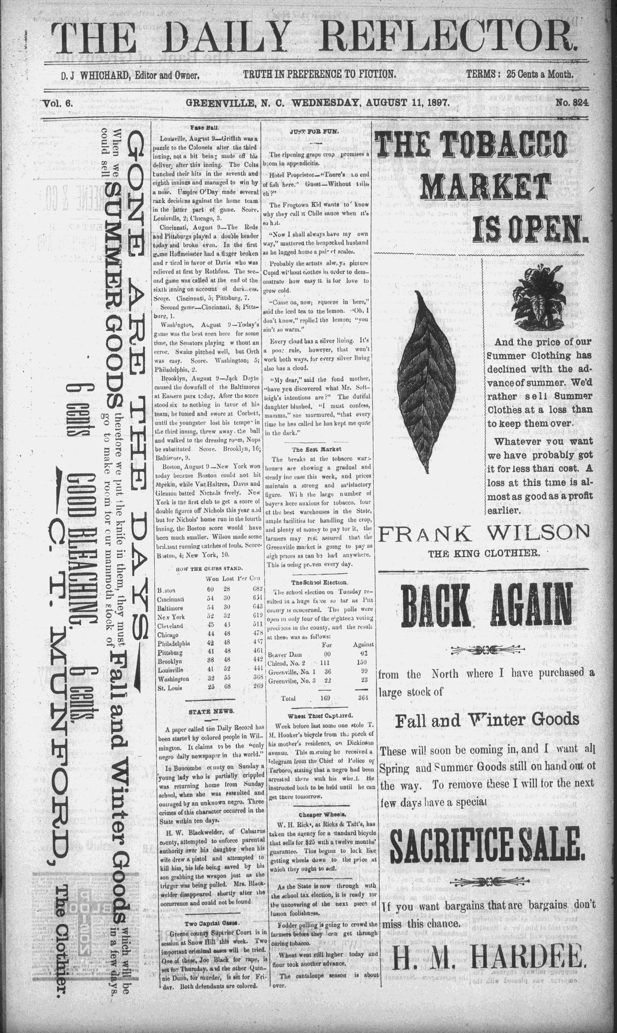 The newspaper was established in 1882, and was originally named the Eastern Reflector. It was founded by Julian Whichard and David Jordan with equipment they purchased from The Greenville Express. On December 10, 1894, it adopted the name The Reflector and began publishing every day. Cox Newspapers acquired The Daily Reflector in 1996. Creator: Daily Reflector (Greenville, N.C.) - August 11, 1897