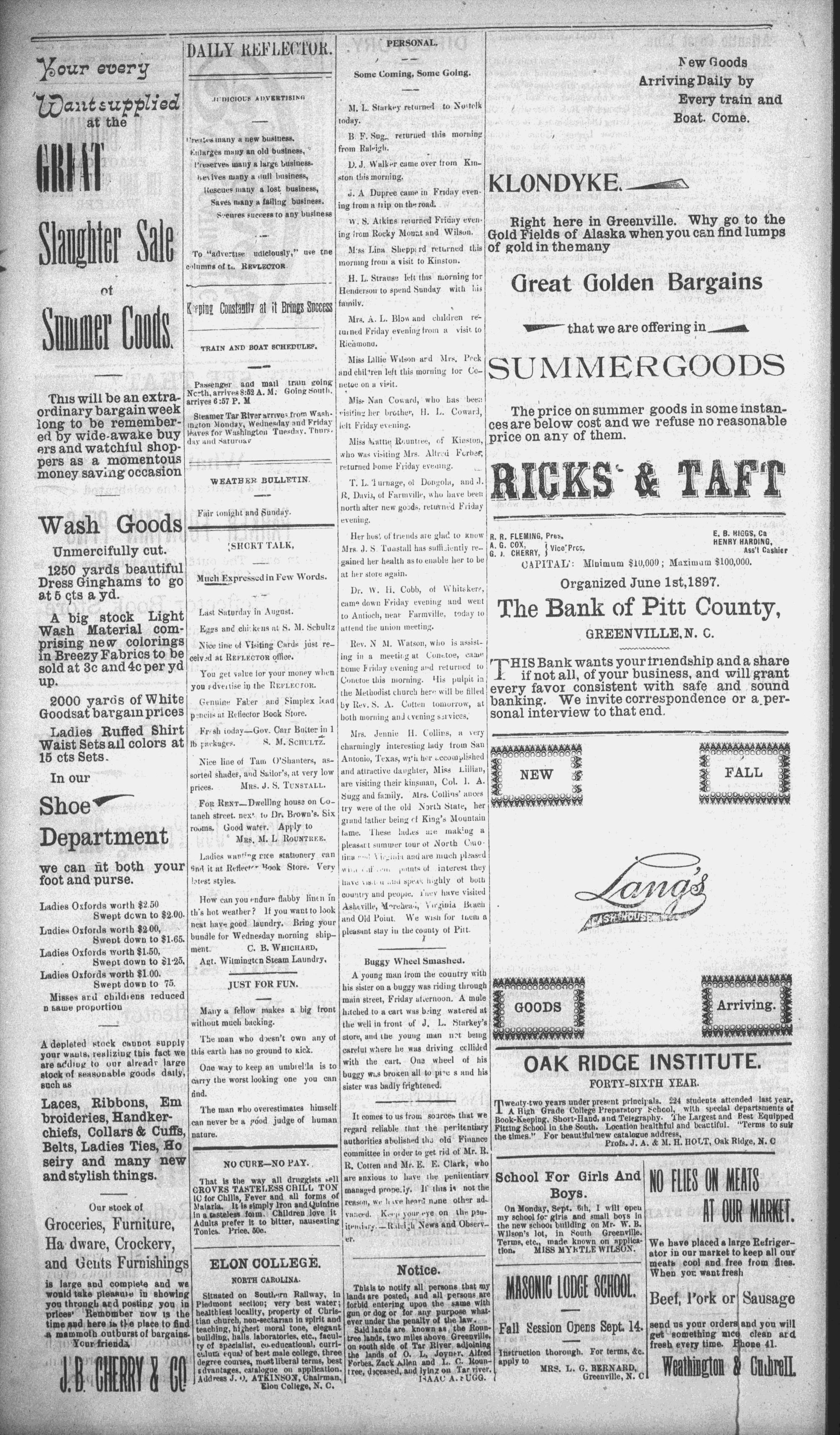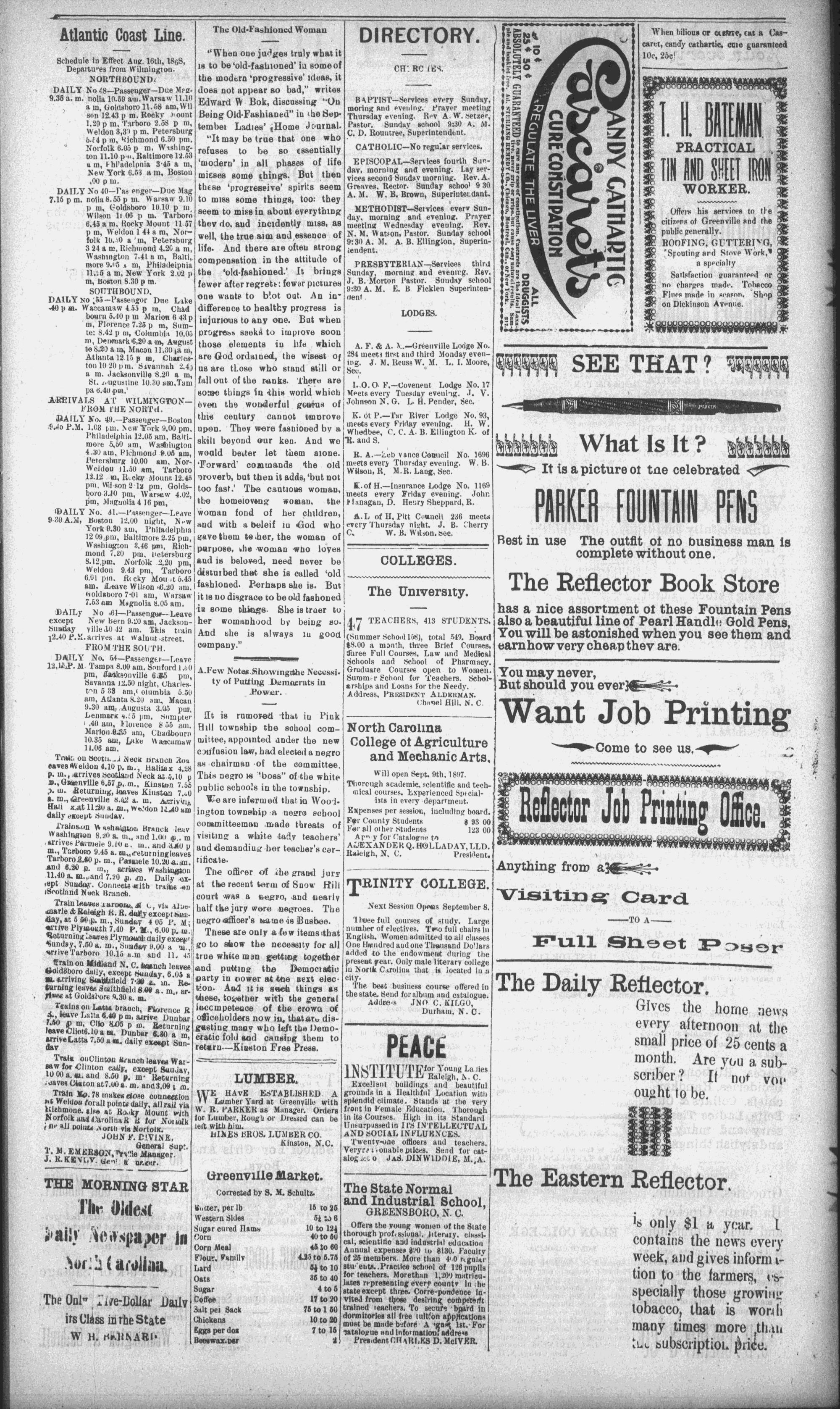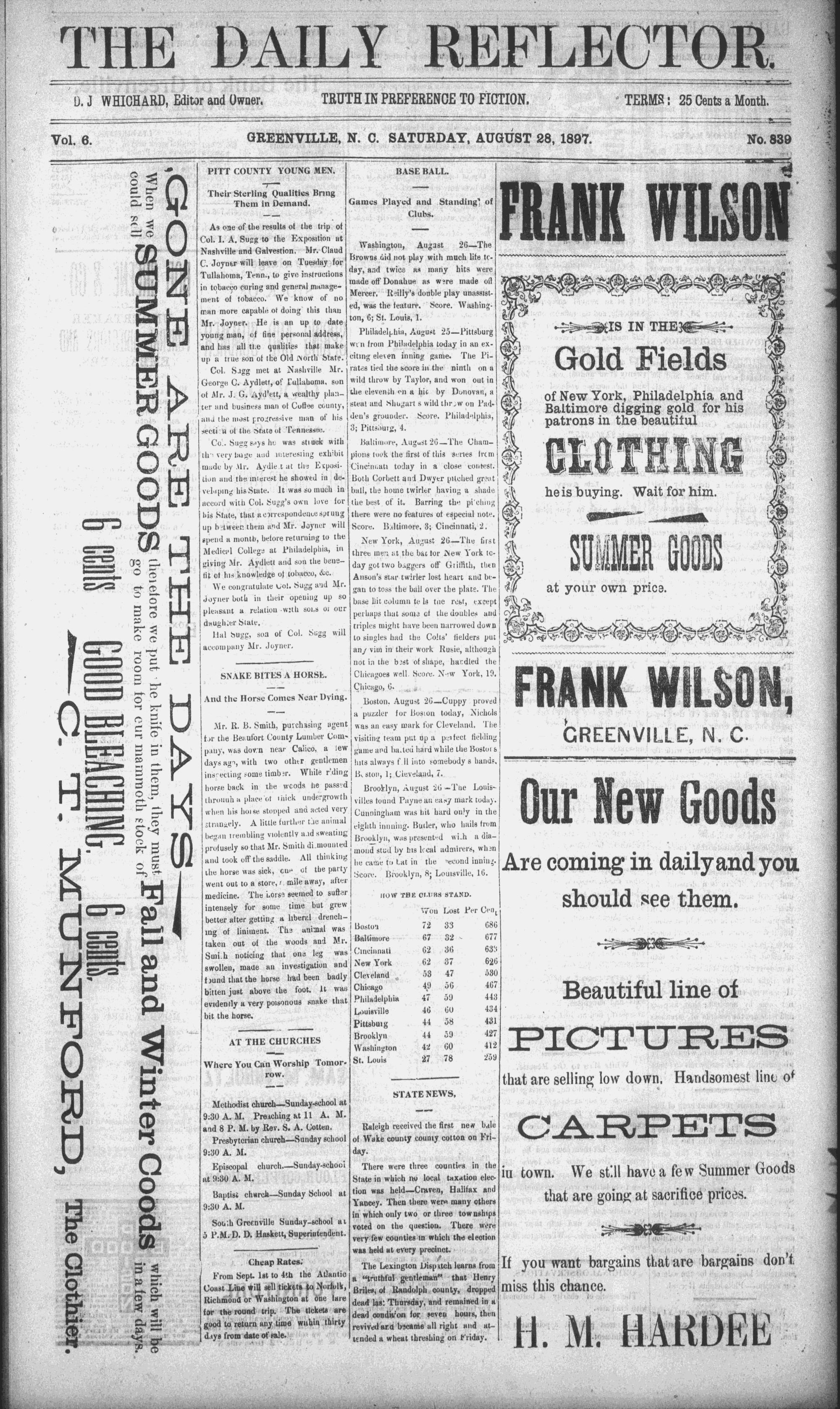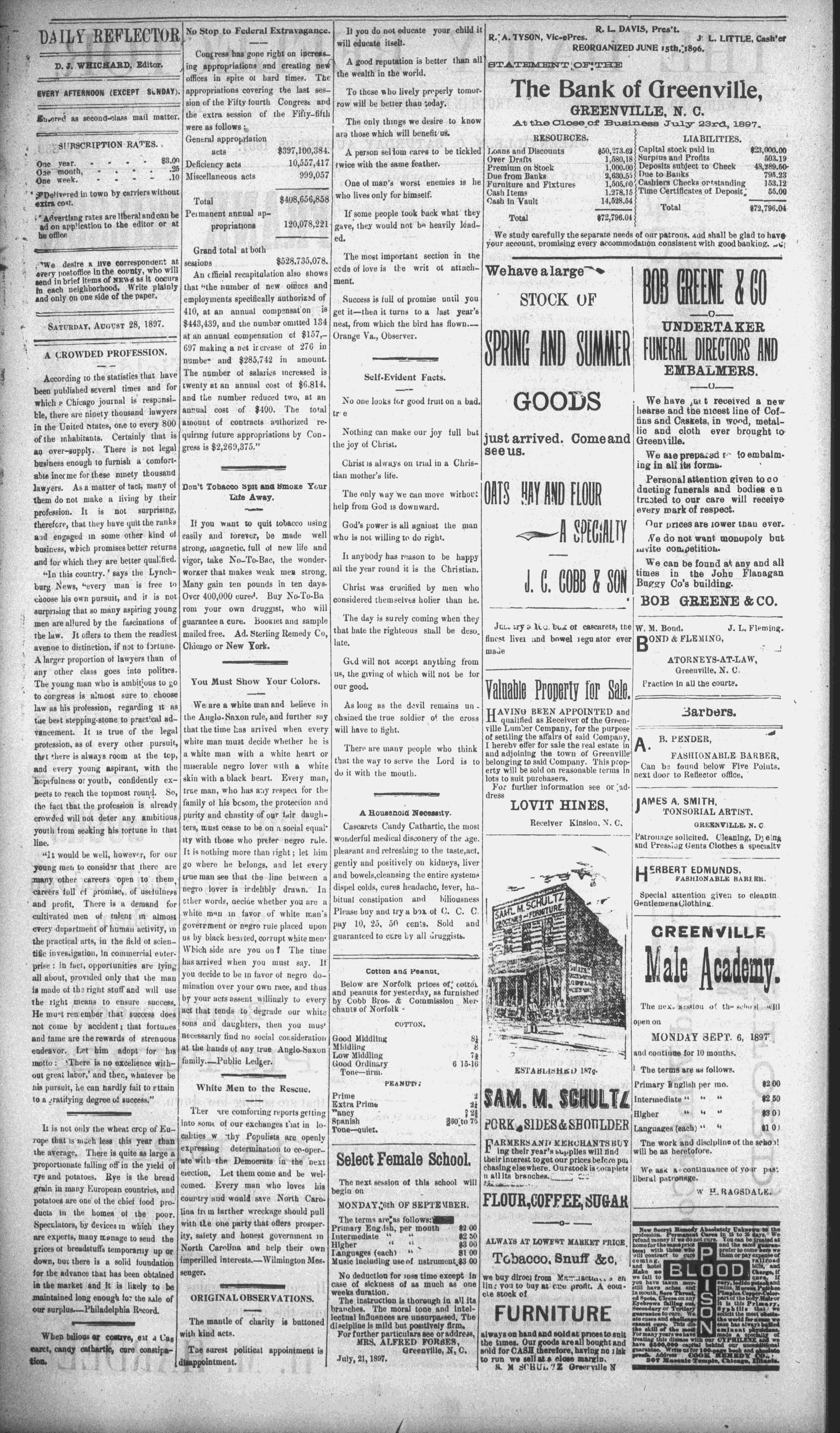 The newspaper was established in 1882, and was originally named the Eastern Reflector. It was founded by Julian Whichard and David Jordan with equipment they purchased from The Greenville Express. On December 10, 1894, it adopted the name The Reflector and began publishing every day. Cox Newspapers acquired The Daily Reflector in 1996. Creator: Daily Reflector (Greenville, N.C.) - August 28, 1897
