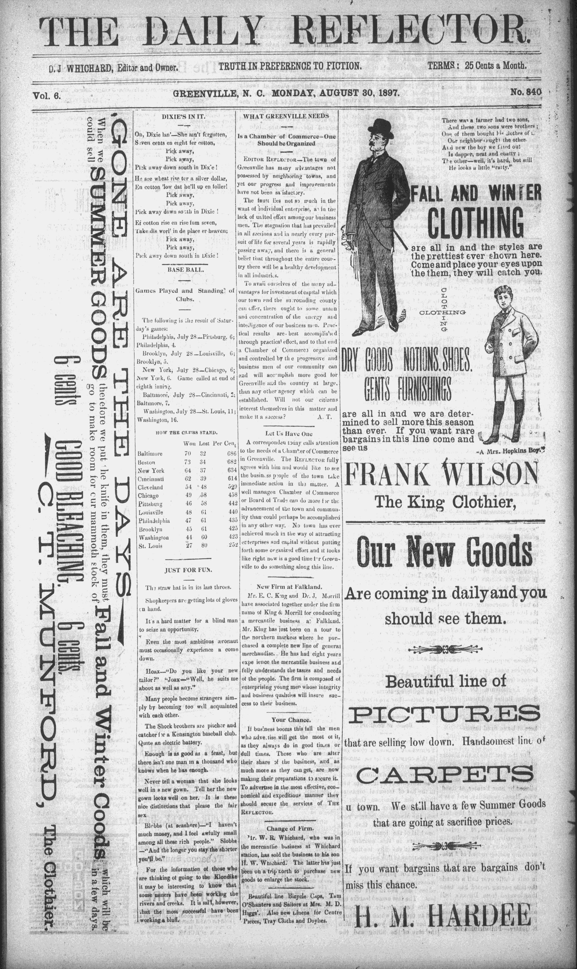 The newspaper was established in 1882, and was originally named the Eastern Reflector. It was founded by Julian Whichard and David Jordan with equipment they purchased from The Greenville Express. On December 10, 1894, it adopted the name The Reflector and began publishing every day. Cox Newspapers acquired The Daily Reflector in 1996. Creator: Daily Reflector (Greenville, N.C.) - August 30, 1897