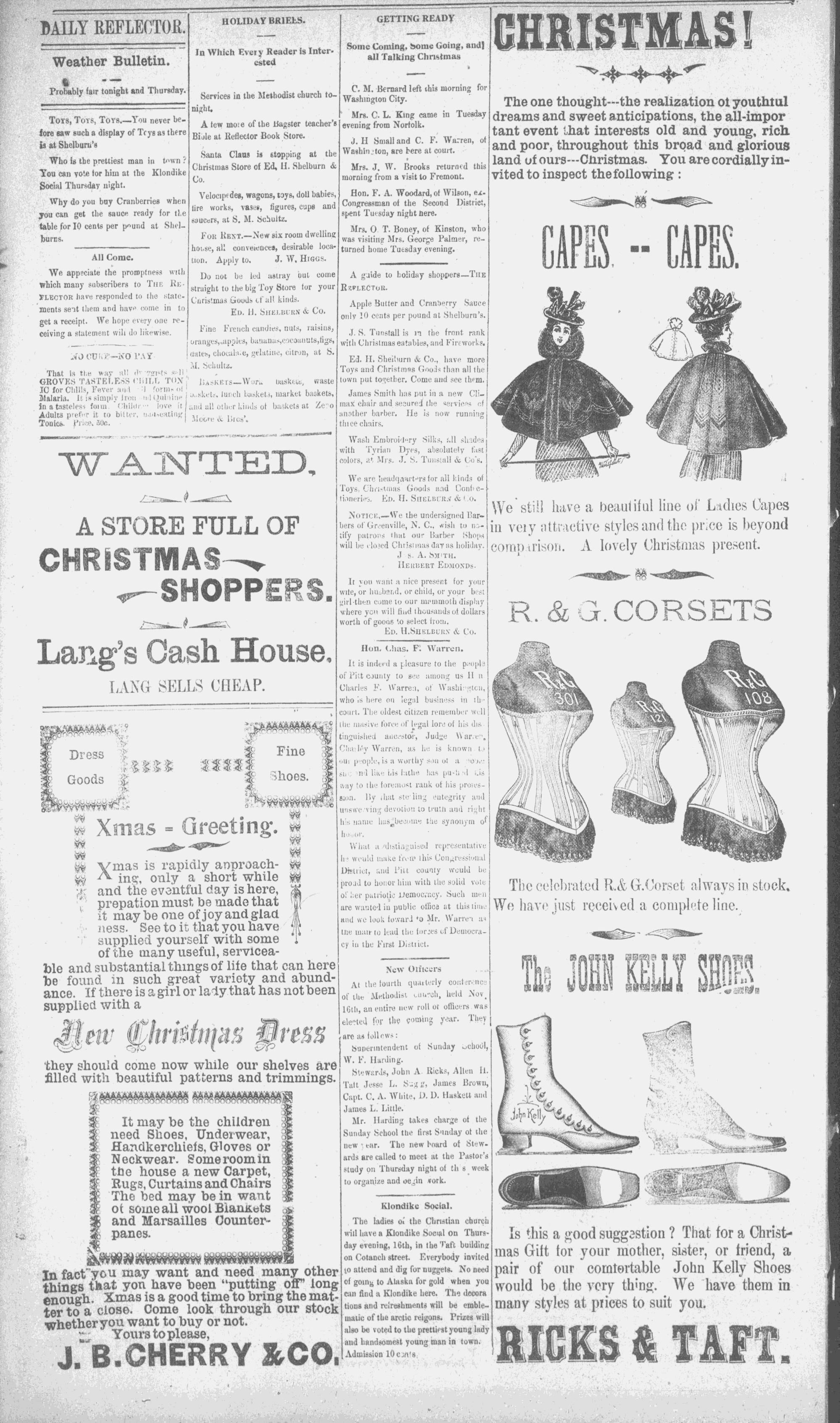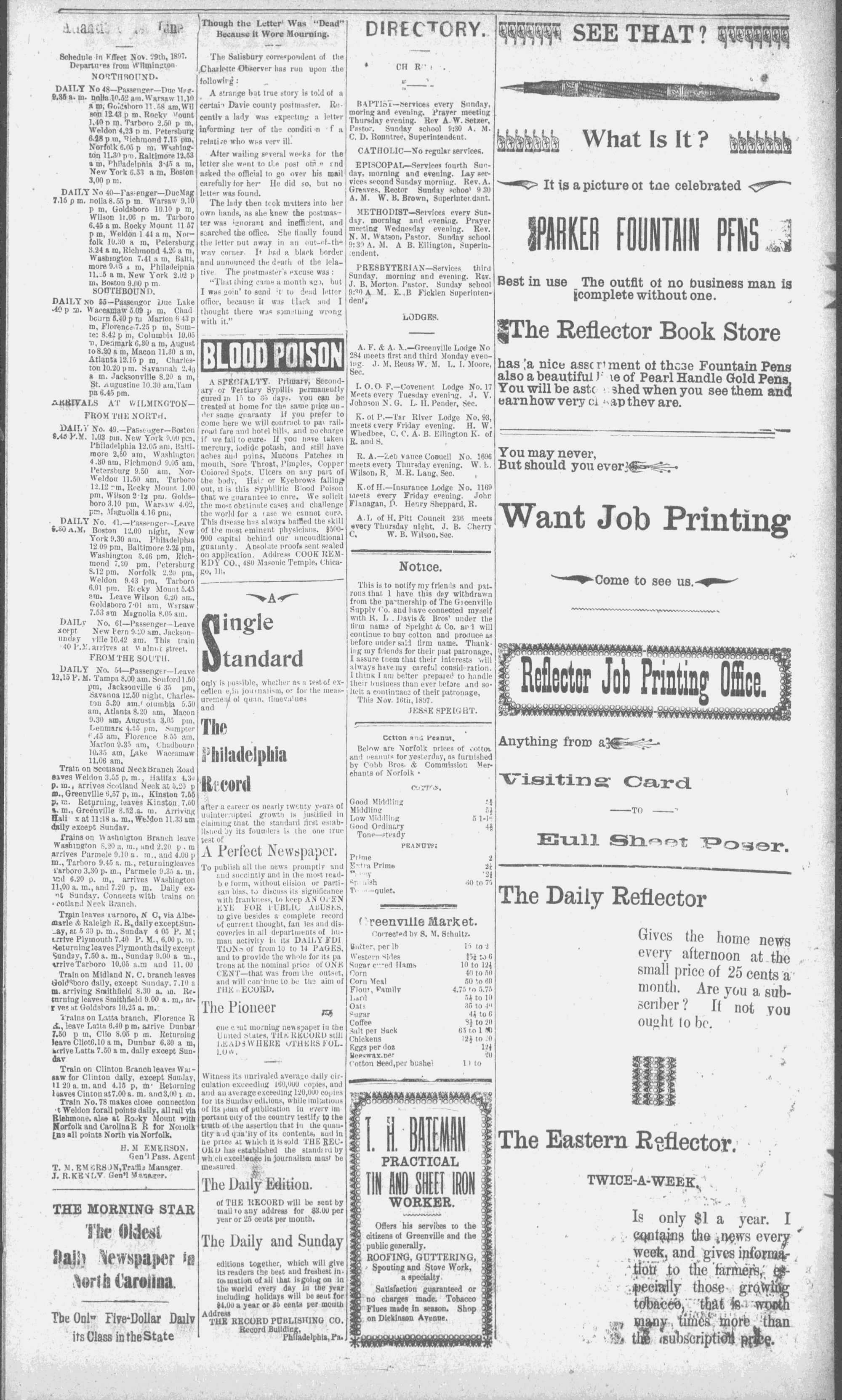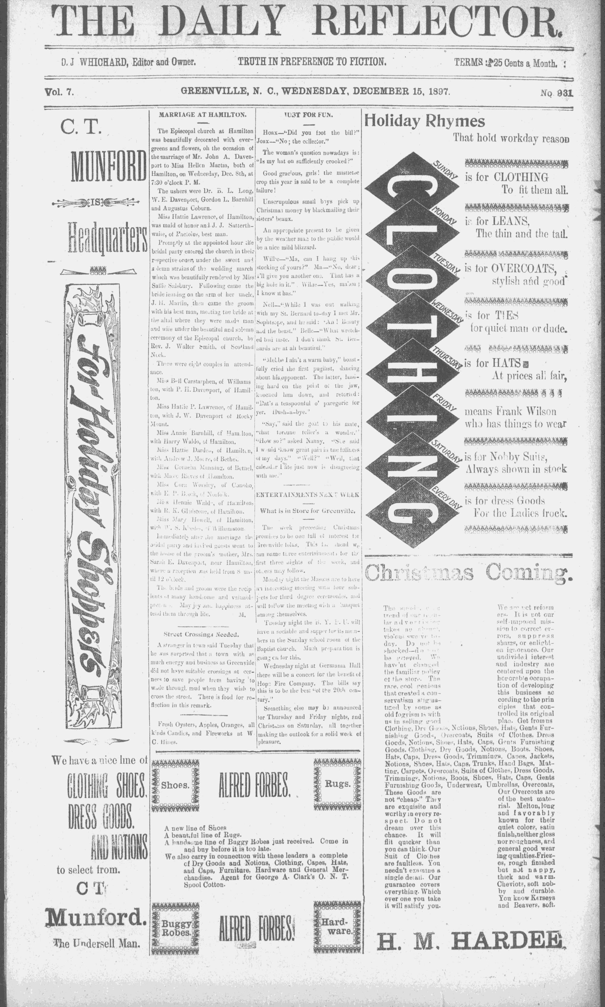 The newspaper was established in 1882, and was originally named the Eastern Reflector. It was founded by Julian Whichard and David Jordan with equipment they purchased from The Greenville Express. On December 10, 1894, it adopted the name The Reflector and began publishing every day. Cox Newspapers acquired The Daily Reflector in 1996. Creator: Daily Reflector (Greenville, N.C.) - December 15, 1897
