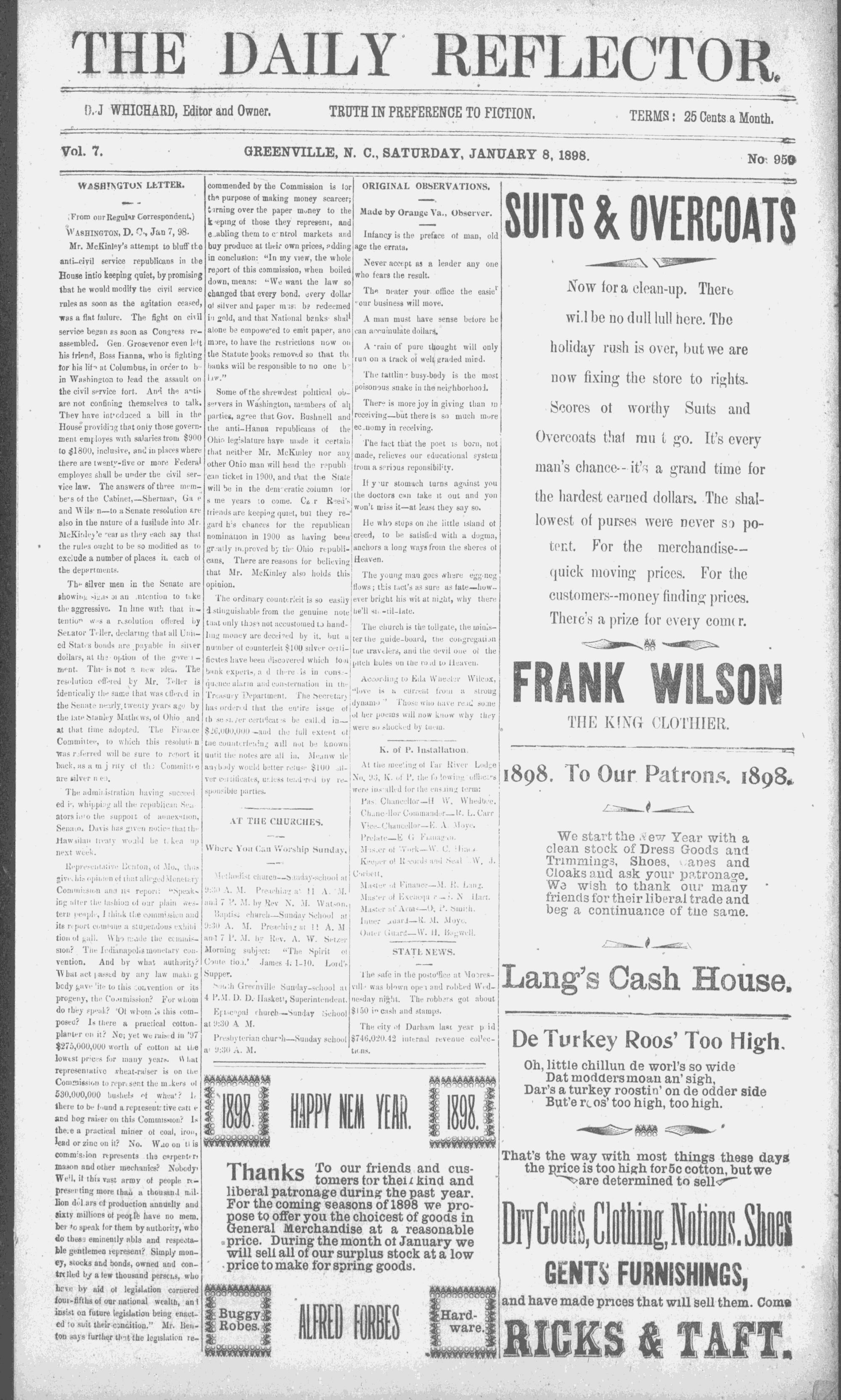 Vol. 7, GREENVILLE, N. C., SATURDAY, JANUARY 8, 1898. No: 958
