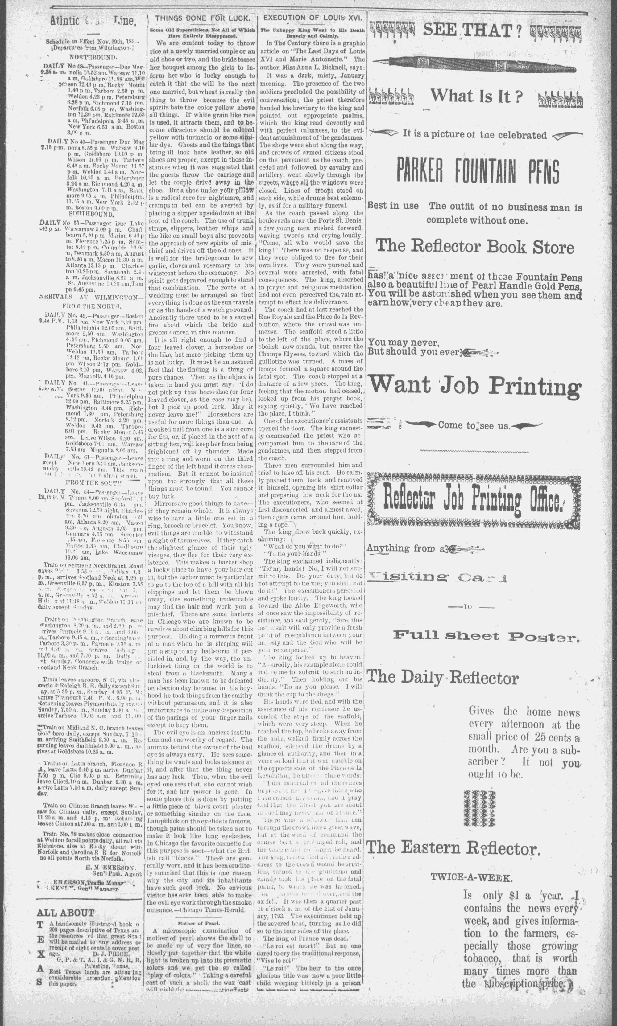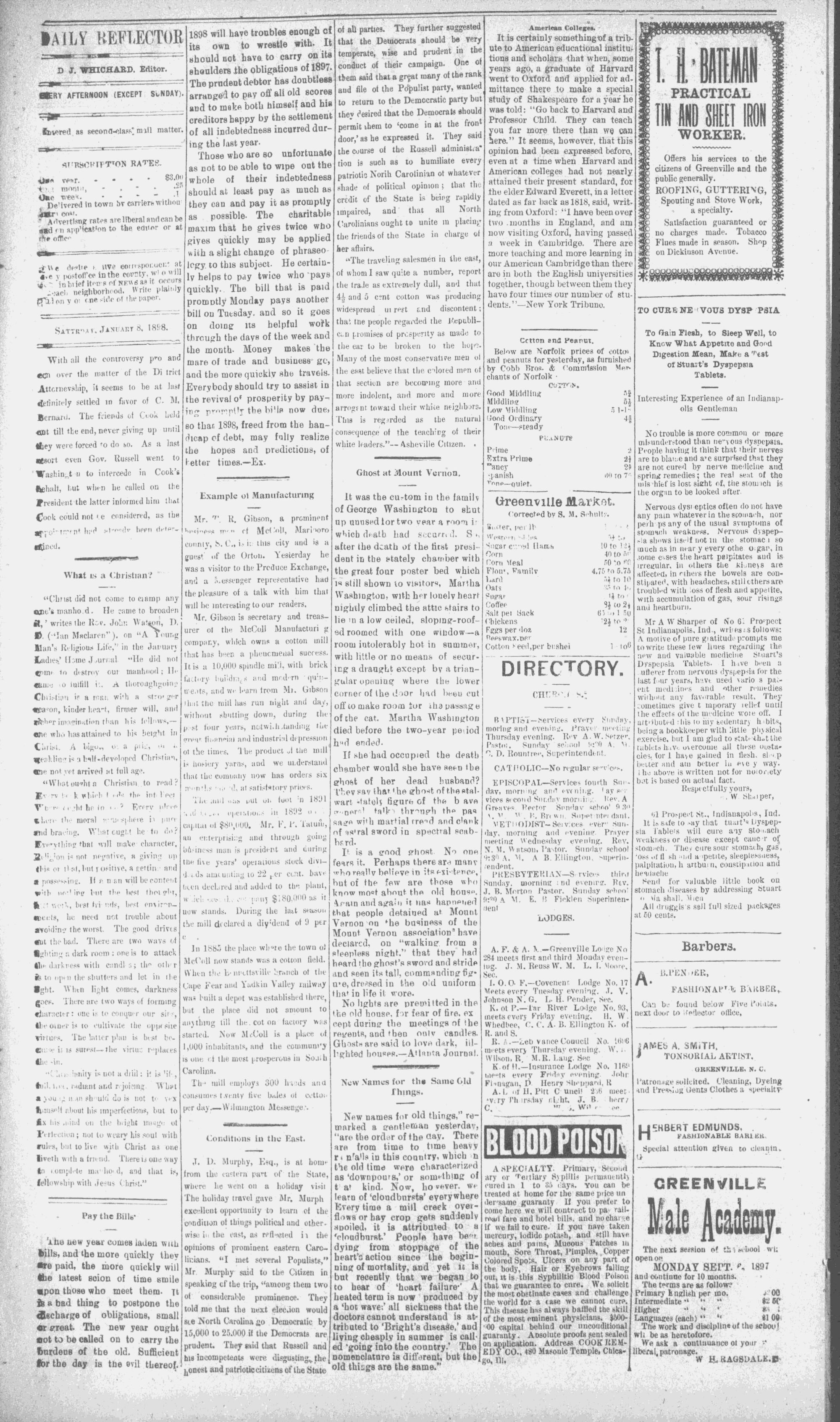 The newspaper was established in 1882, and was originally named the Eastern Reflector. It was founded by Julian Whichard and David Jordan with equipment they purchased from The Greenville Express. On December 10, 1894, it adopted the name The Reflector and began publishing every day. Cox Newspapers acquired The Daily Reflector in 1996. Creator: Daily Reflector (Greenville, N.C.) - January 8, 1898