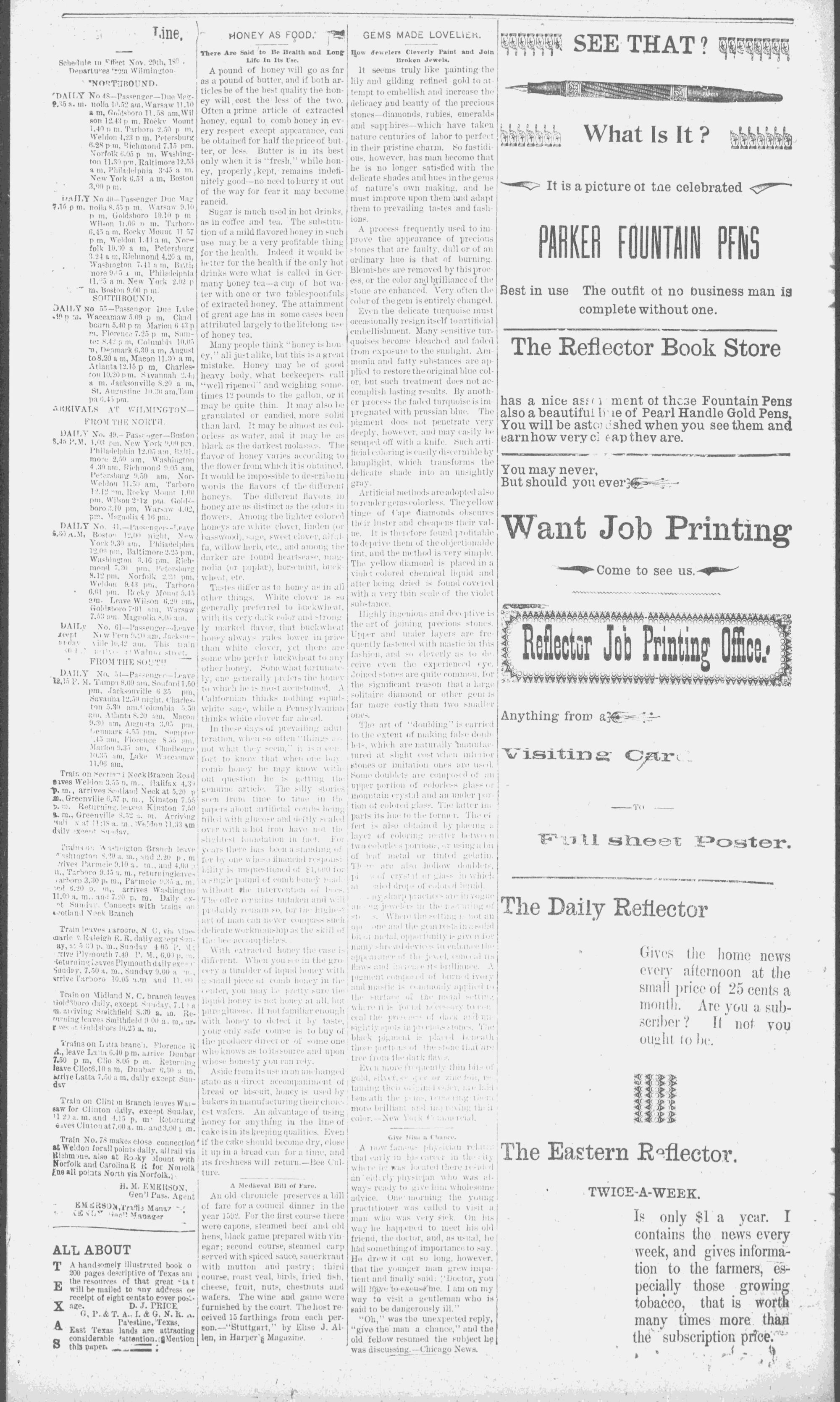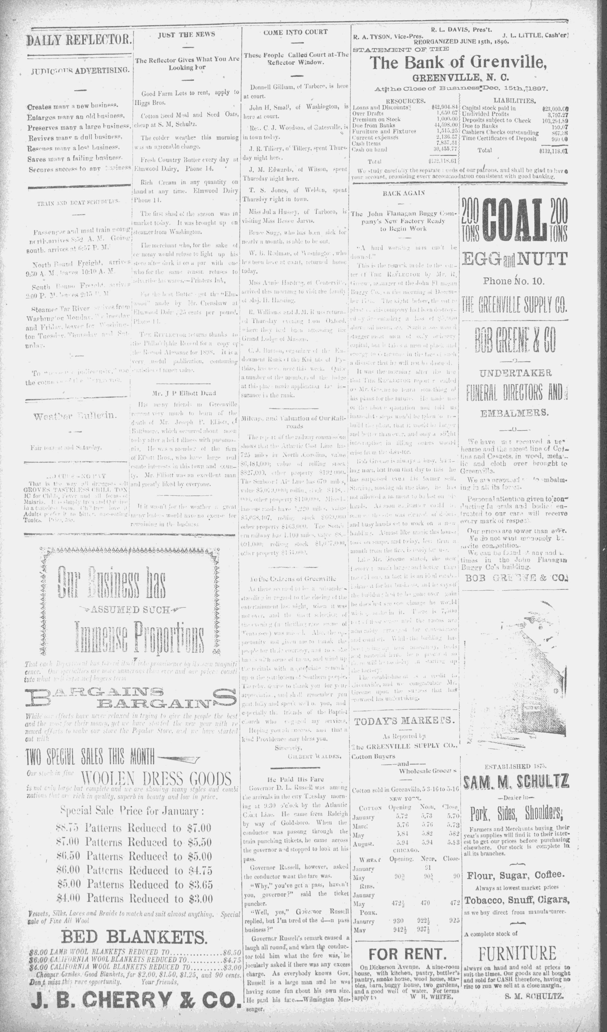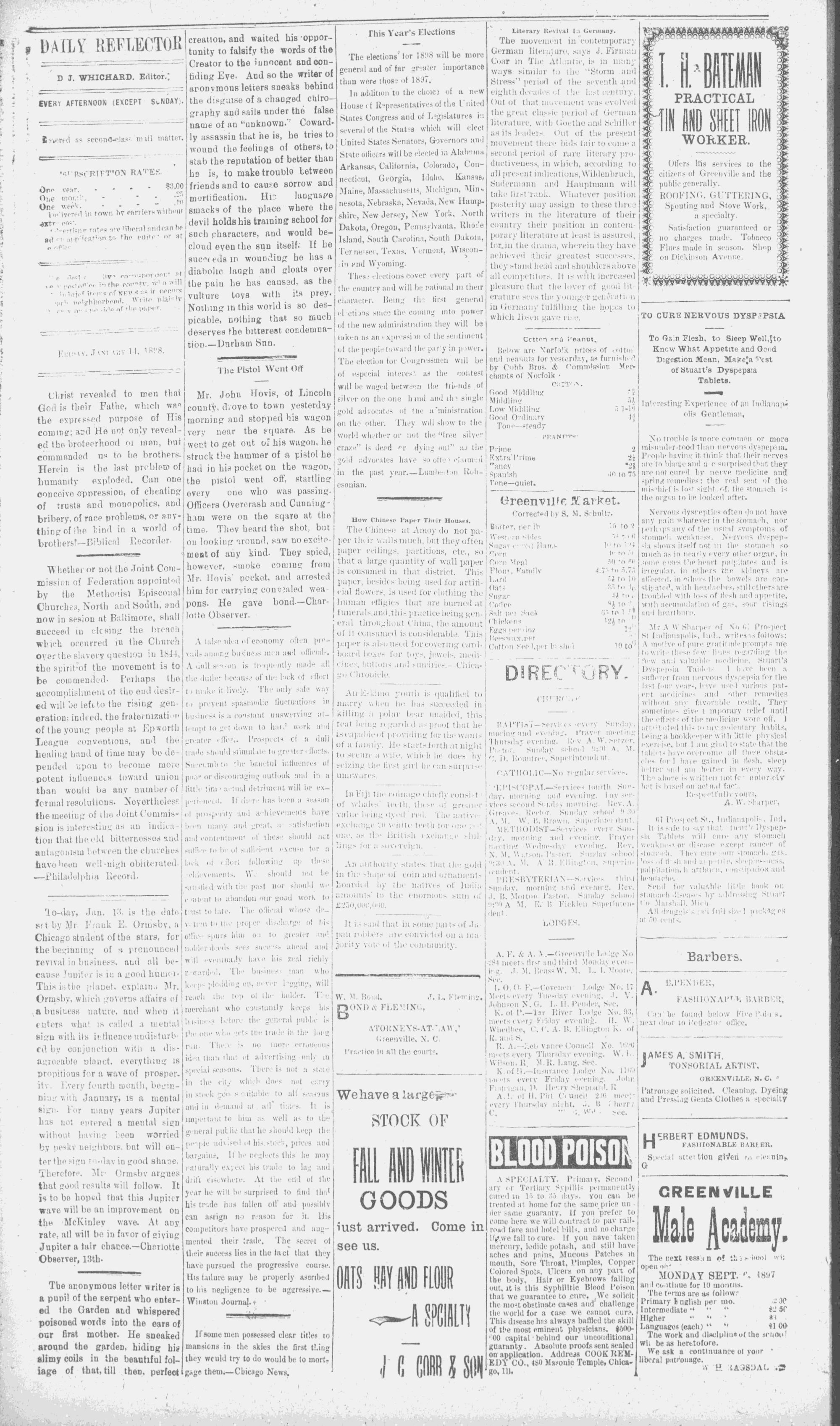 The newspaper was established in 1882, and was originally named the Eastern Reflector. It was founded by Julian Whichard and David Jordan with equipment they purchased from The Greenville Express. On December 10, 1894, it adopted the name The Reflector and began publishing every day. Cox Newspapers acquired The Daily Reflector in 1996. Creator: Daily Reflector (Greenville, N.C.) - January 14, 1898