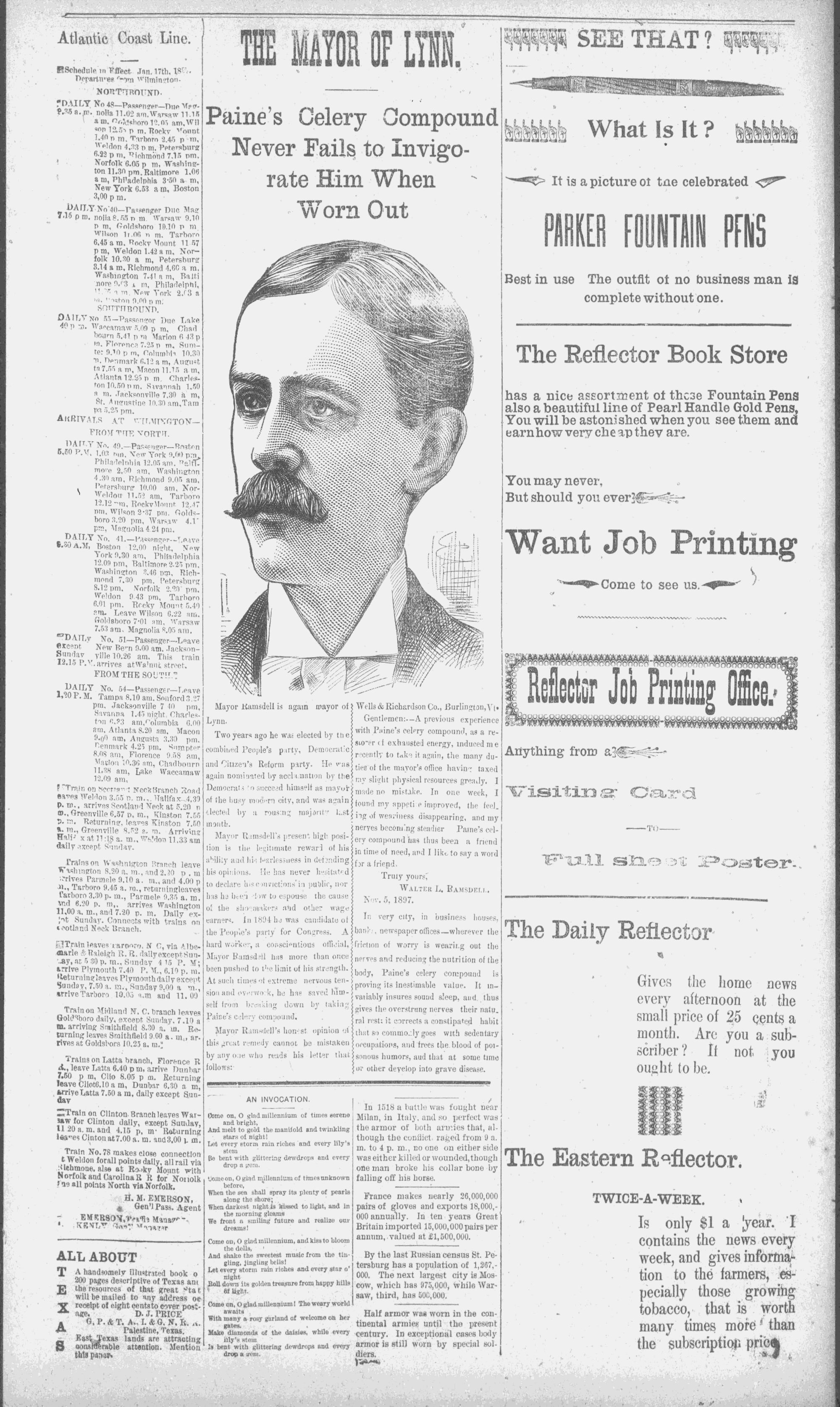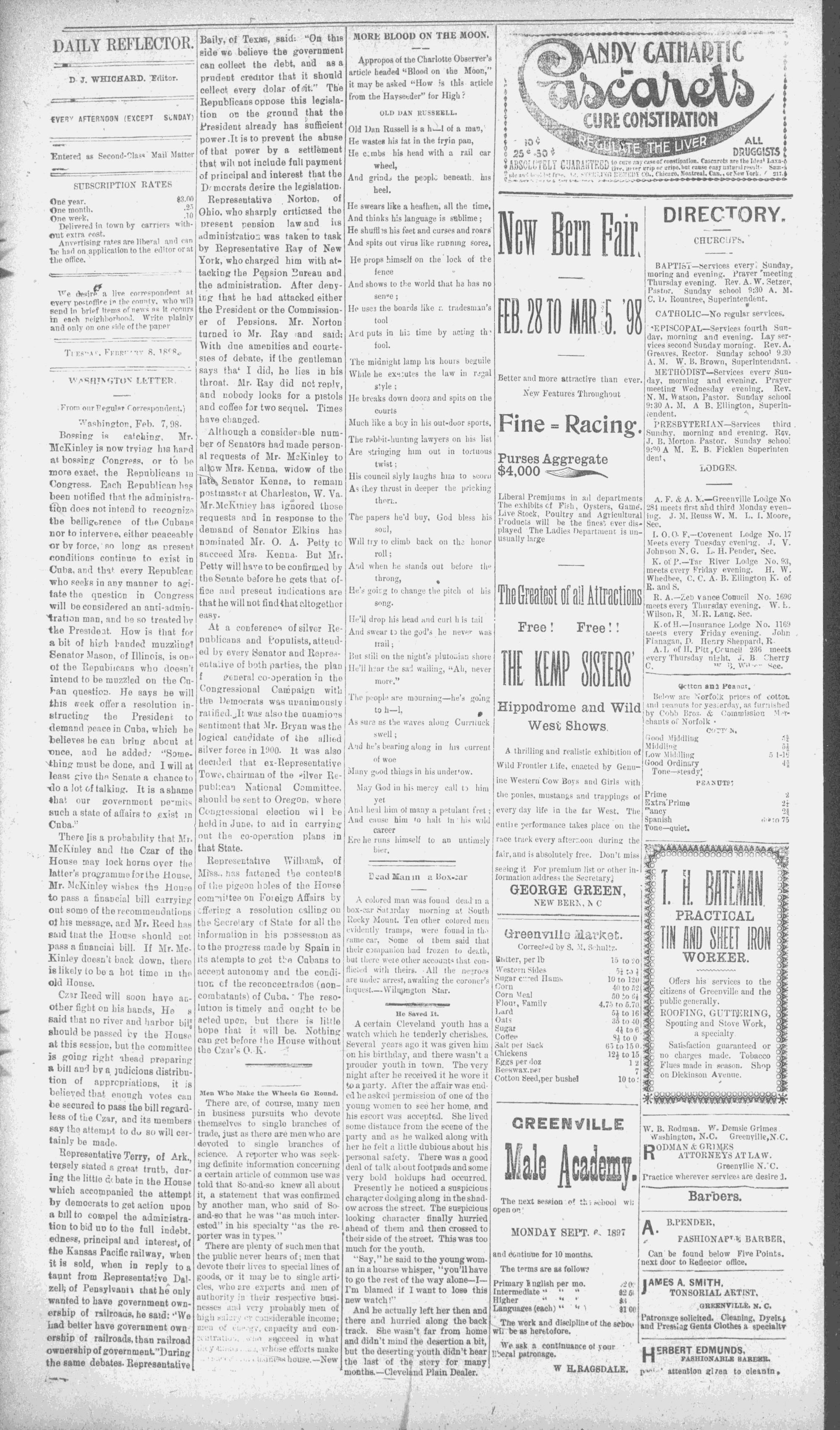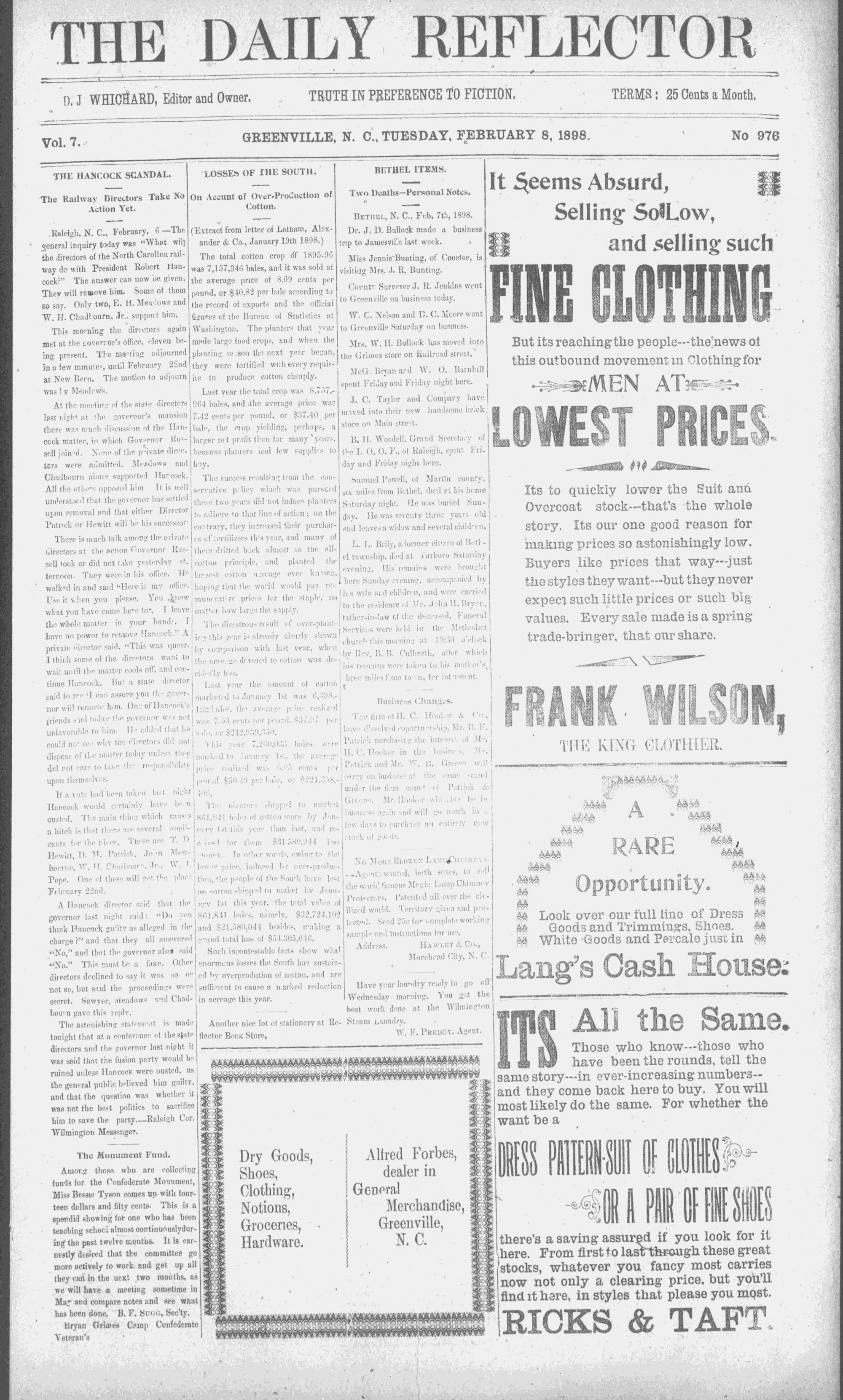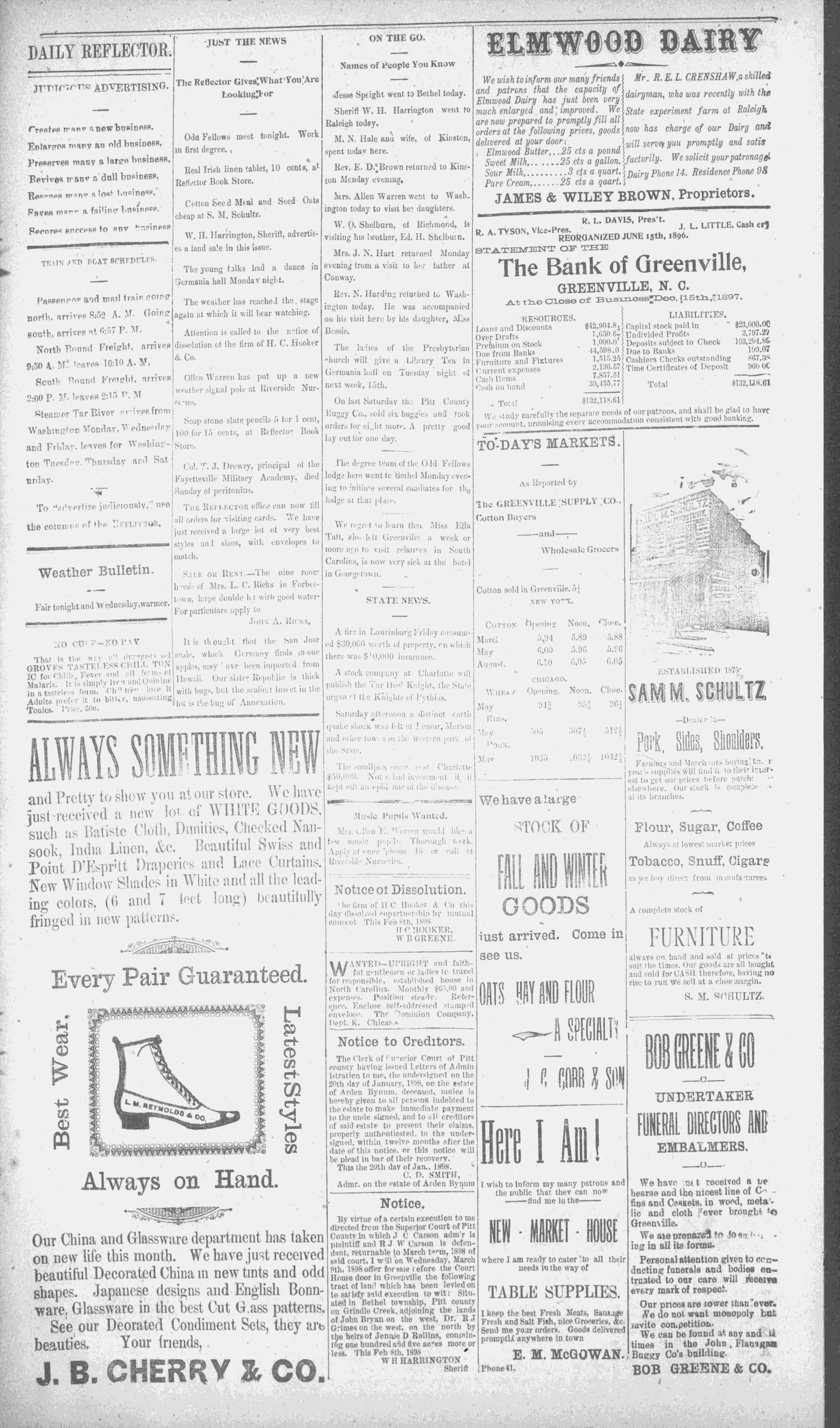 The newspaper was established in 1882, and was originally named the Eastern Reflector. It was founded by Julian Whichard and David Jordan with equipment they purchased from The Greenville Express. On December 10, 1894, it adopted the name The Reflector and began publishing every day. Cox Newspapers acquired The Daily Reflector in 1996. Creator: Daily Reflector (Greenville, N.C.) - February 8, 1898