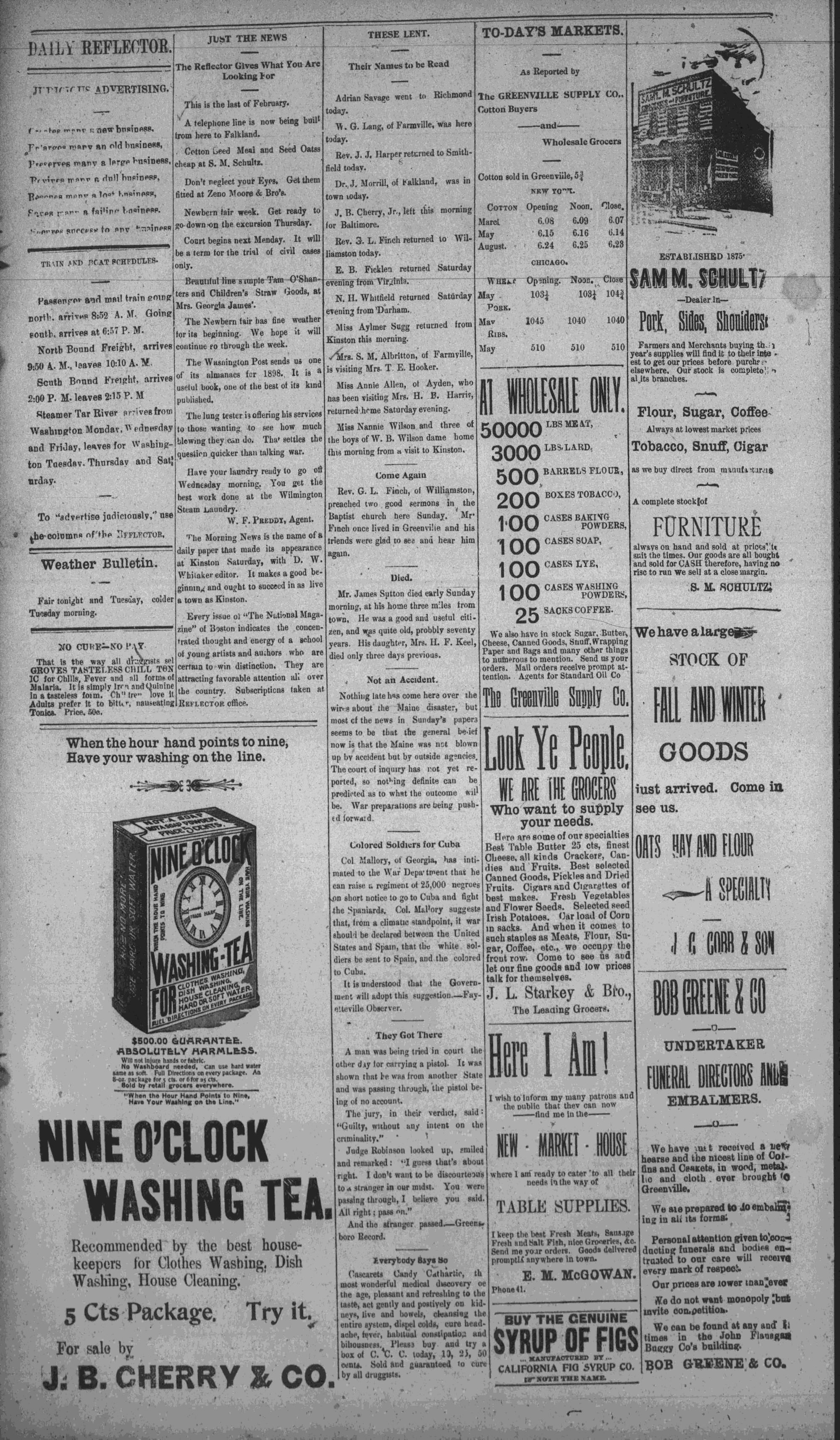 The newspaper was established in 1882, and was originally named the Eastern Reflector. It was founded by Julian Whichard and David Jordan with equipment they purchased from The Greenville Express. On December 10, 1894, it adopted the name The Reflector and began publishing every day. Cox Newspapers acquired The Daily Reflector in 1996. Creator: Daily Reflector (Greenville, N.C.) - February 28, 1898