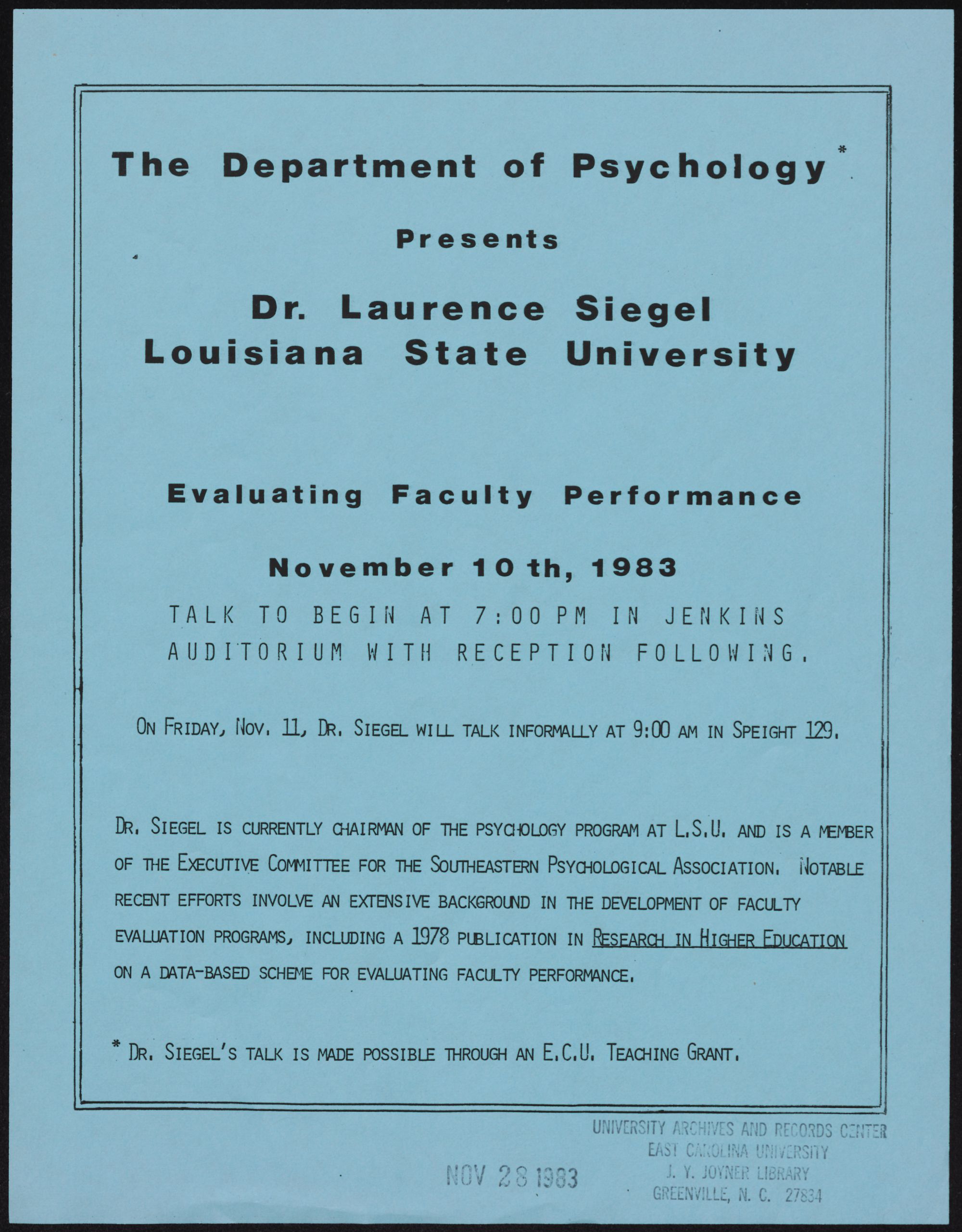 On Fripay, Nov, 11, DR, SIEGEL WILL TALK INFORMALLY AT 9:00 am IN SPEIGHT 129,