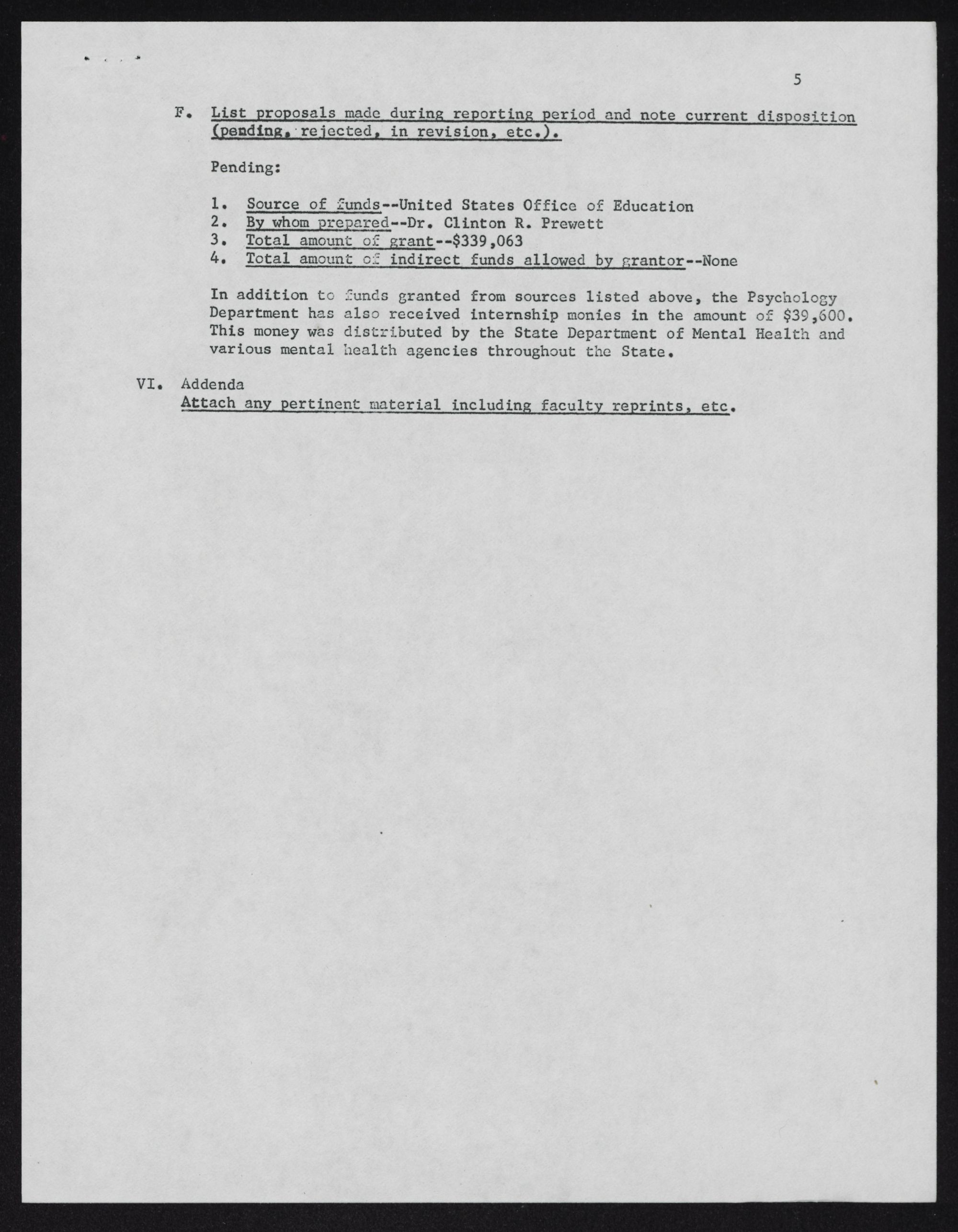 Department has also received internship monies in the amount of $39,600,