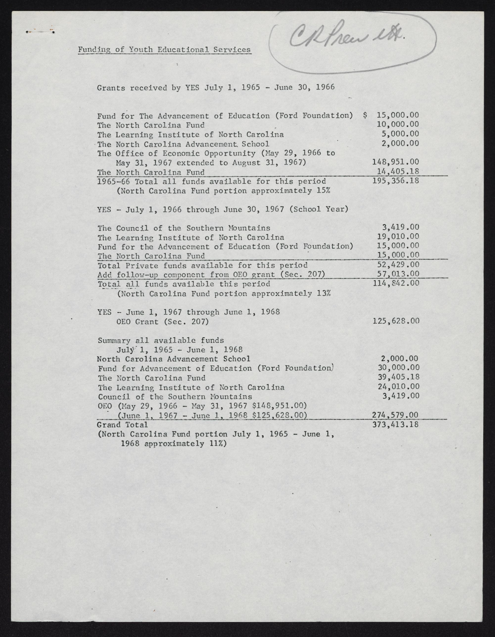 (North Carolina Fund portion July 1, 1965 - June l,