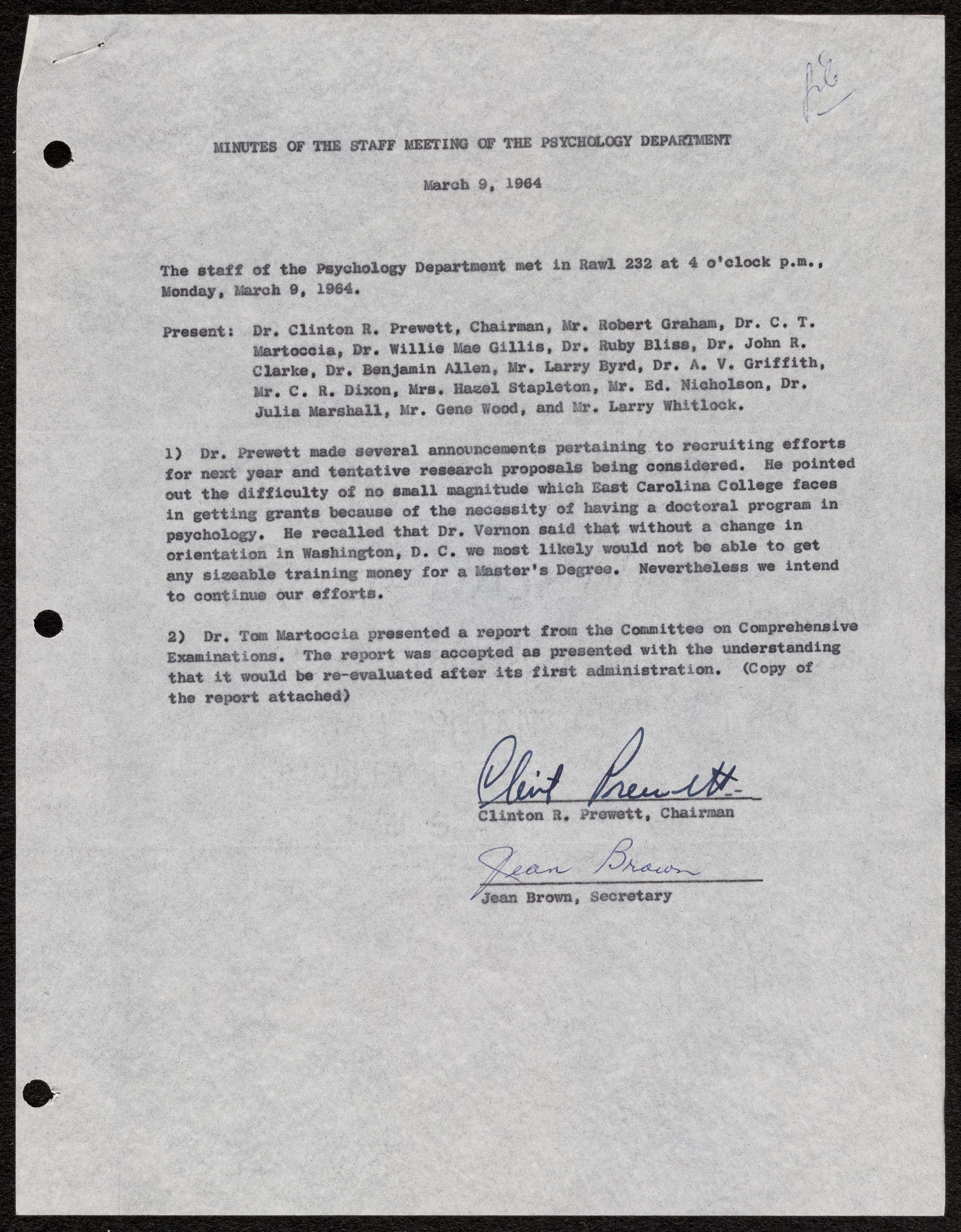 Faculty meeting minutes from the Records of the Department of Psychology (UA25-11) - March 9, 1964