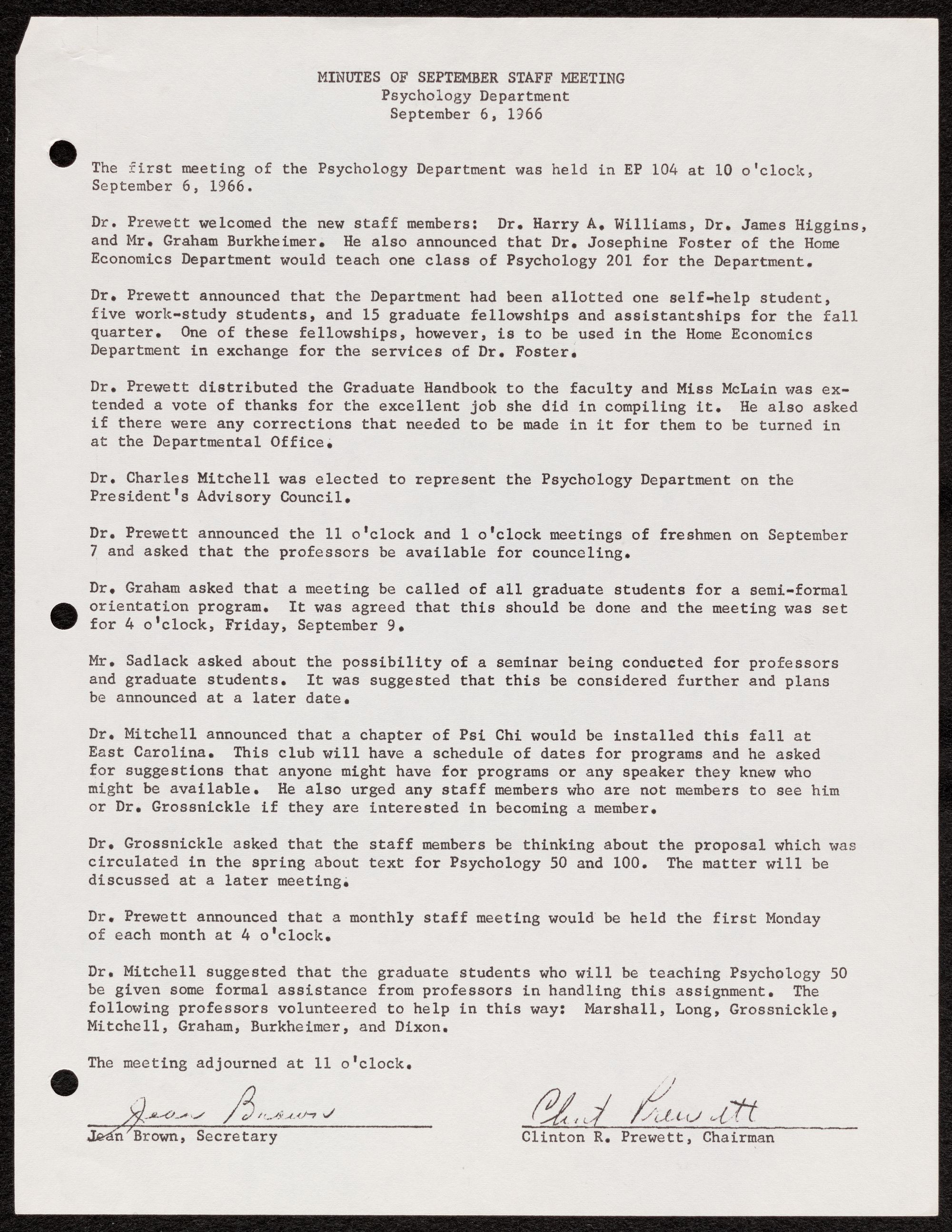 The first meeting of the Psychology Department was held in EP 104 at 10 o'clock,