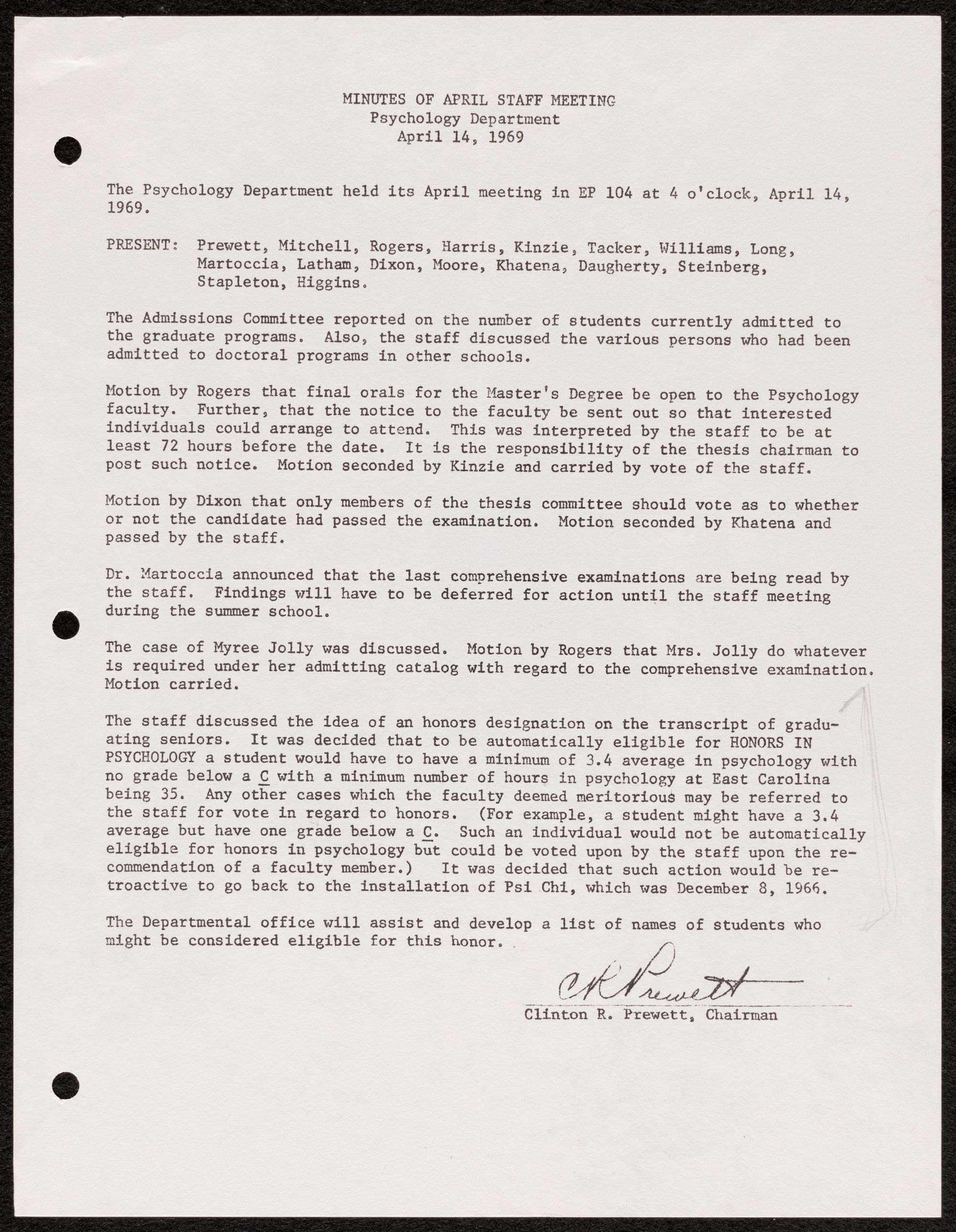 Motion by Rogers that final orals for the Master's Degree be open to the Psychology