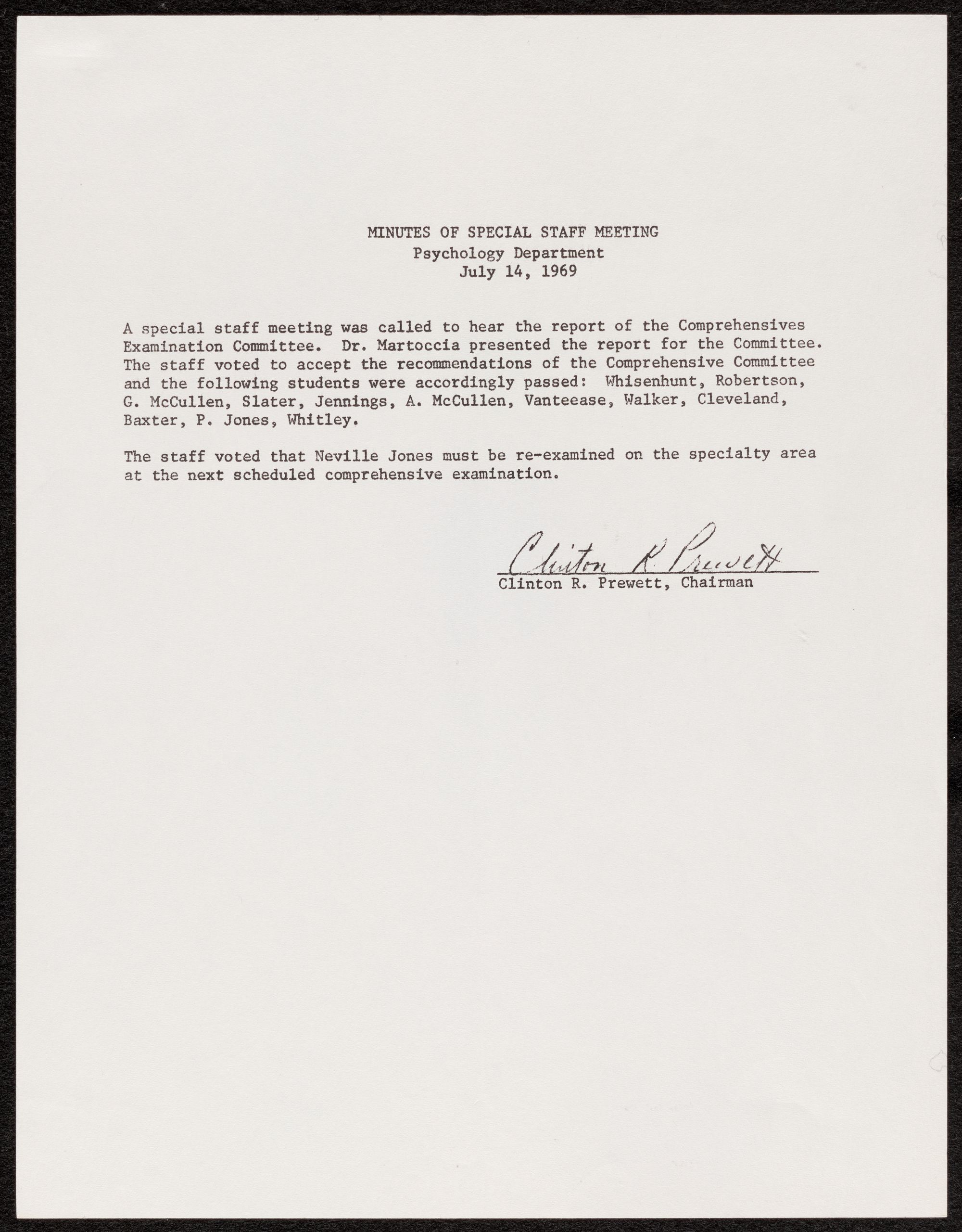 A special staff meeting was called to hear the report of the Comprehensives