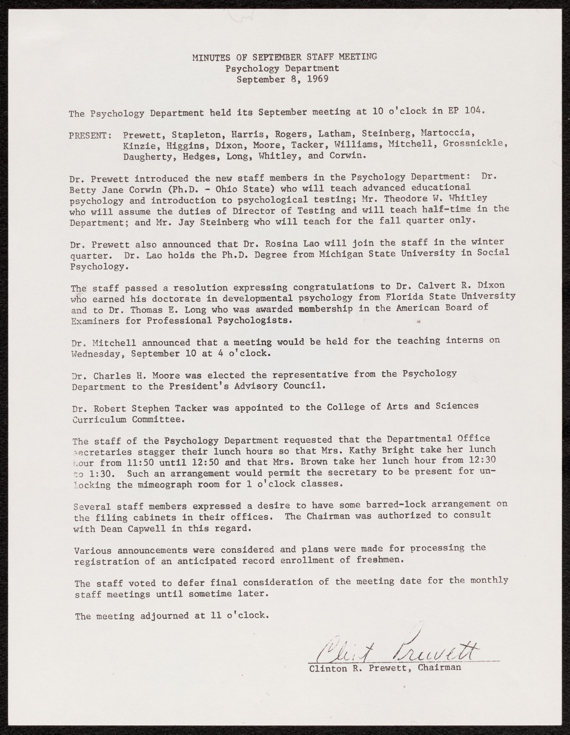 The staff of the Psychology Department requested that the Departmental Office