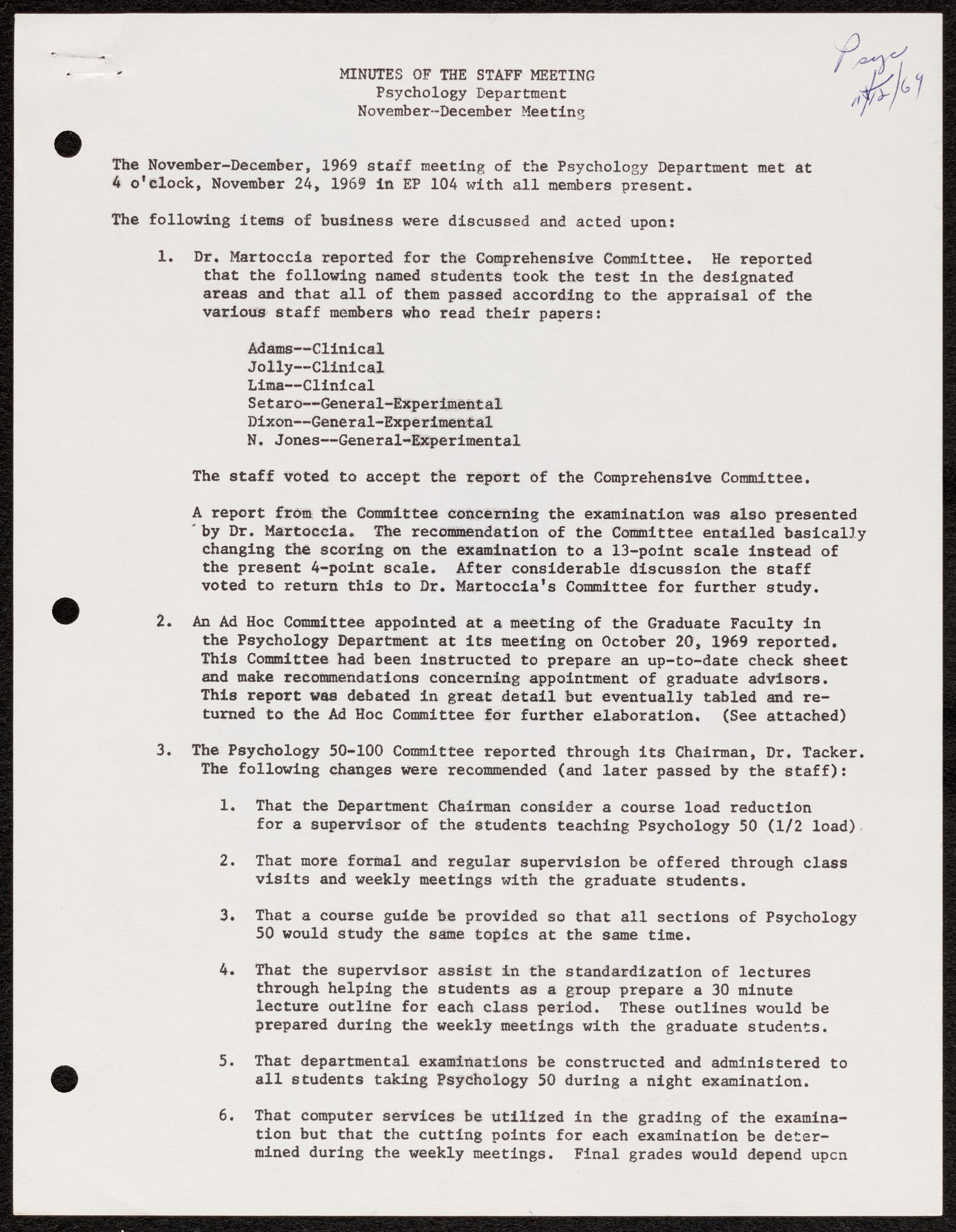 The November-December, 1969 statf meeting of the Psychology Department met at