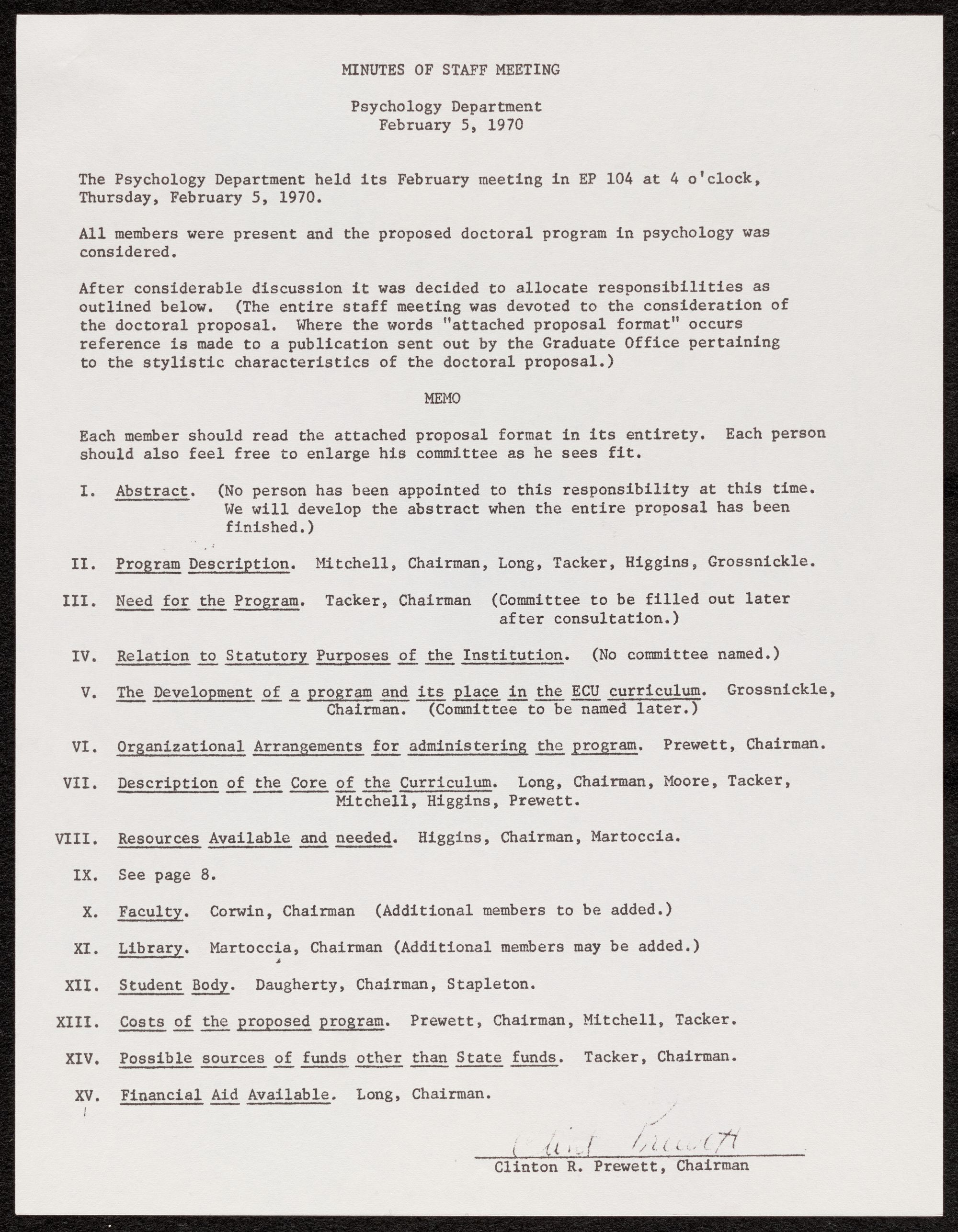 VI. Organizational Arrangements for administering the program. Prewett, Chairman.