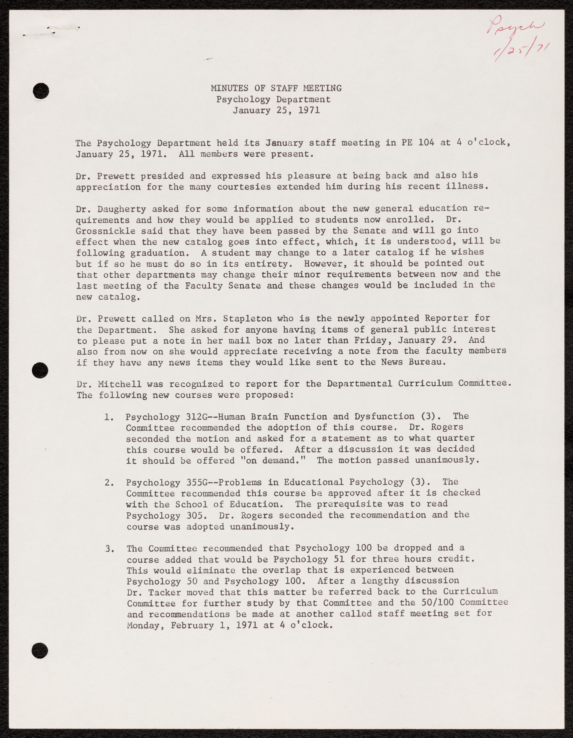 The Psychology Department held its January staff meeting in PE 104 at 4 o'clock,